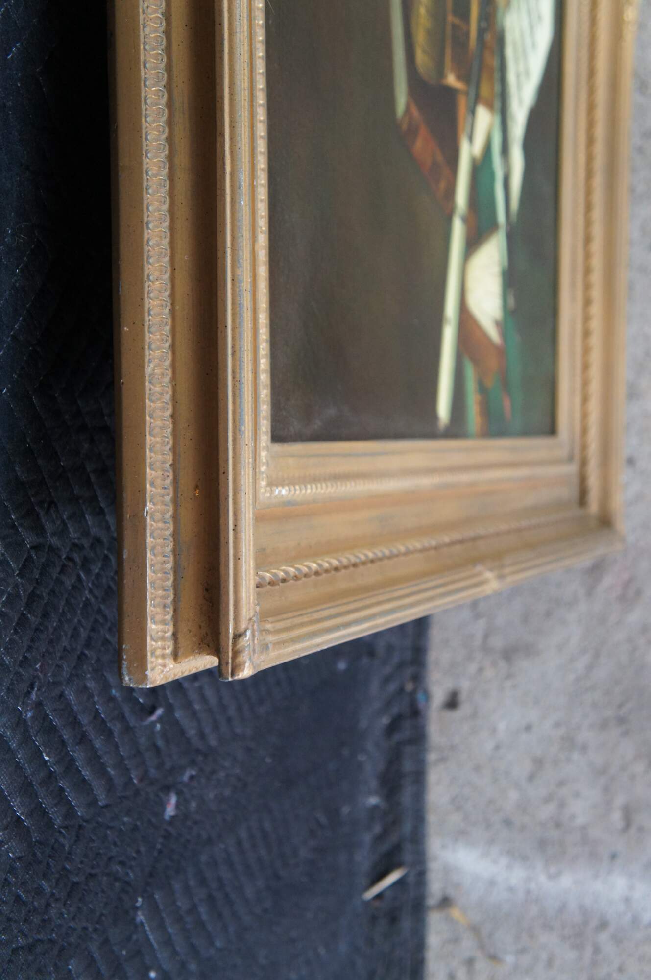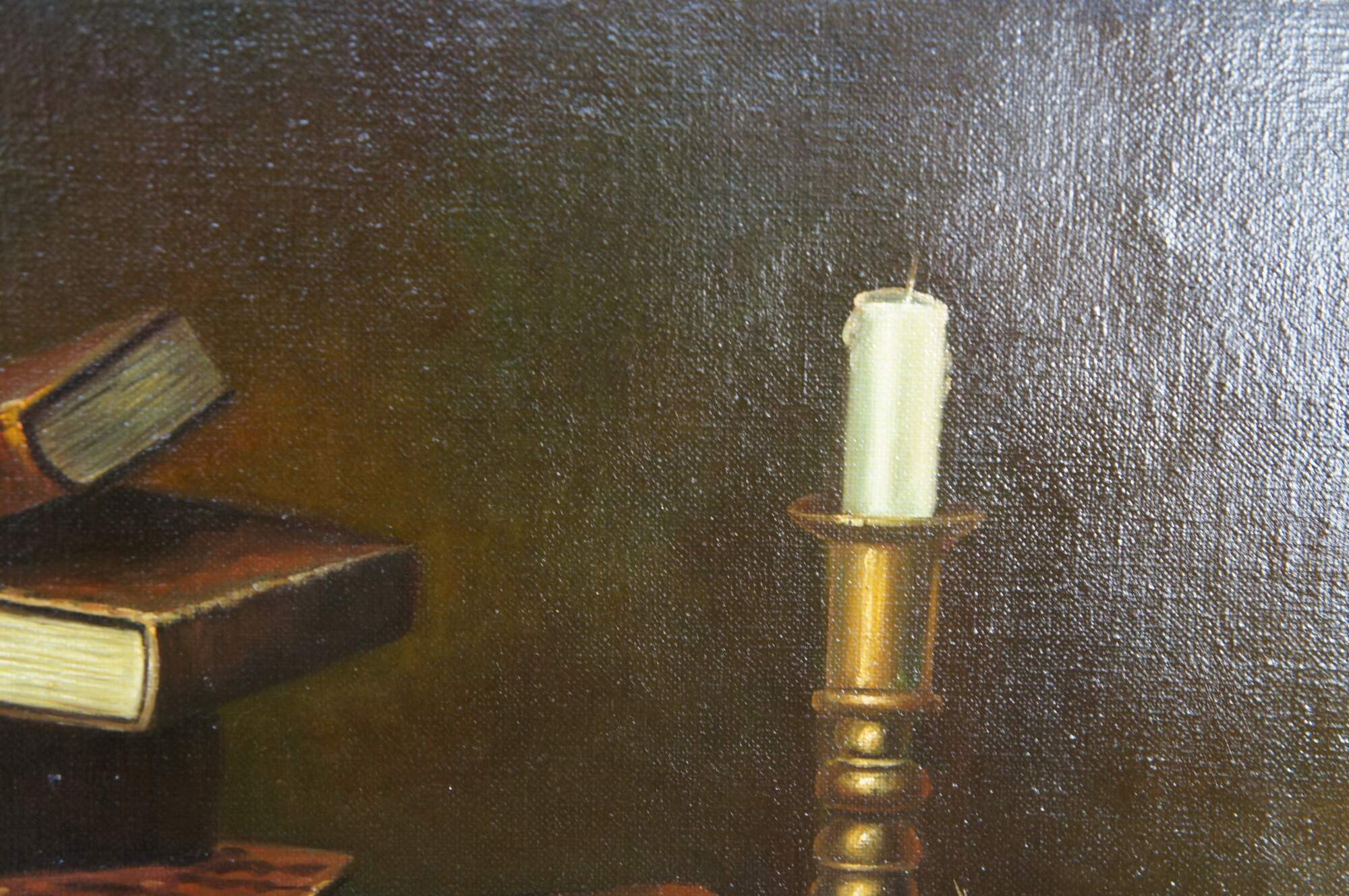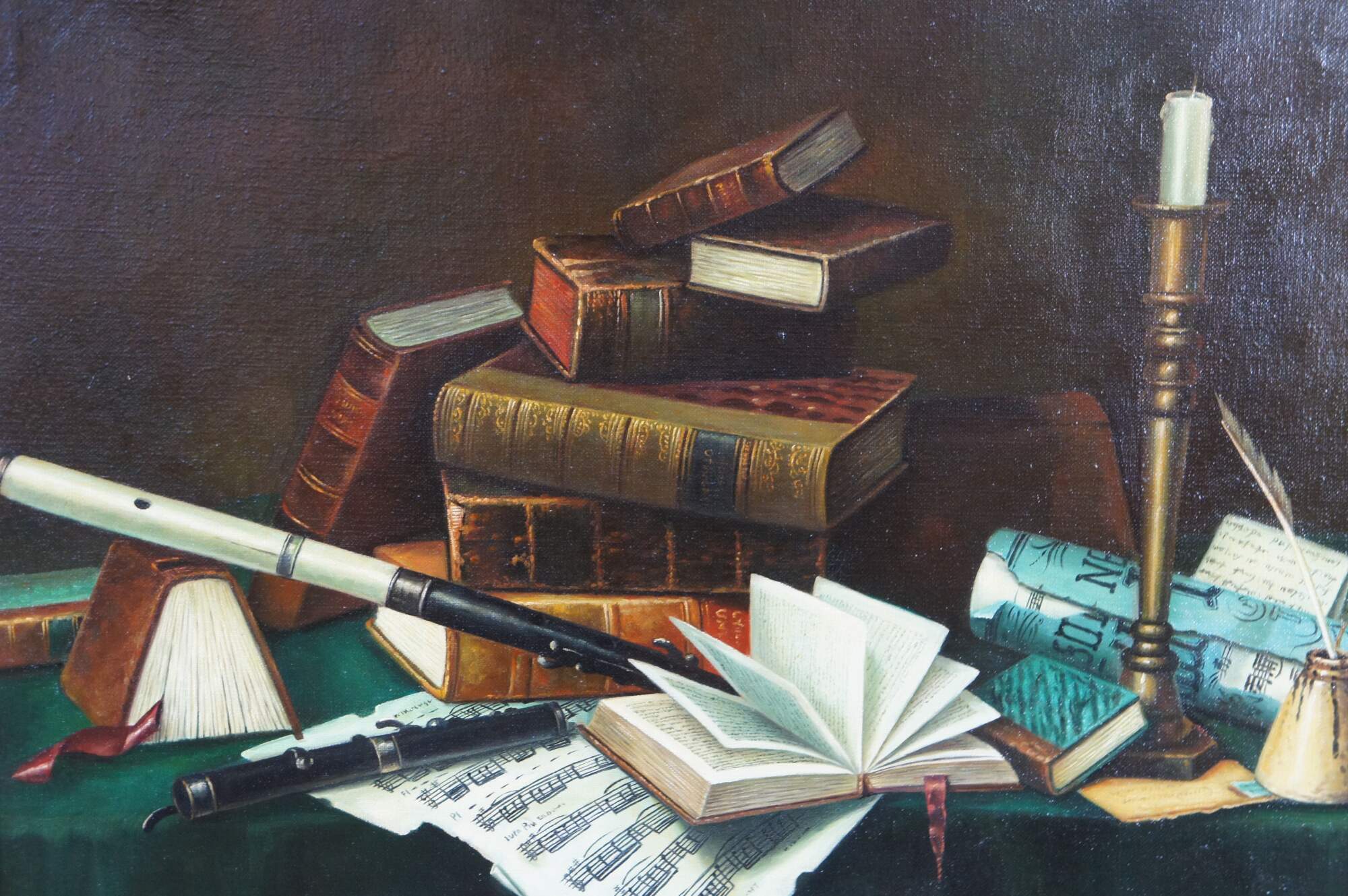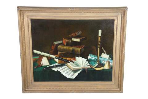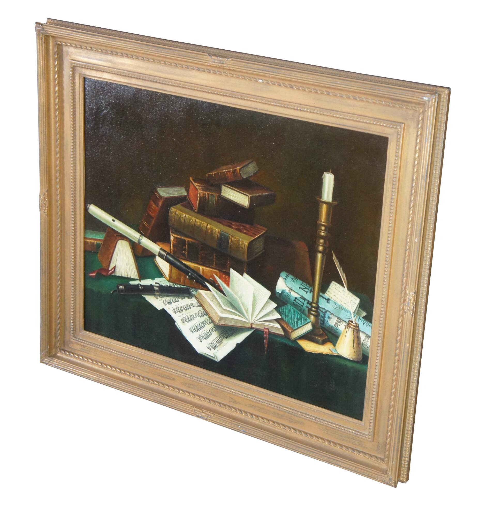 Late 20th century oil painting on canvas after Music and Literature by William Michael Harnett. Depicts a still life tableau on a cloth covered table featuring stacks of books, sheet music, candle, inkwell and wind instrument. Molded frame with gold finish, beveled with beaded / rope twist details.