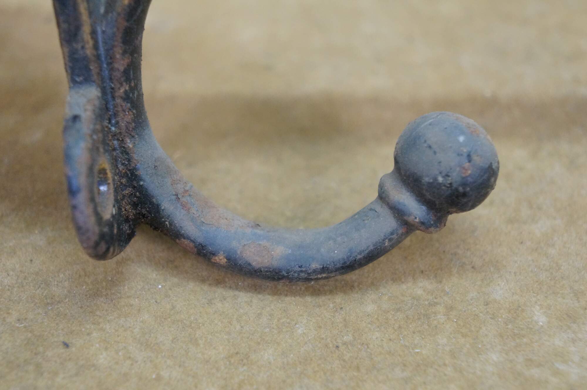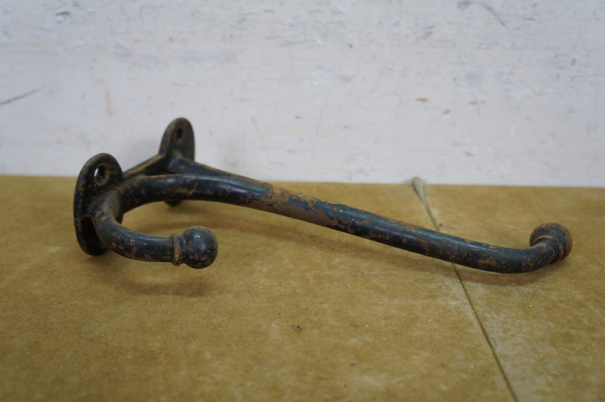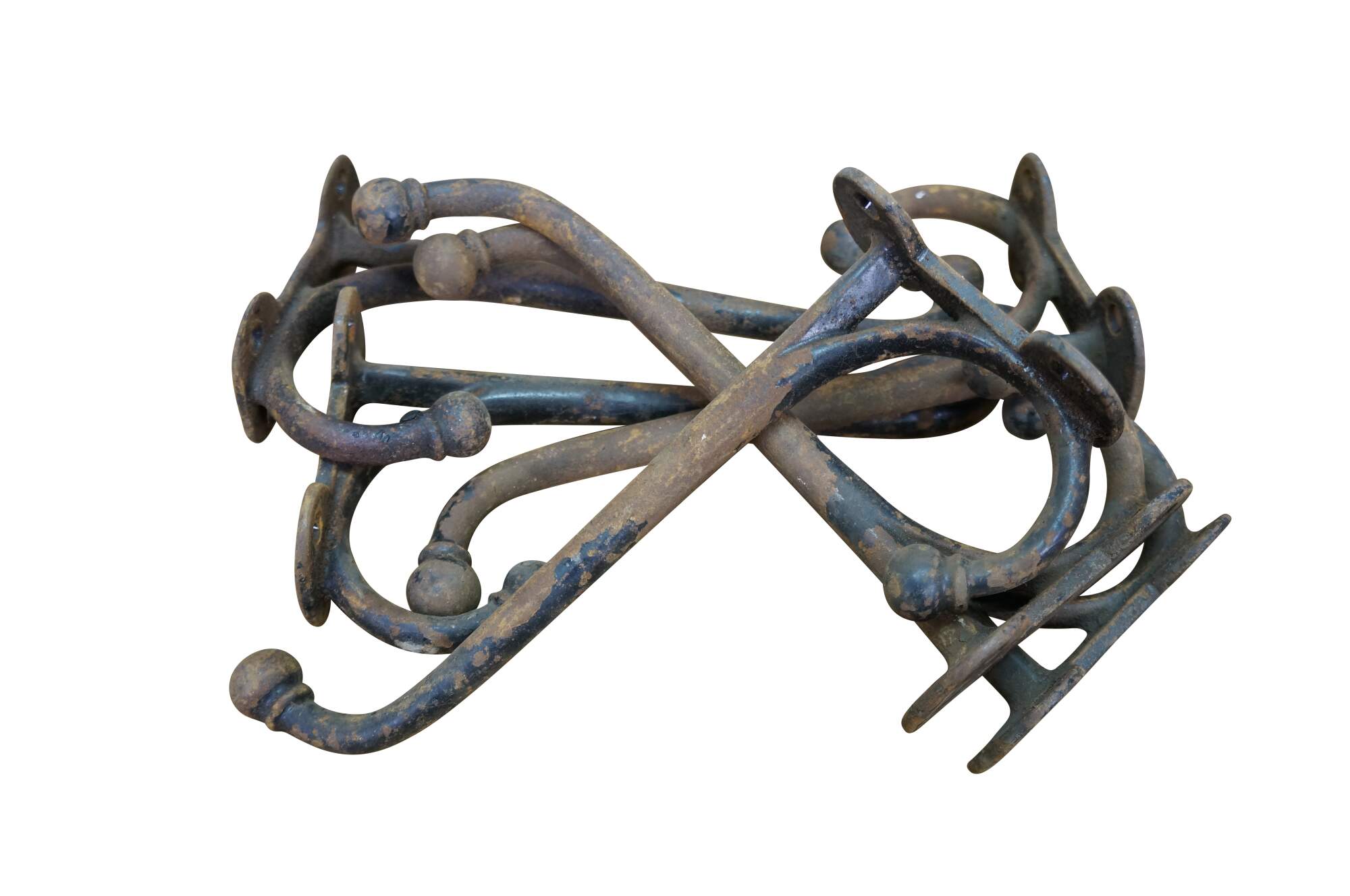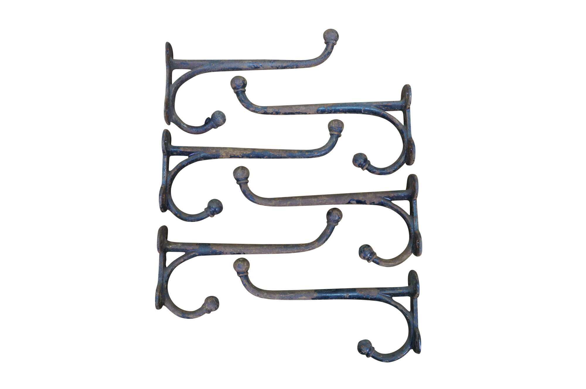 Six antique cast iron two prong barn harness / tack / coat / hat hooks, used in barns to hang saddles, bridles, or heavy coats.
