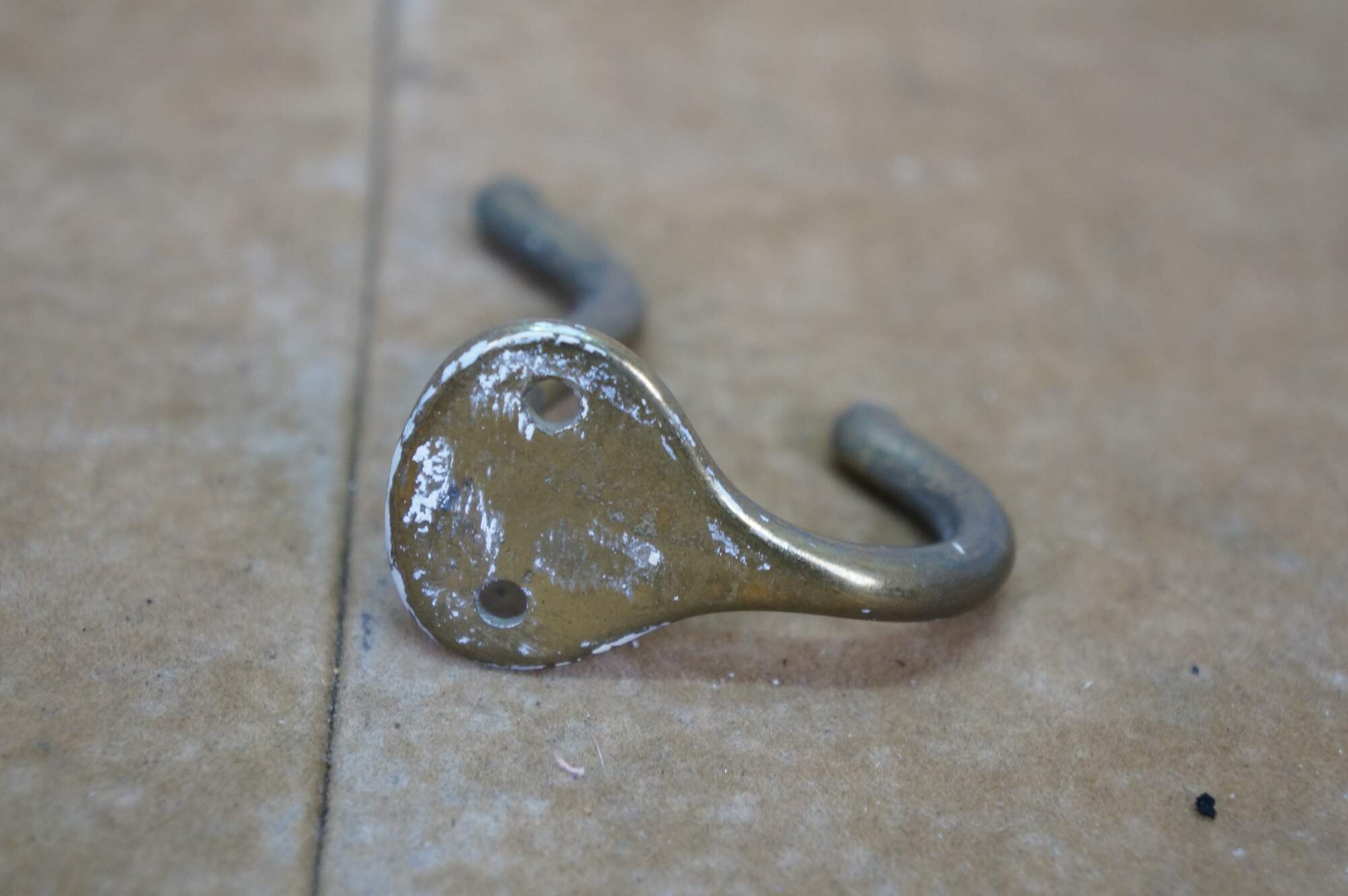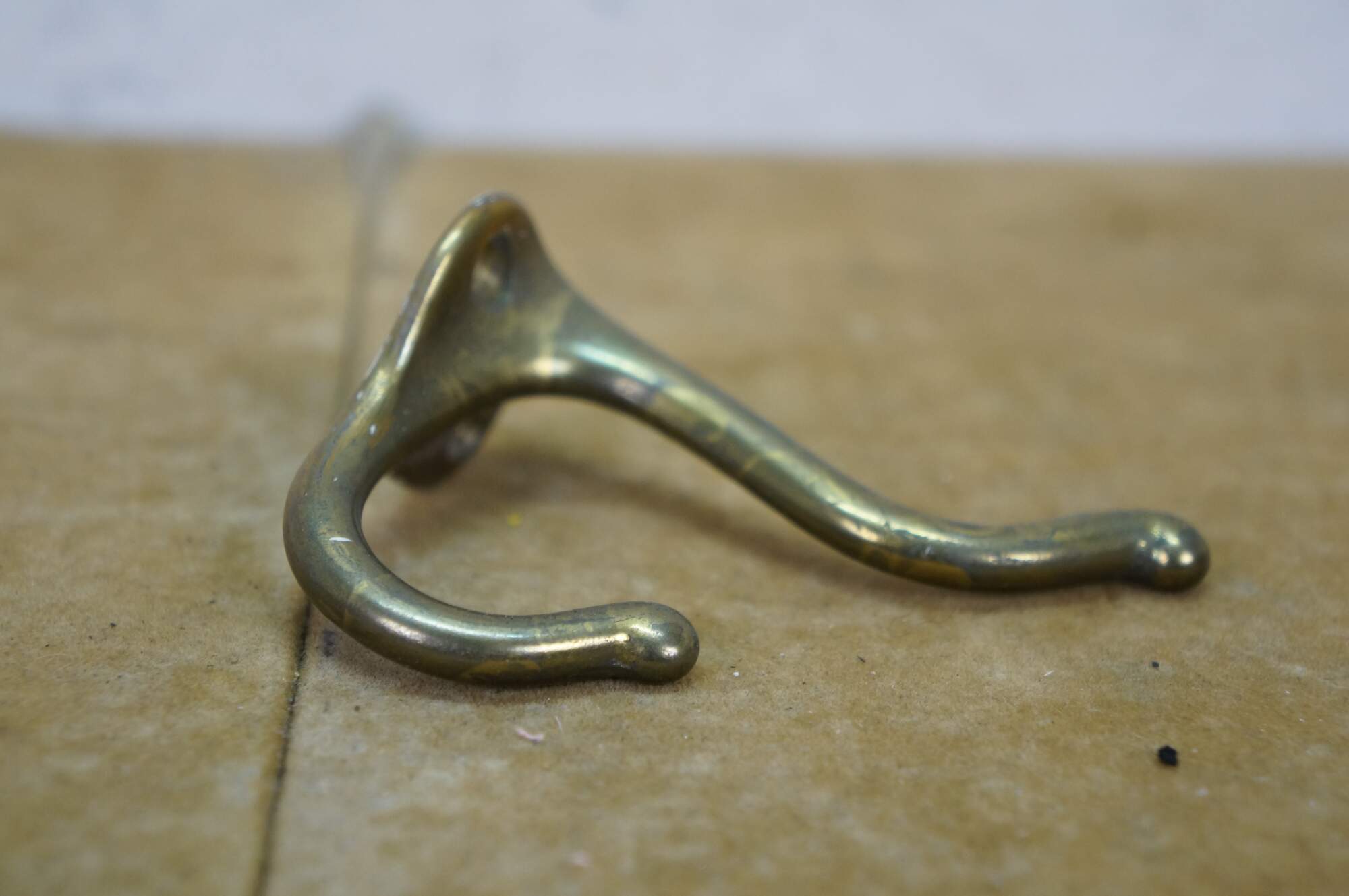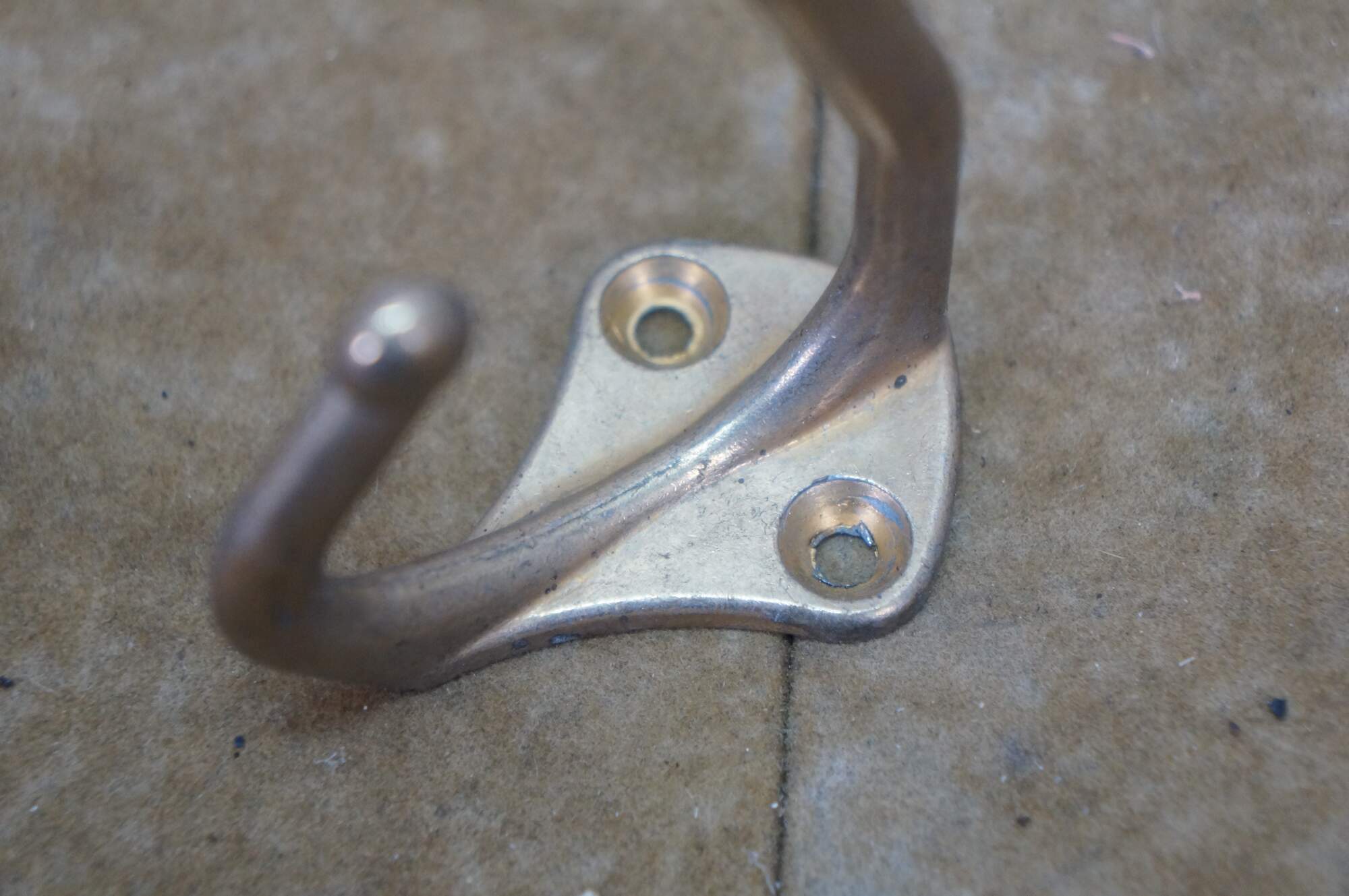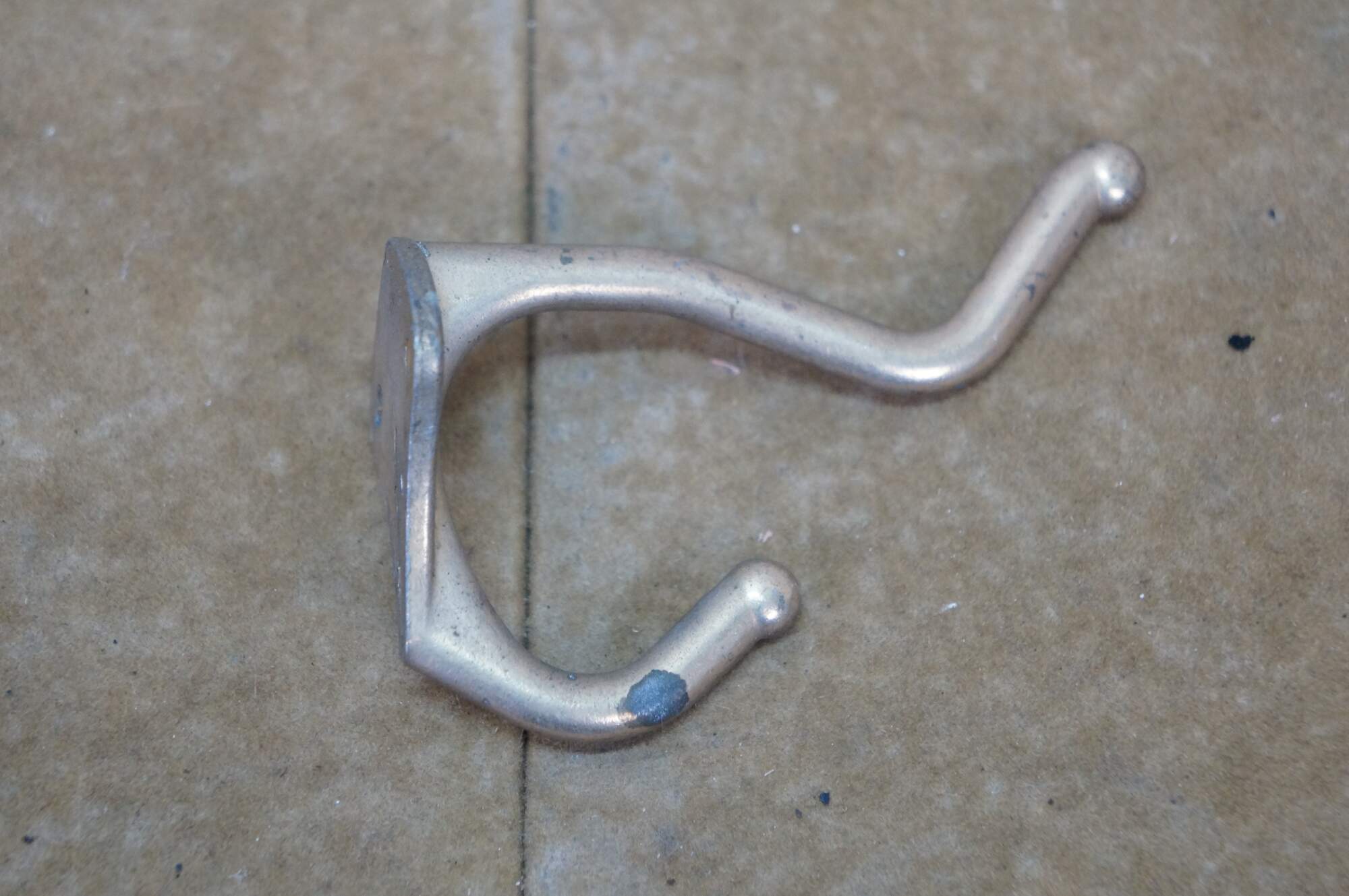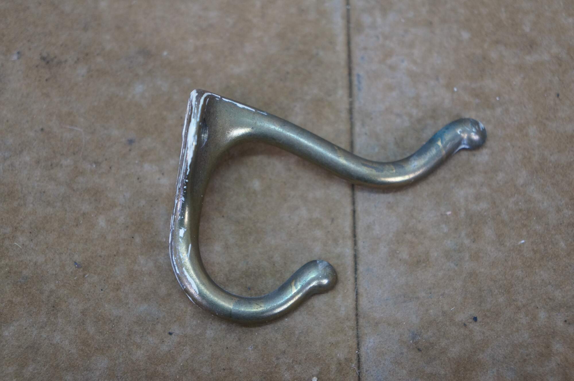 Five antique cast brass double prong coat / hat rack hooks.