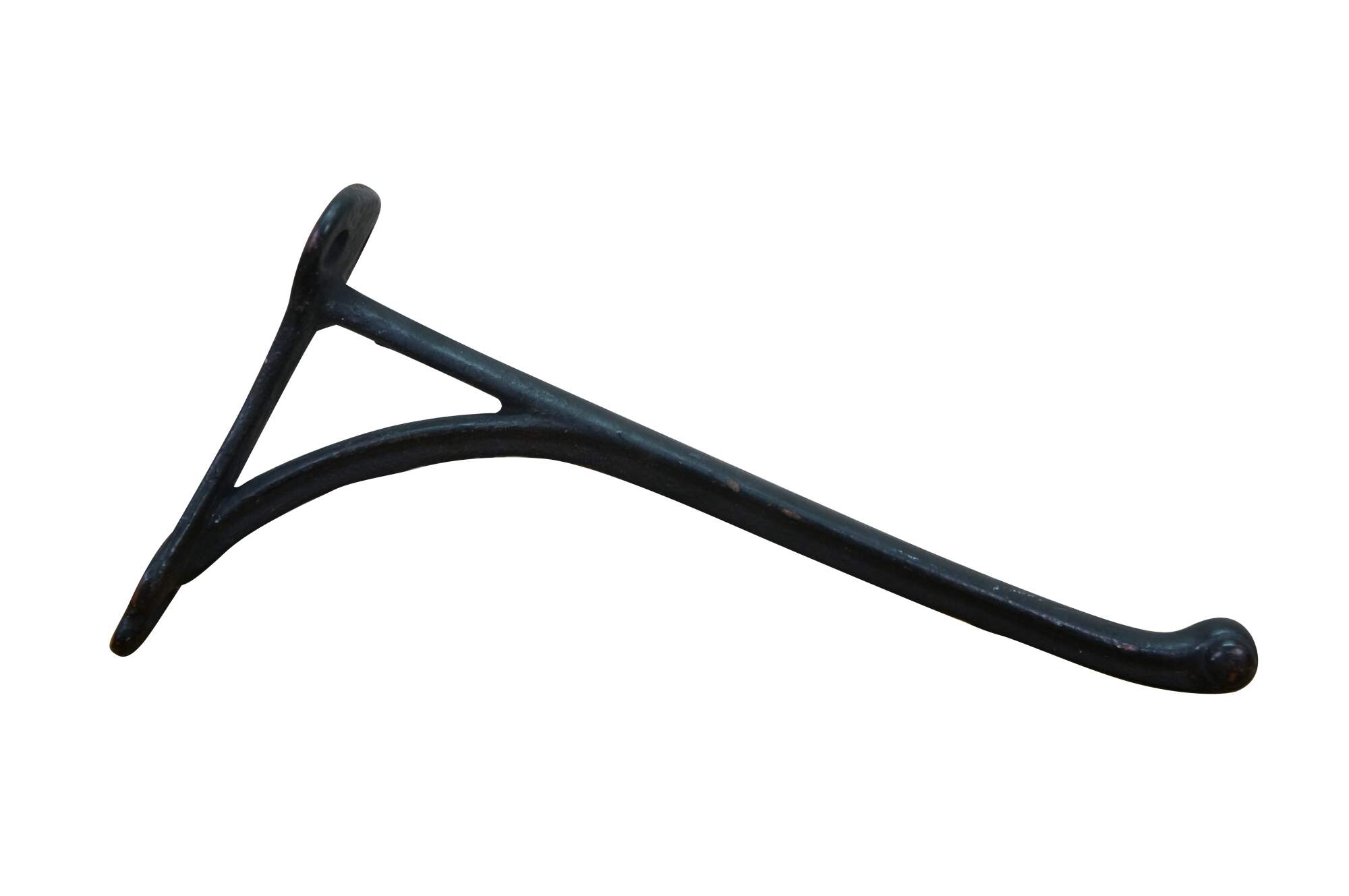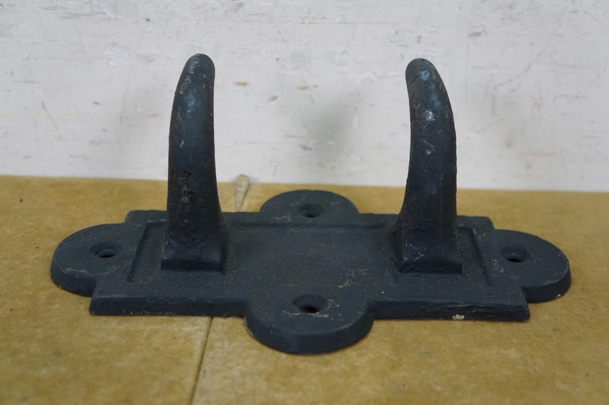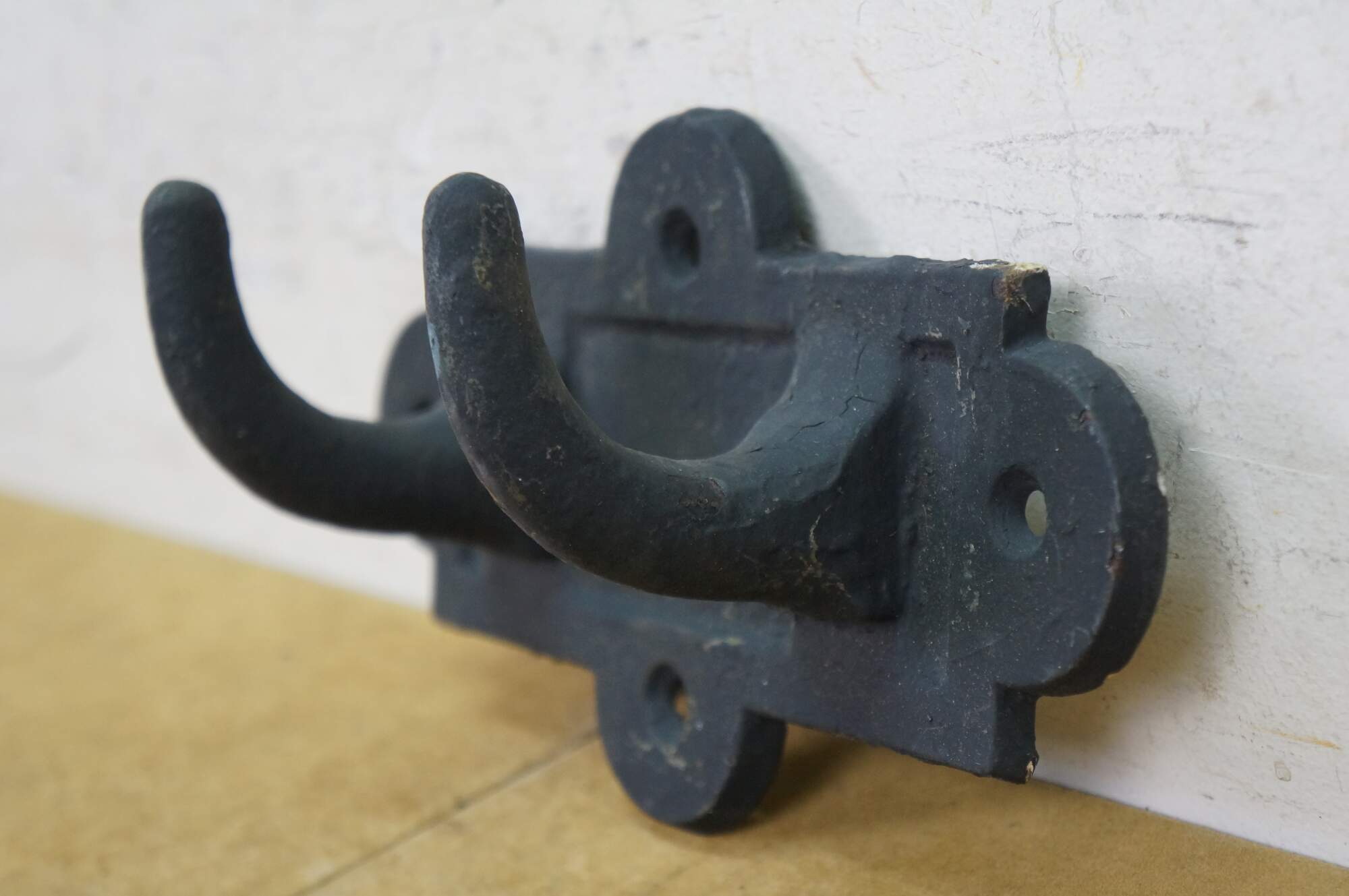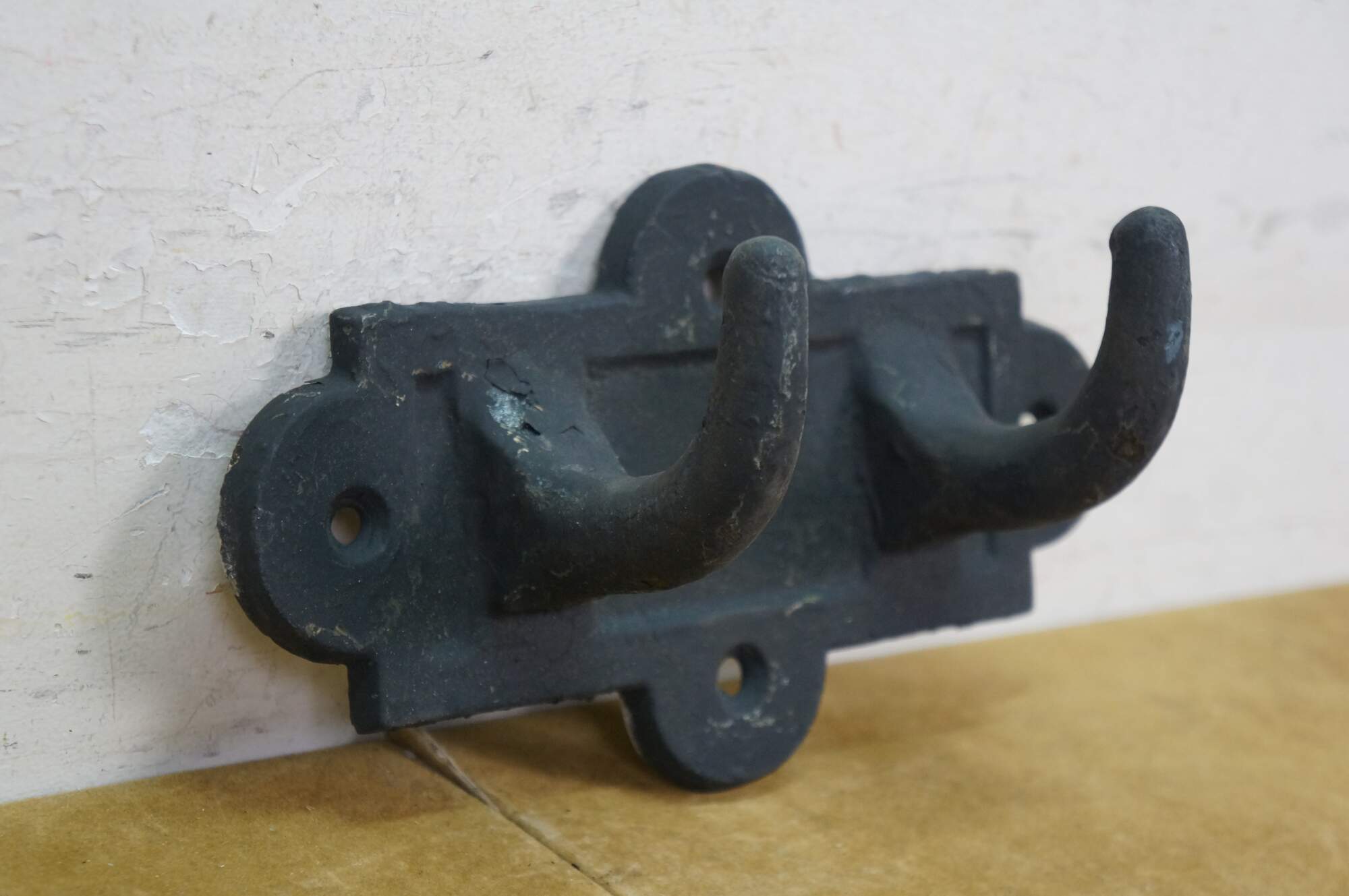 Two antique cast iron two prong barn harness / tack / coat / hat hooks, used in barns to hang saddles, bridles, or heavy coats.