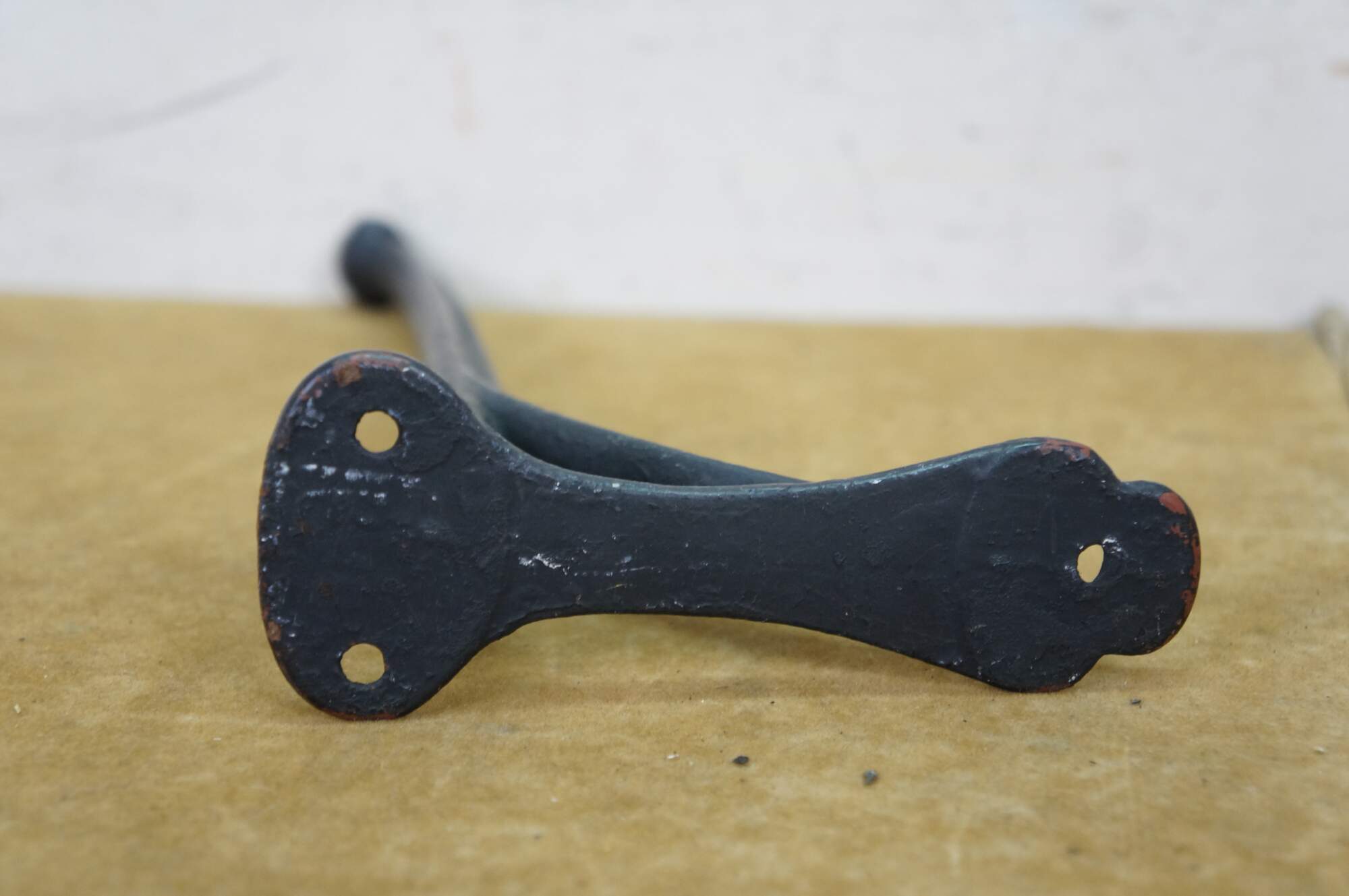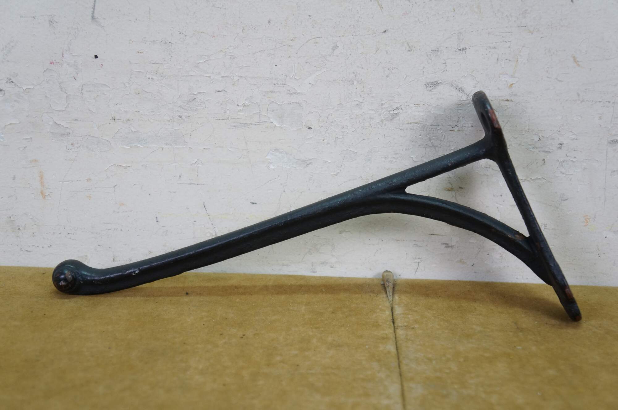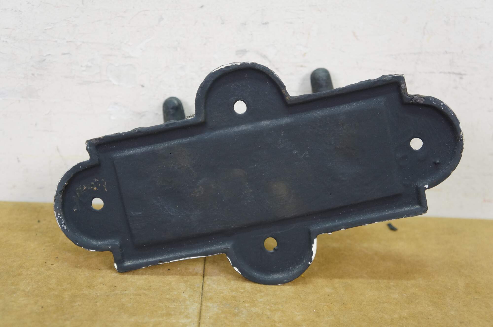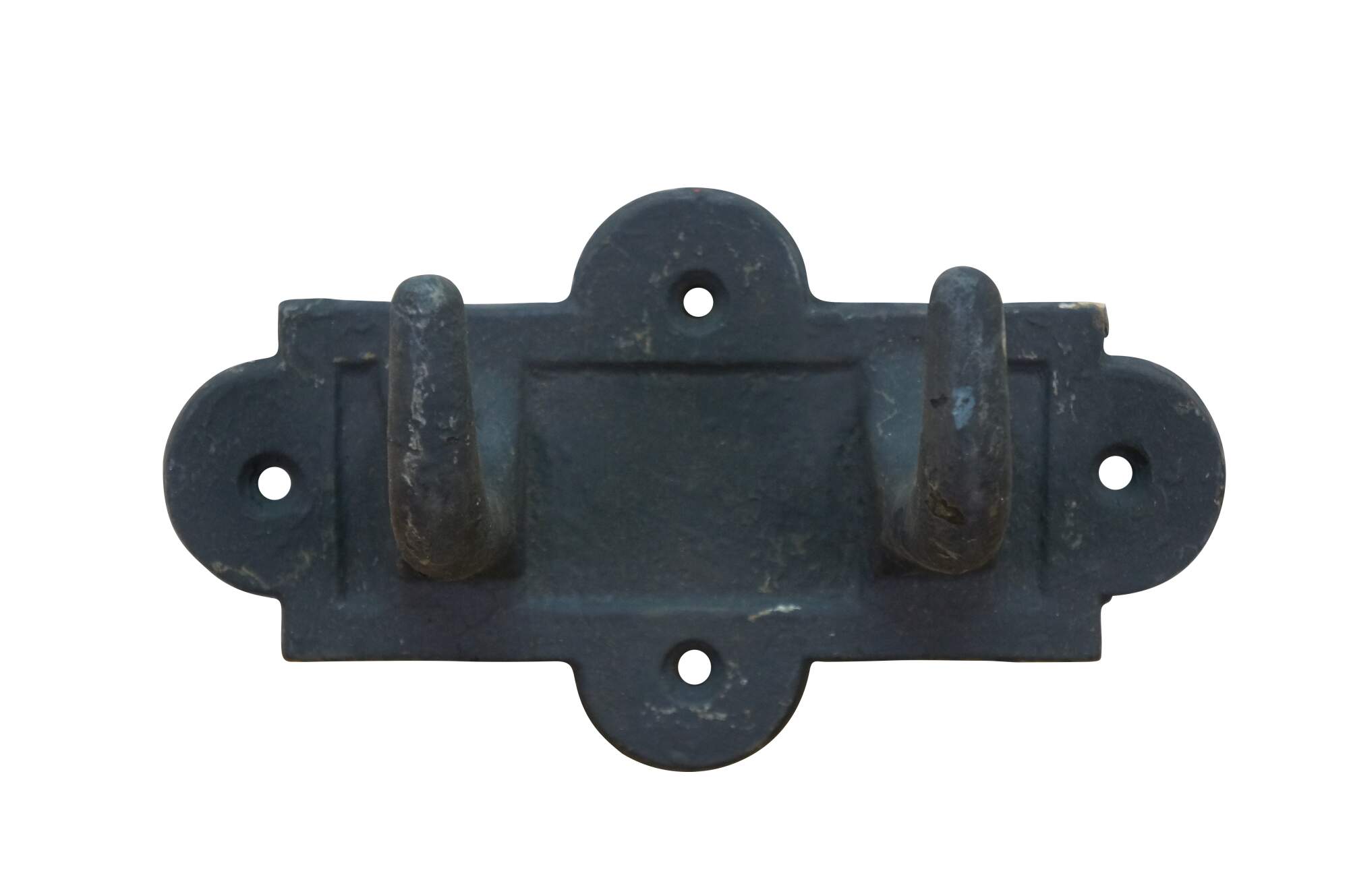 Two antique cast iron two prong barn harness / tack / coat / hat hooks, used in barns to hang saddles, bridles, or heavy coats.