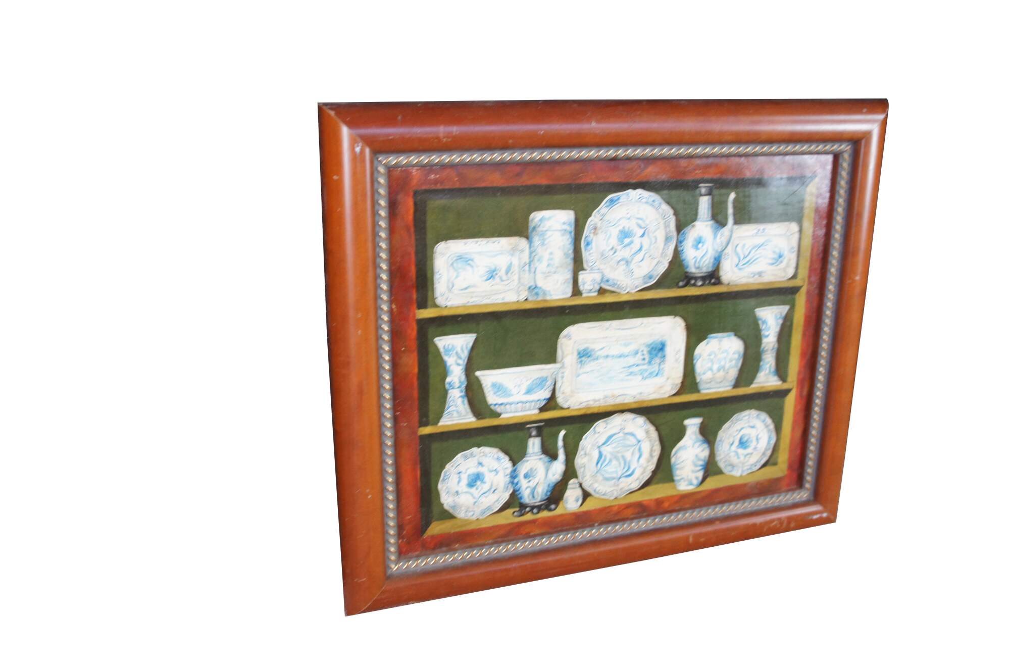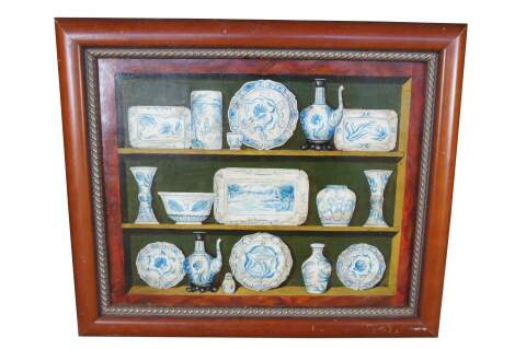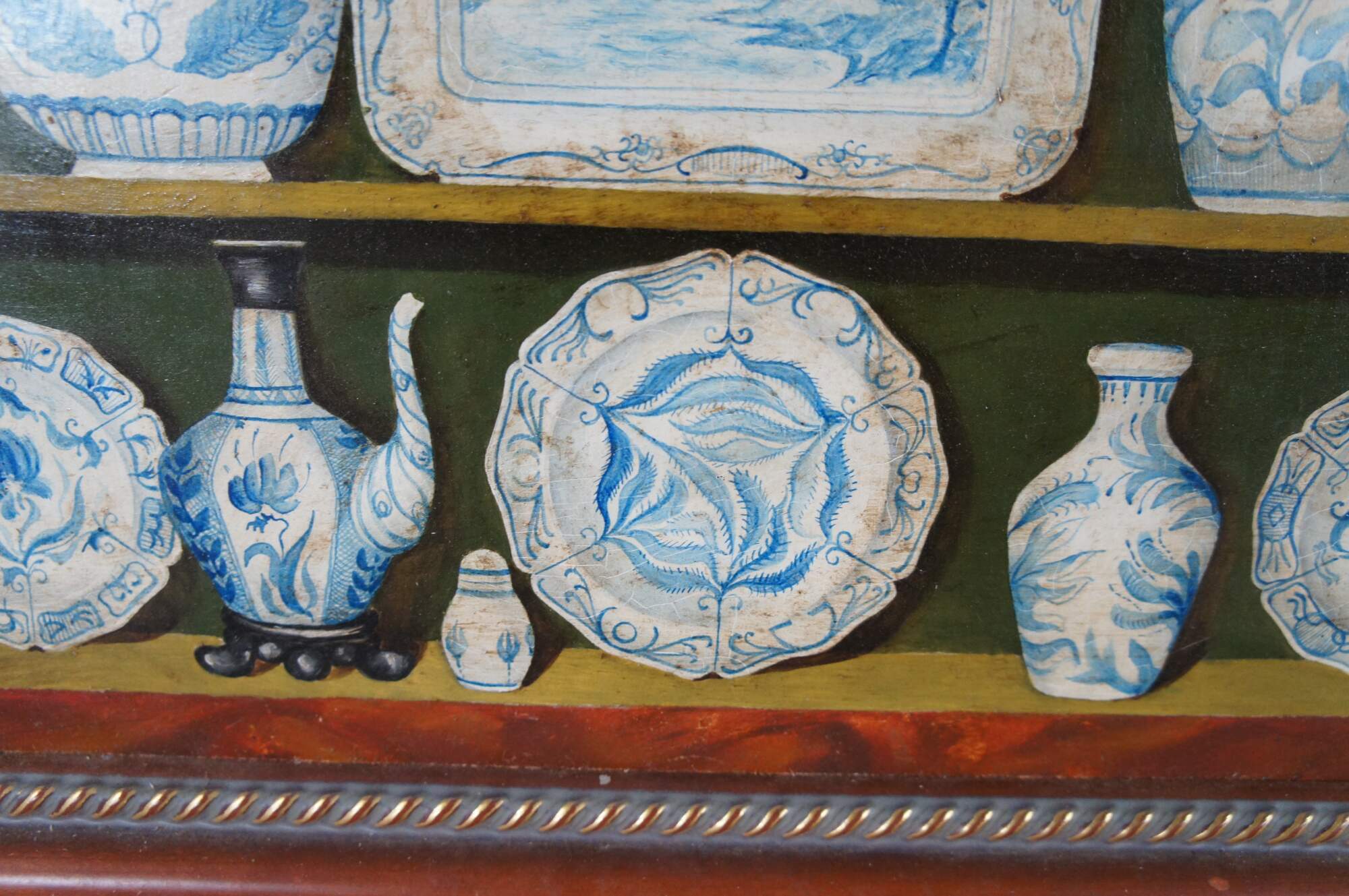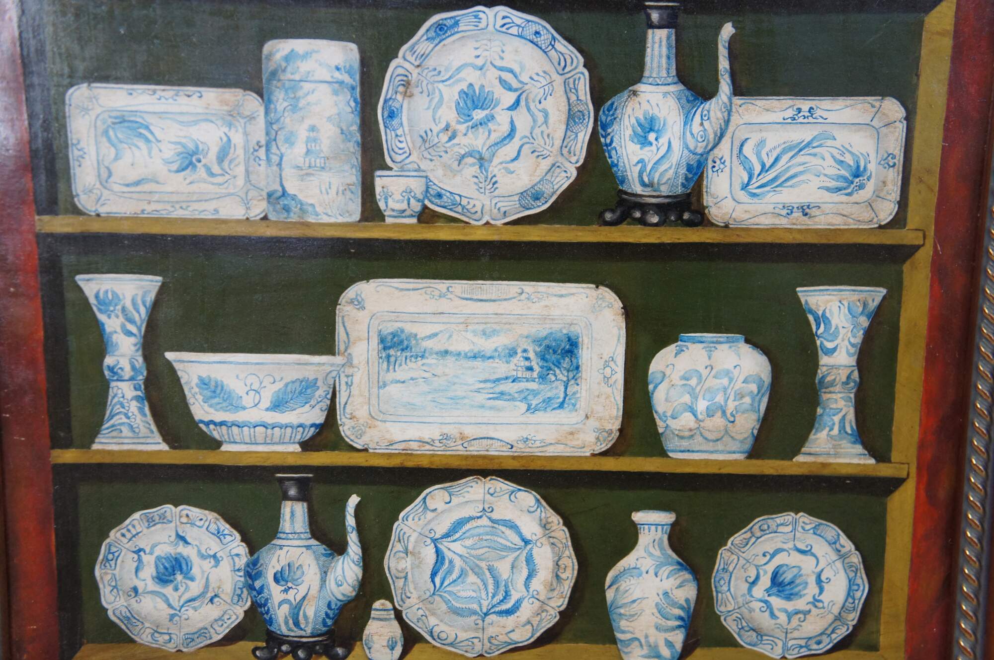 Late 20th century still life oil painting on canvas depicting a farmhouse hutch / cabinet containing a collection of blue and white china plates, bowls, tea cups, pitchers and assorted serving pieces. Signed, lower right by artist Fabrice De Villeneuve. Wood frame with gilt rope twist edge.