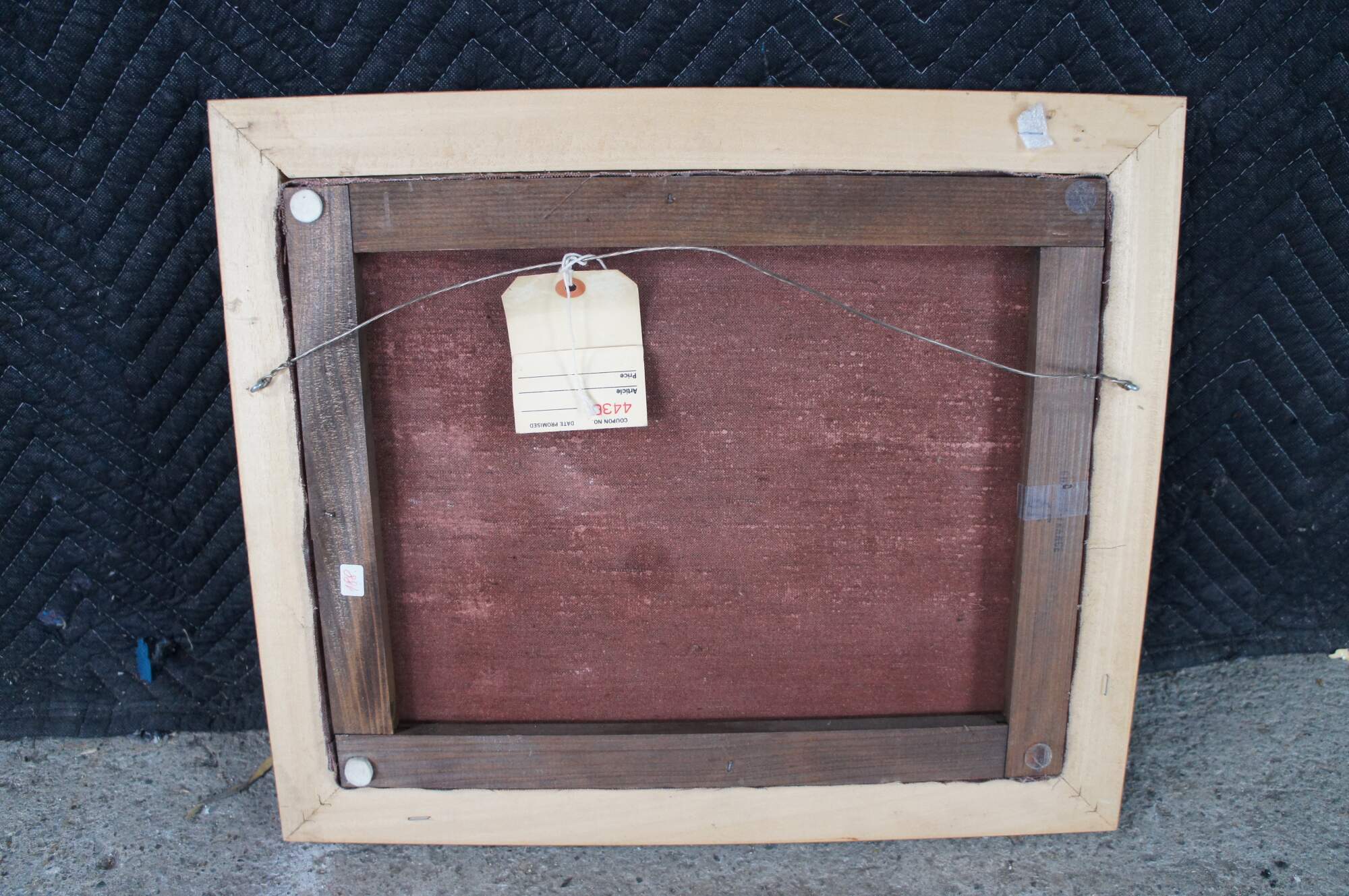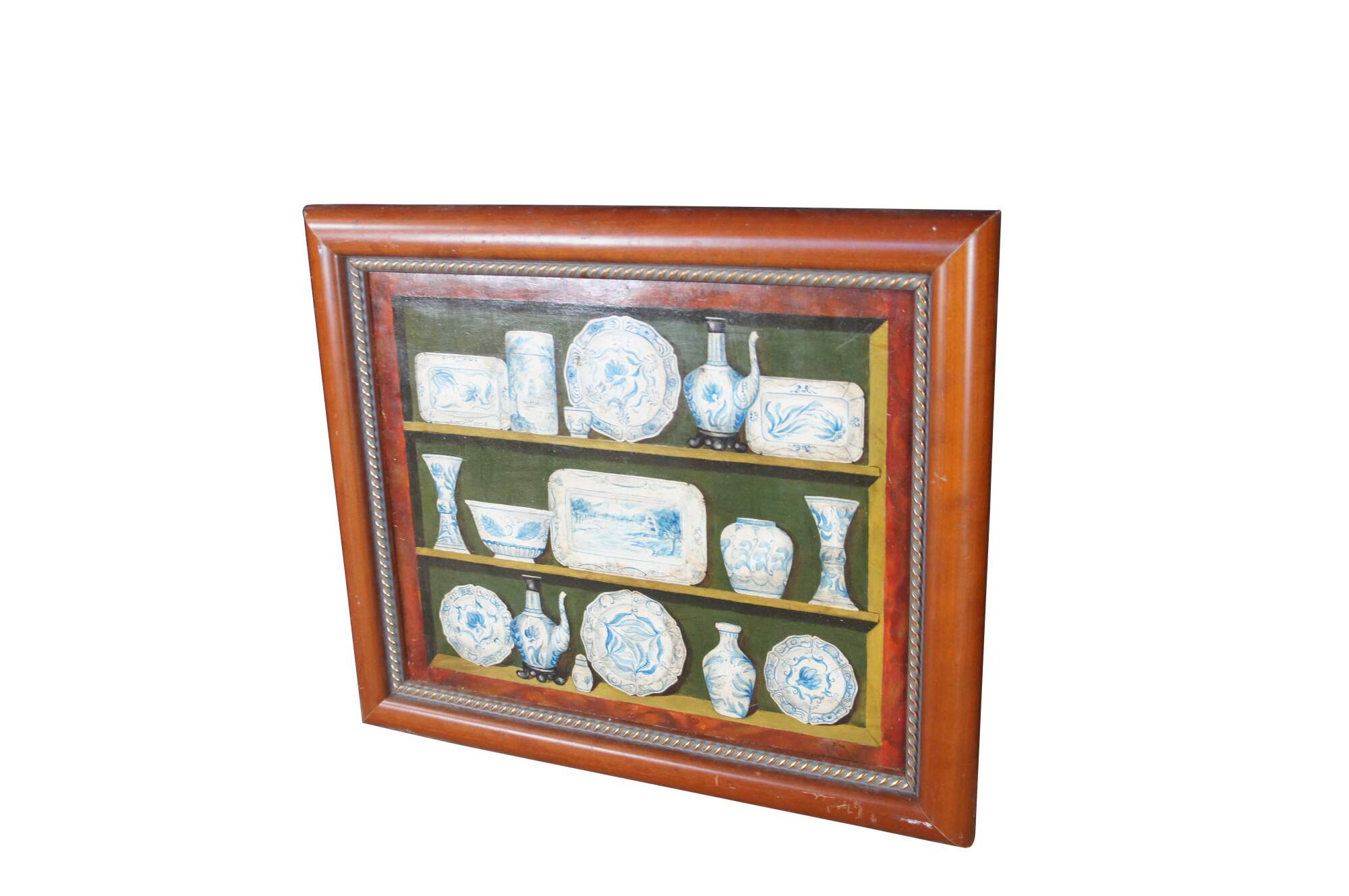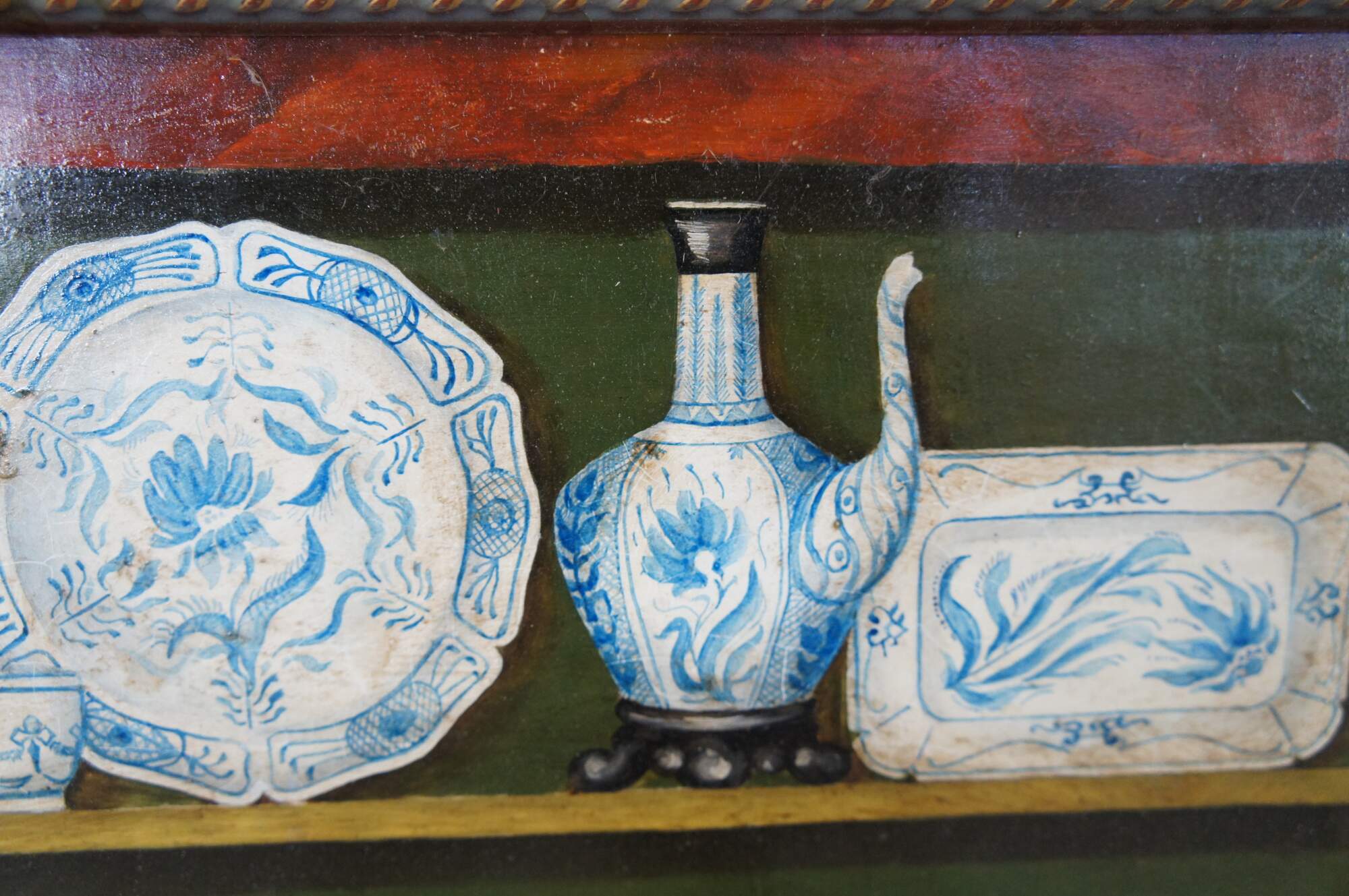 Late 20th century still life oil painting on canvas depicting a farmhouse hutch / cabinet containing a collection of blue and white china plates, bowls, tea cups, pitchers and assorted serving pieces. Signed, lower right by artist Fabrice De Villeneuve. Wood frame with gilt rope twist edge.