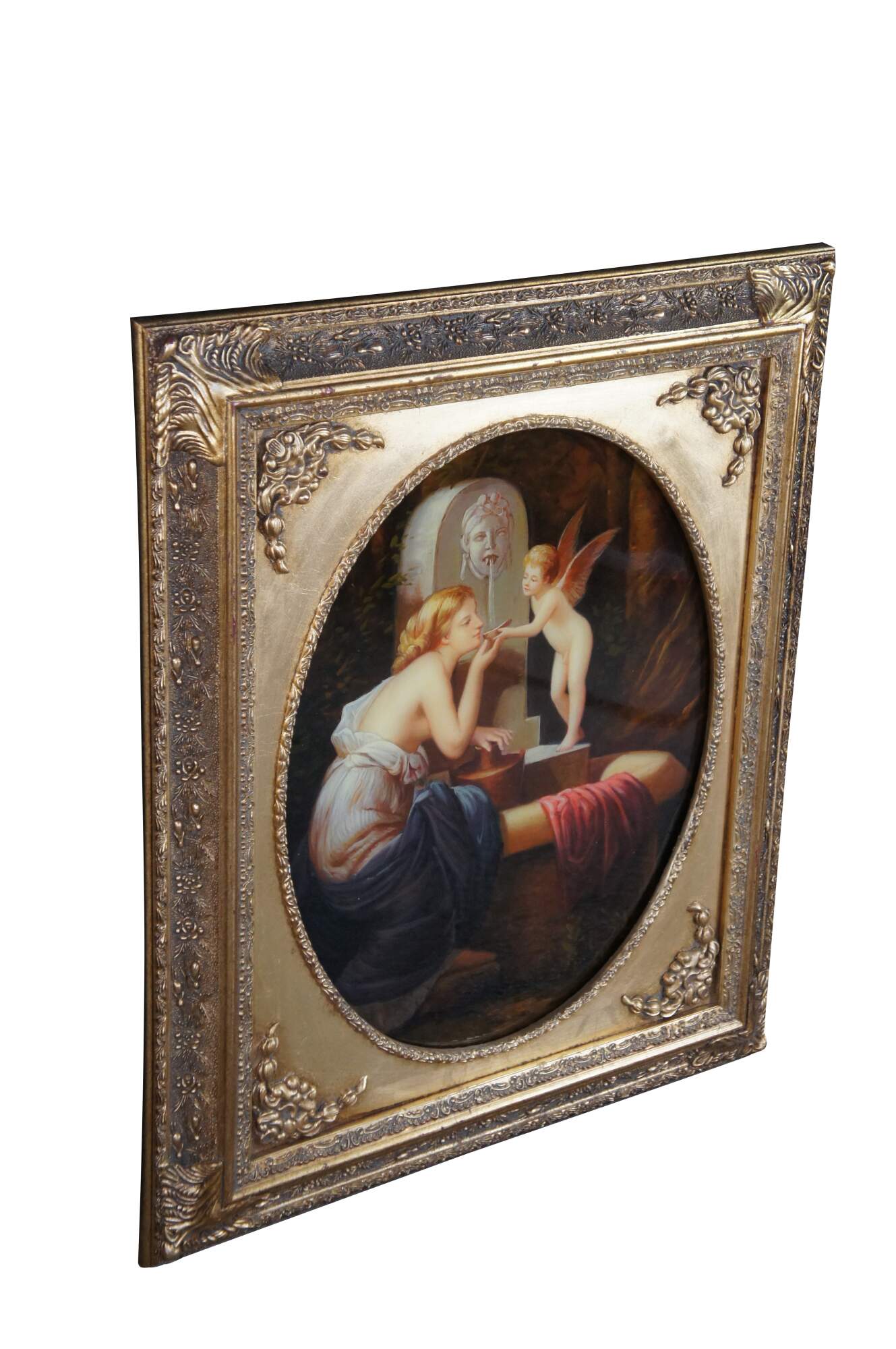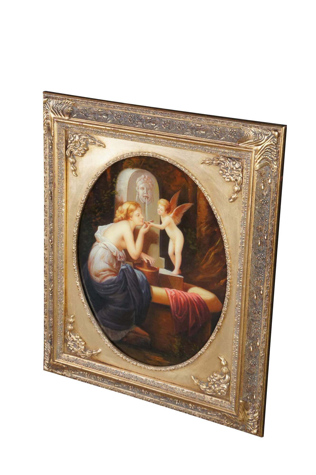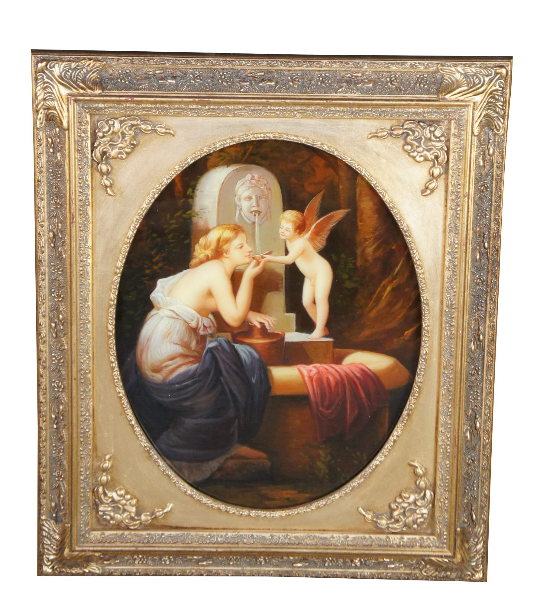 Vintage classical oil painting titled At The Fountain (aka Angel of love and À la Fontaine), after the famous French painting by Henri Pierre Picou. The scene depicts a mythological moment featuring a woman with a winged putto / cherub / Cupid, near a stone fountain. Rectangular oil painting housed in ornate gold Neoclassical oval frame with acanthus, foliate and ribbon design.