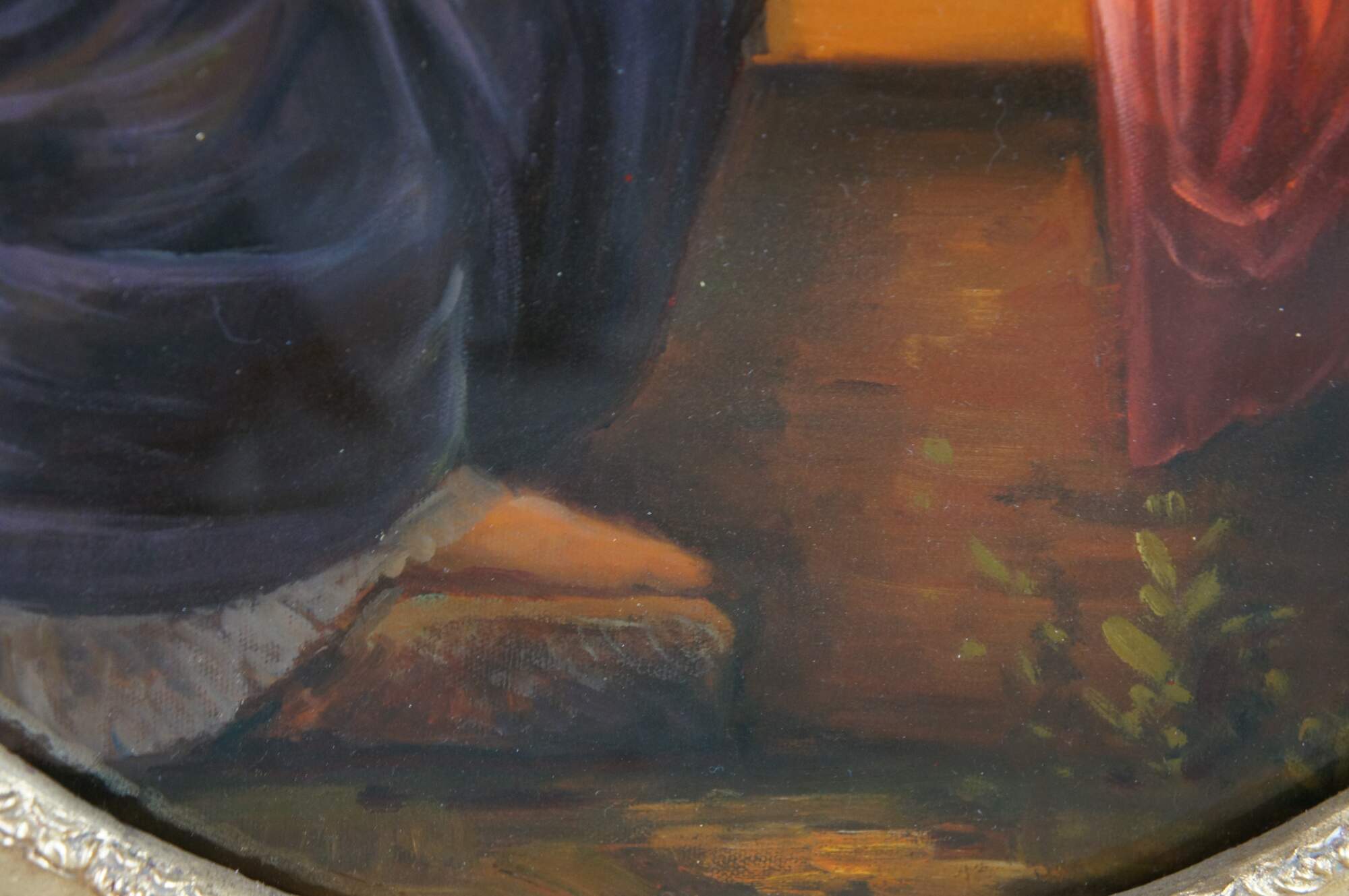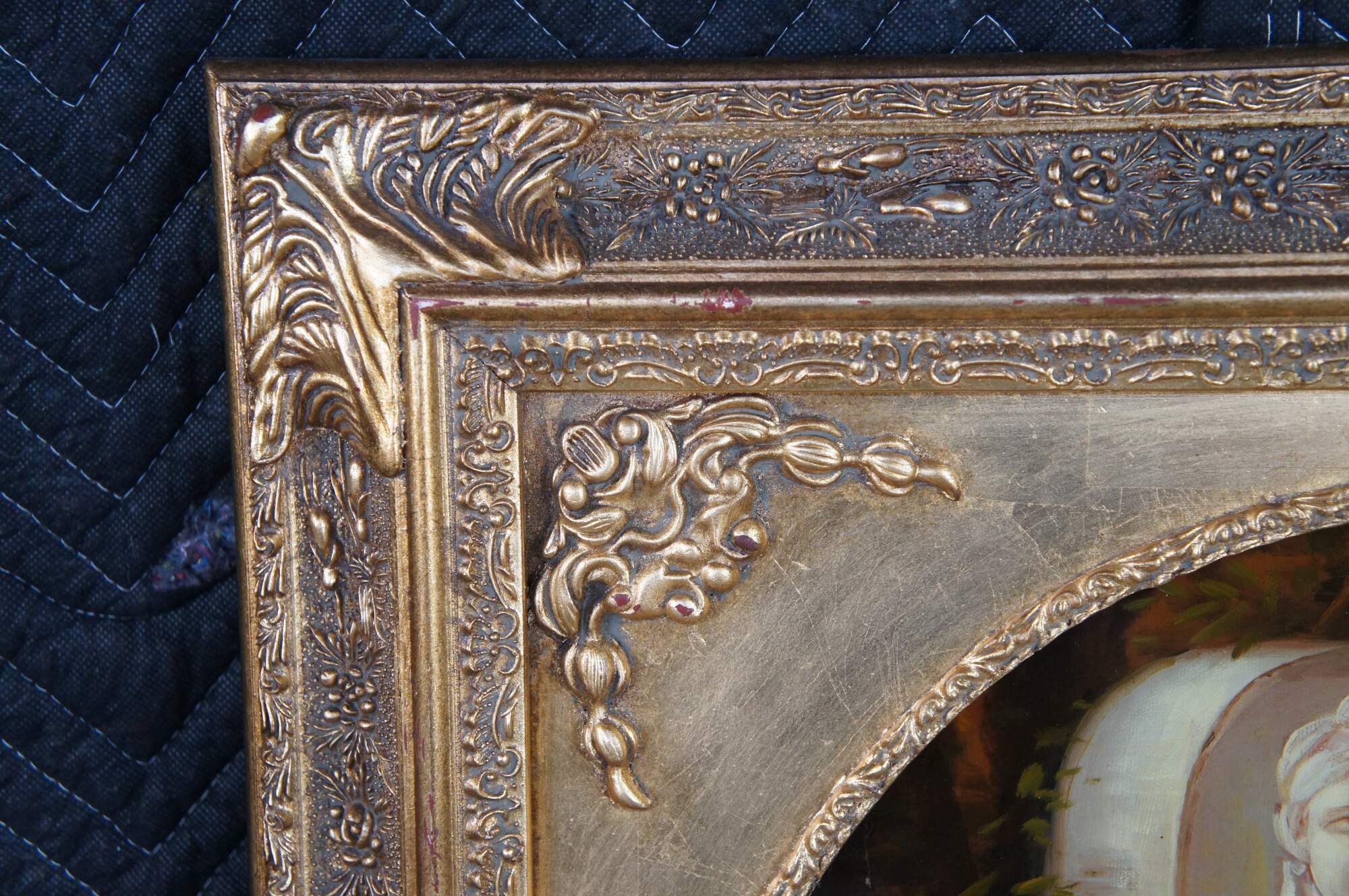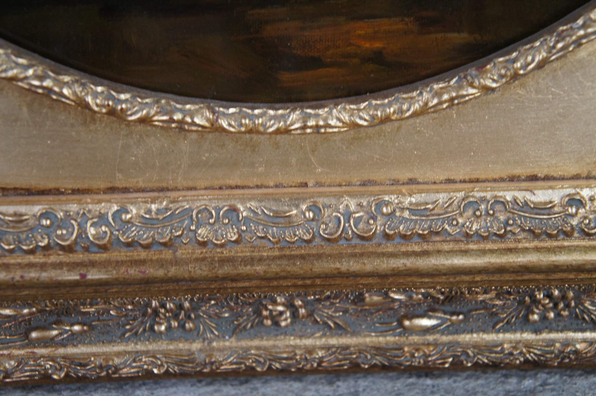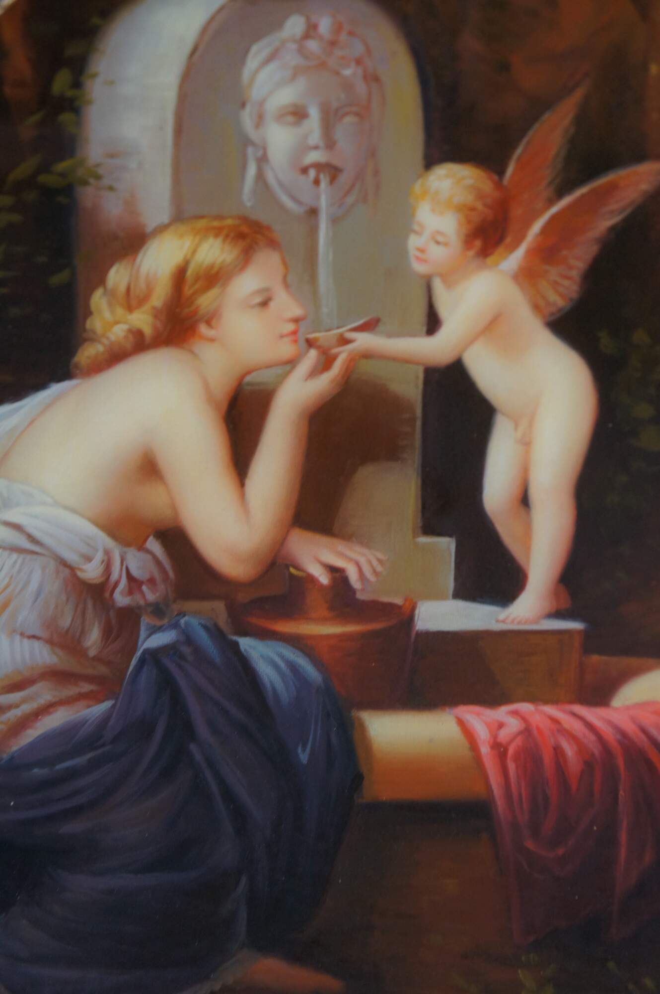 Vintage classical oil painting titled At The Fountain (aka Angel of love and À la Fontaine), after the famous French painting by Henri Pierre Picou. The scene depicts a mythological moment featuring a woman with a winged putto / cherub / Cupid, near a stone fountain. Rectangular oil painting housed in ornate gold Neoclassical oval frame with acanthus, foliate and ribbon design.