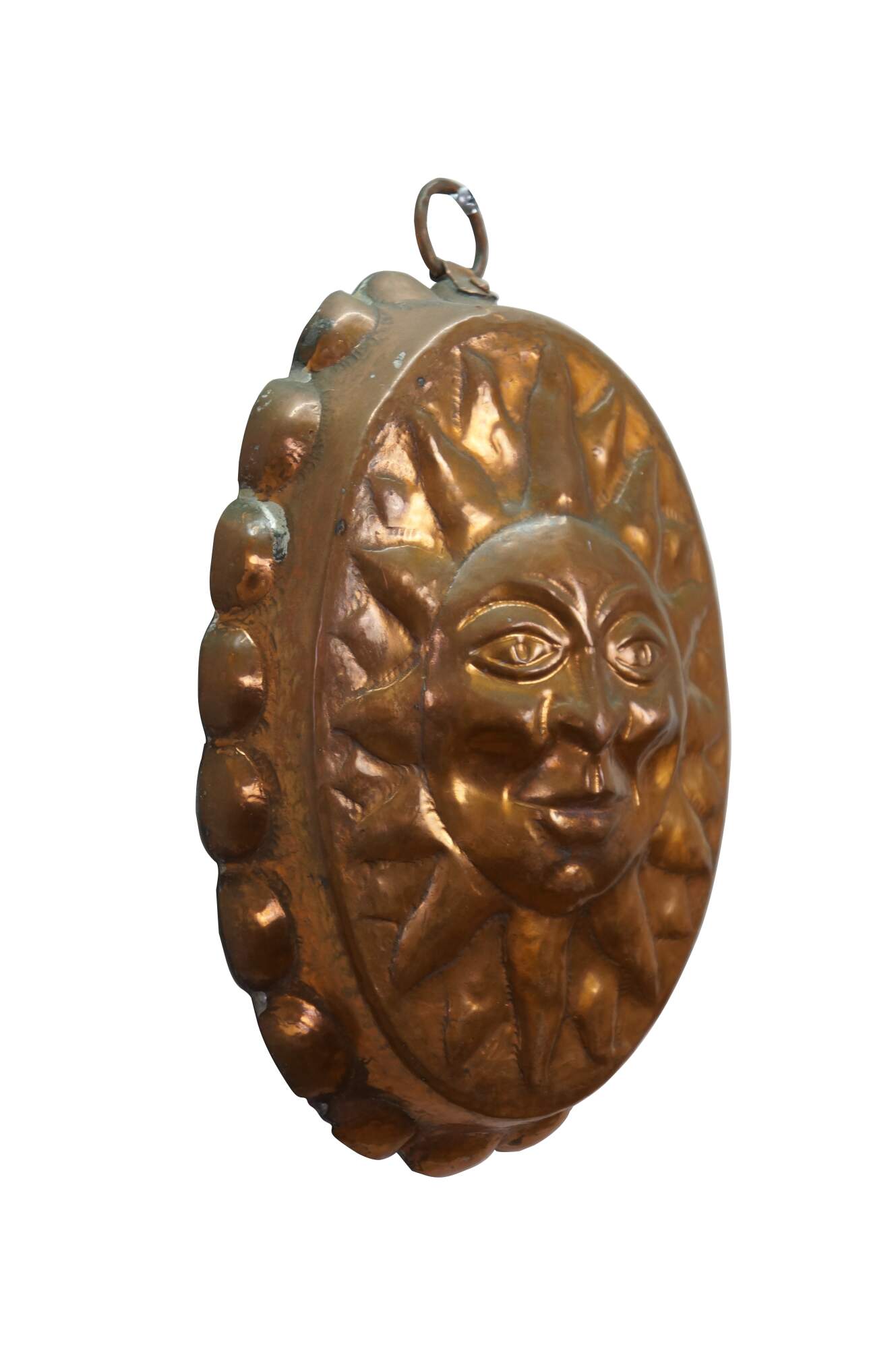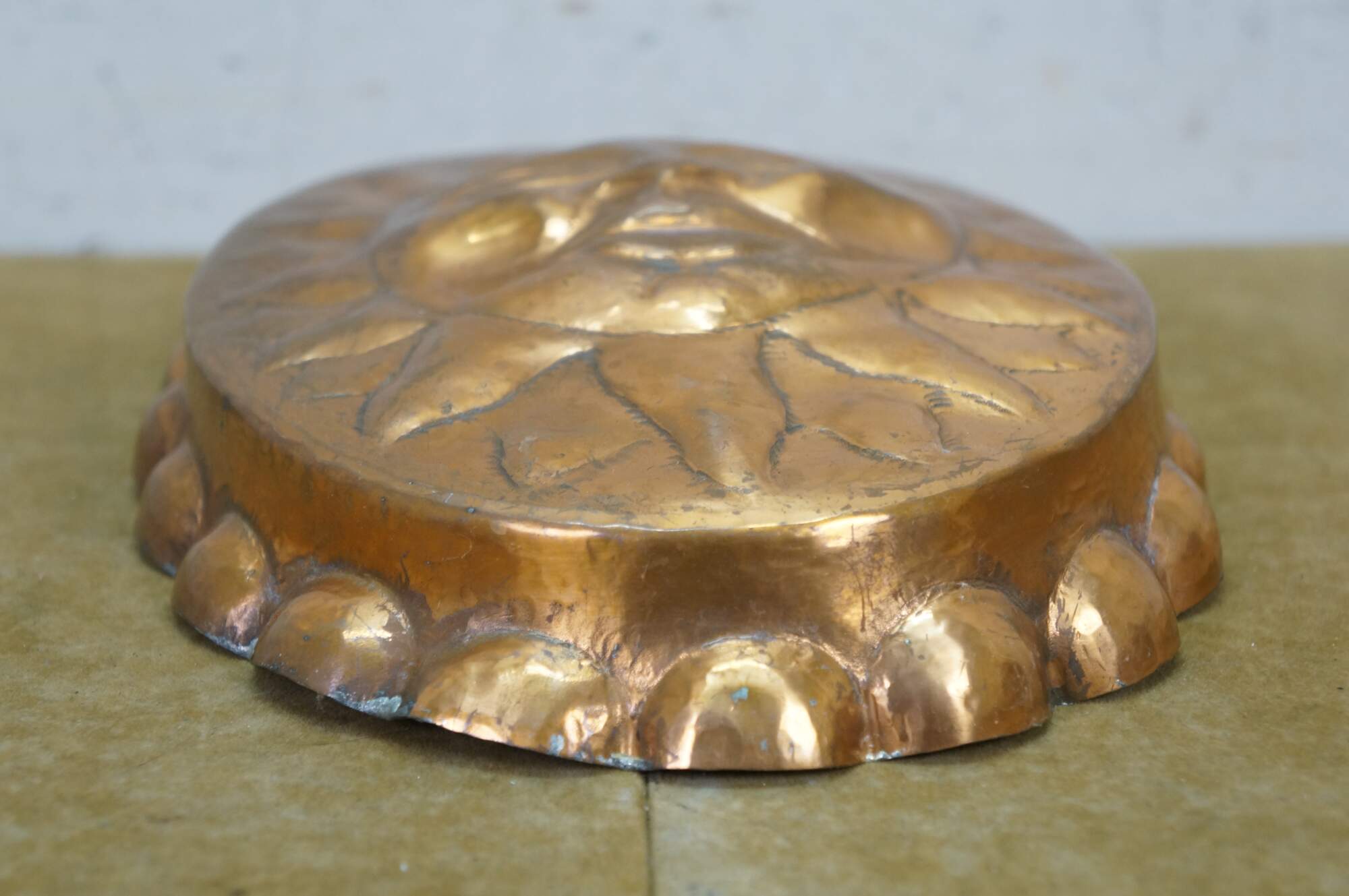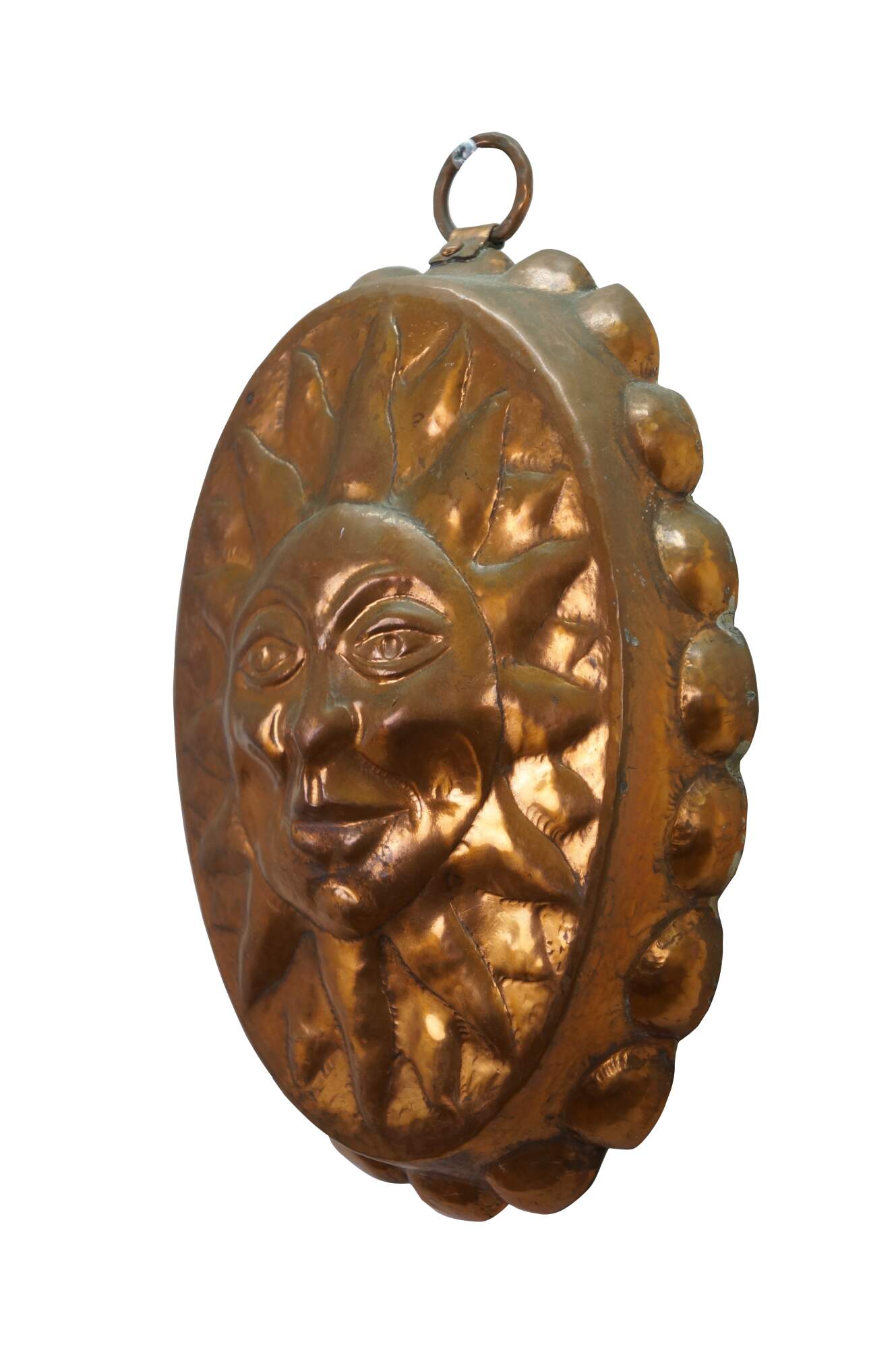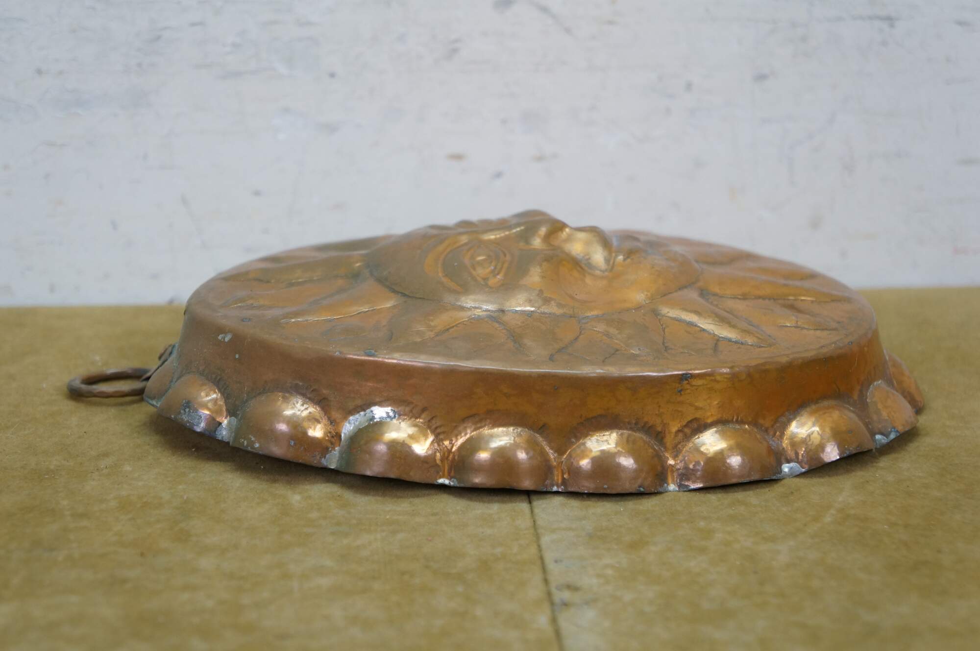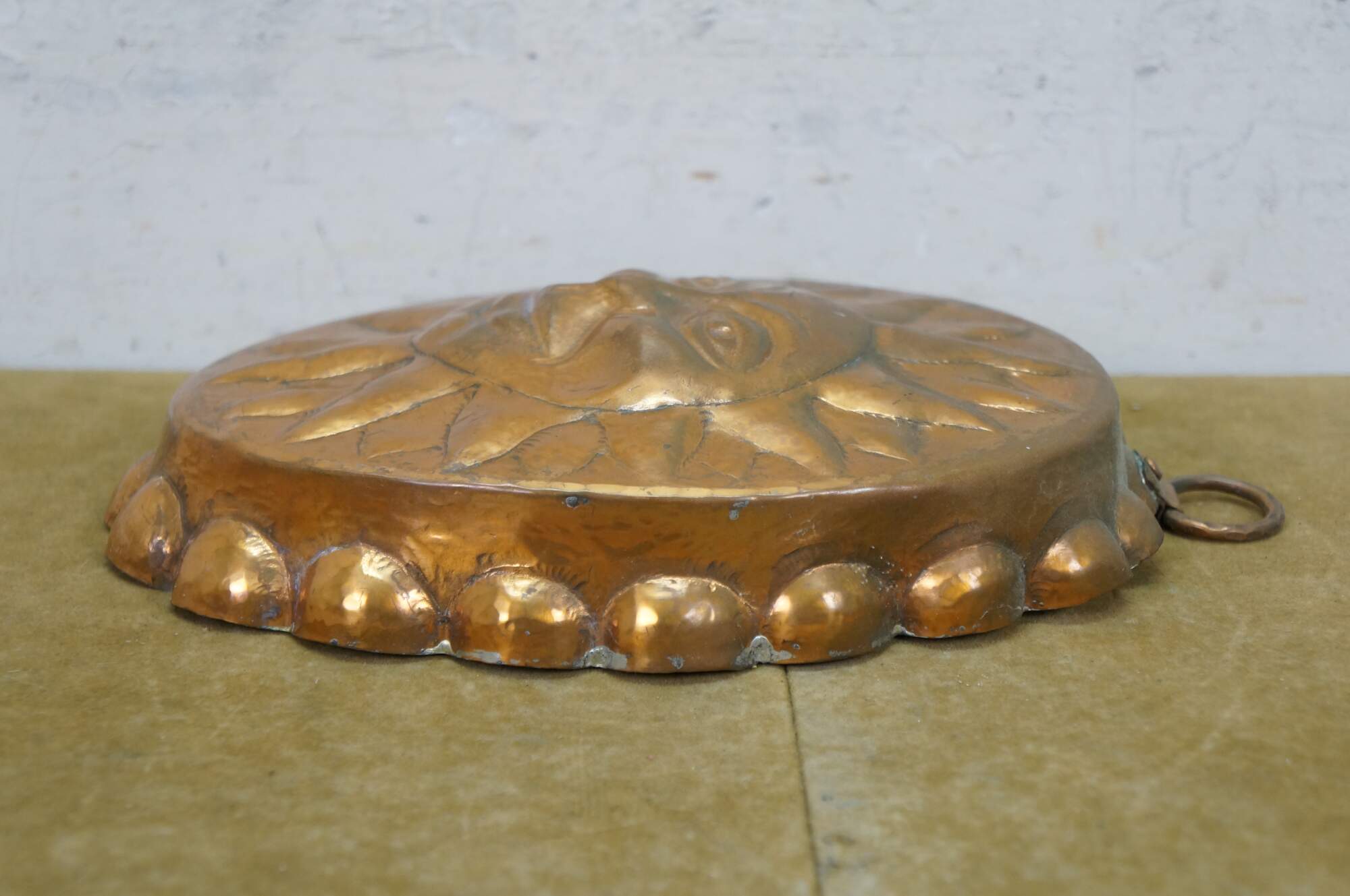Vintage hammered copper tin lined chocolate / cake / jello mold featuring a sunburst / starburst / celestial sun design with ring handle.