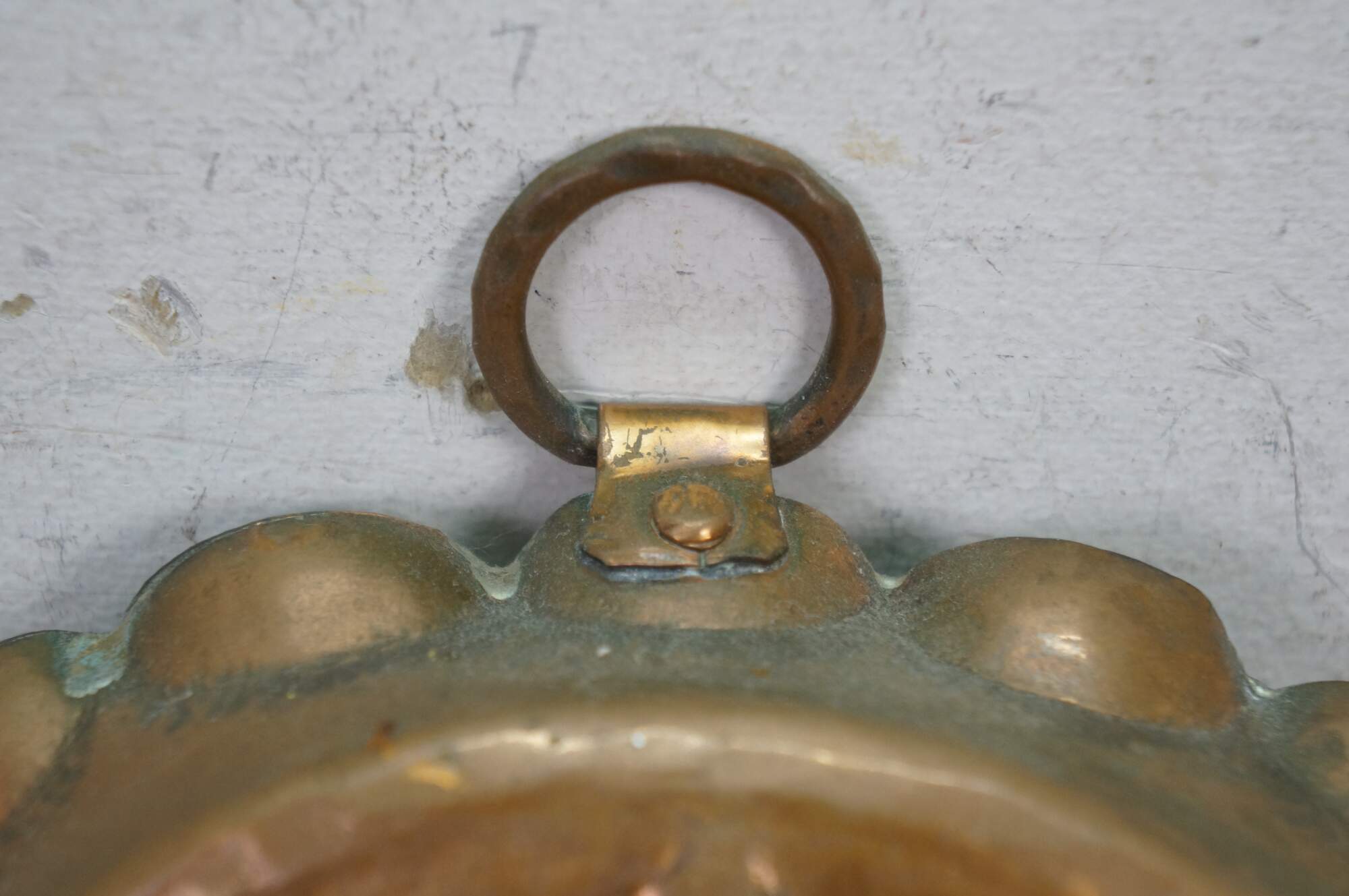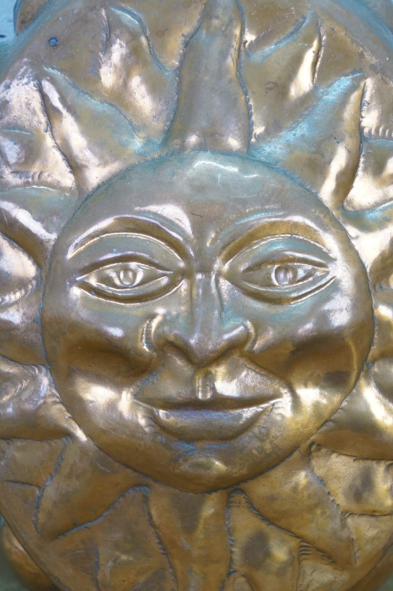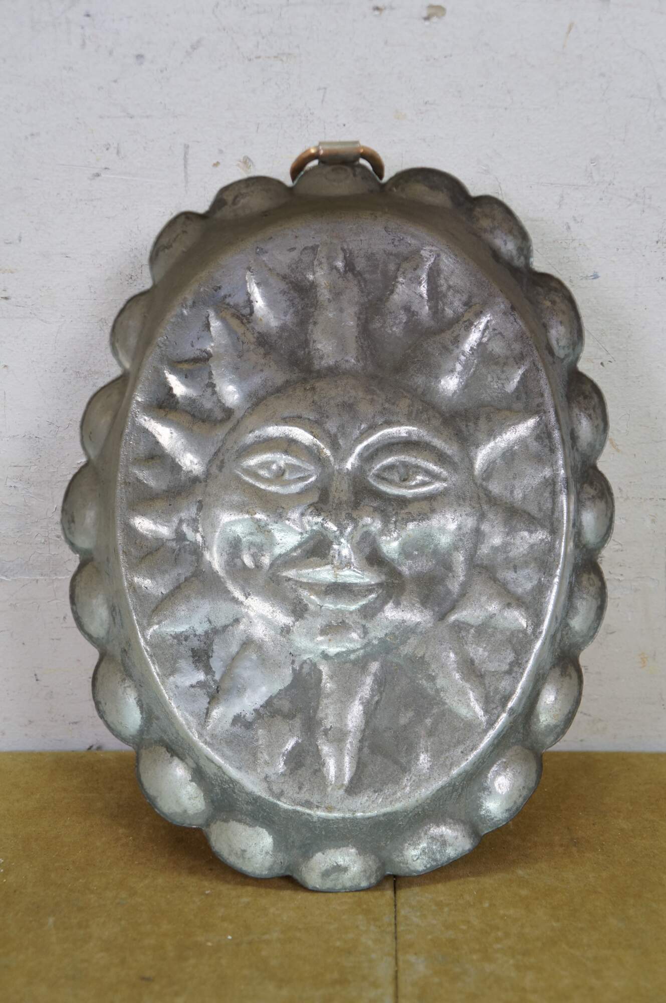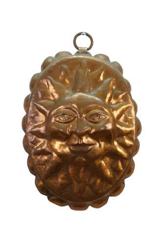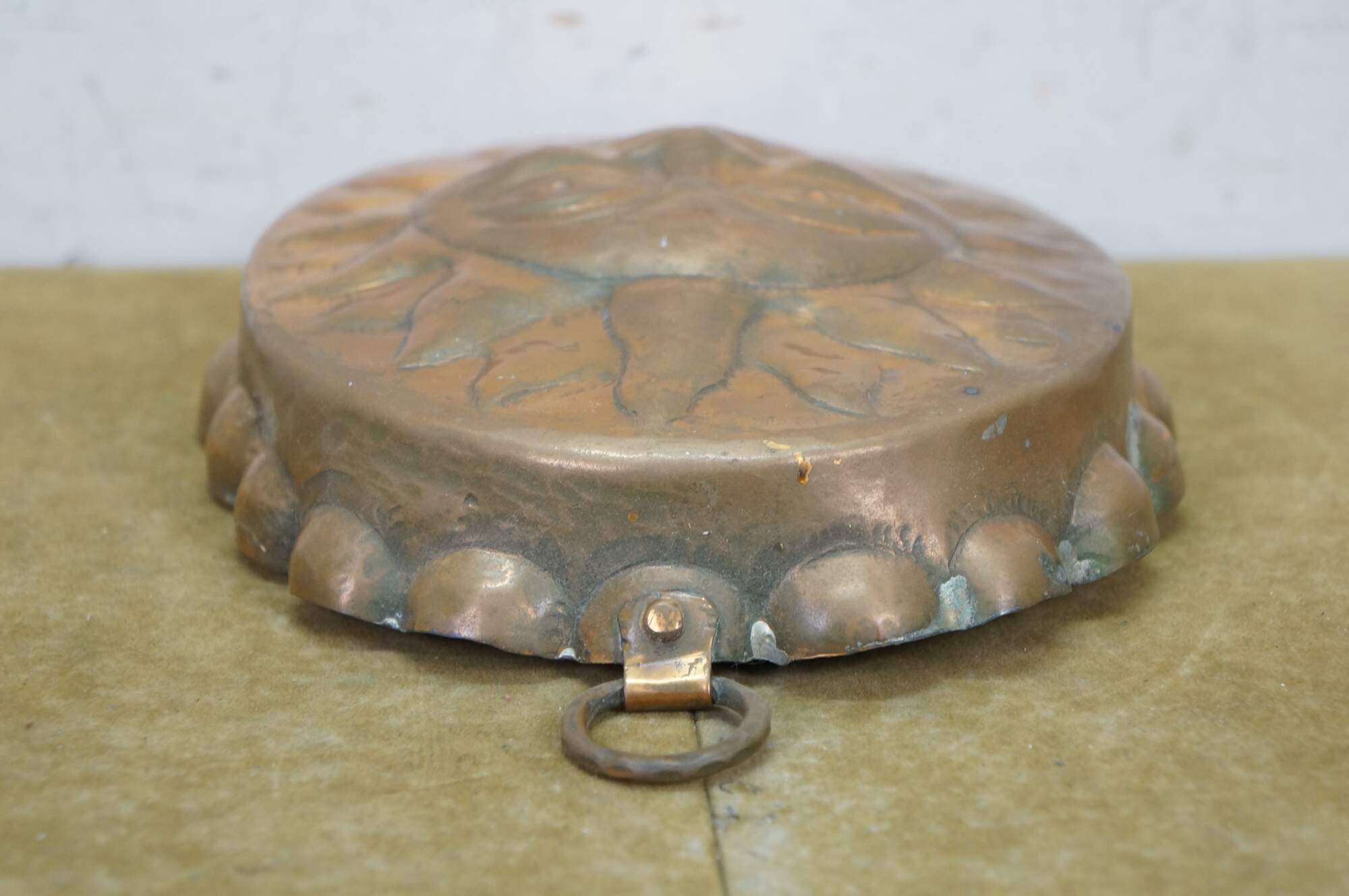 Vintage hammered copper tin lined chocolate / cake / jello mold featuring a sunburst / starburst / celestial sun design with ring handle.