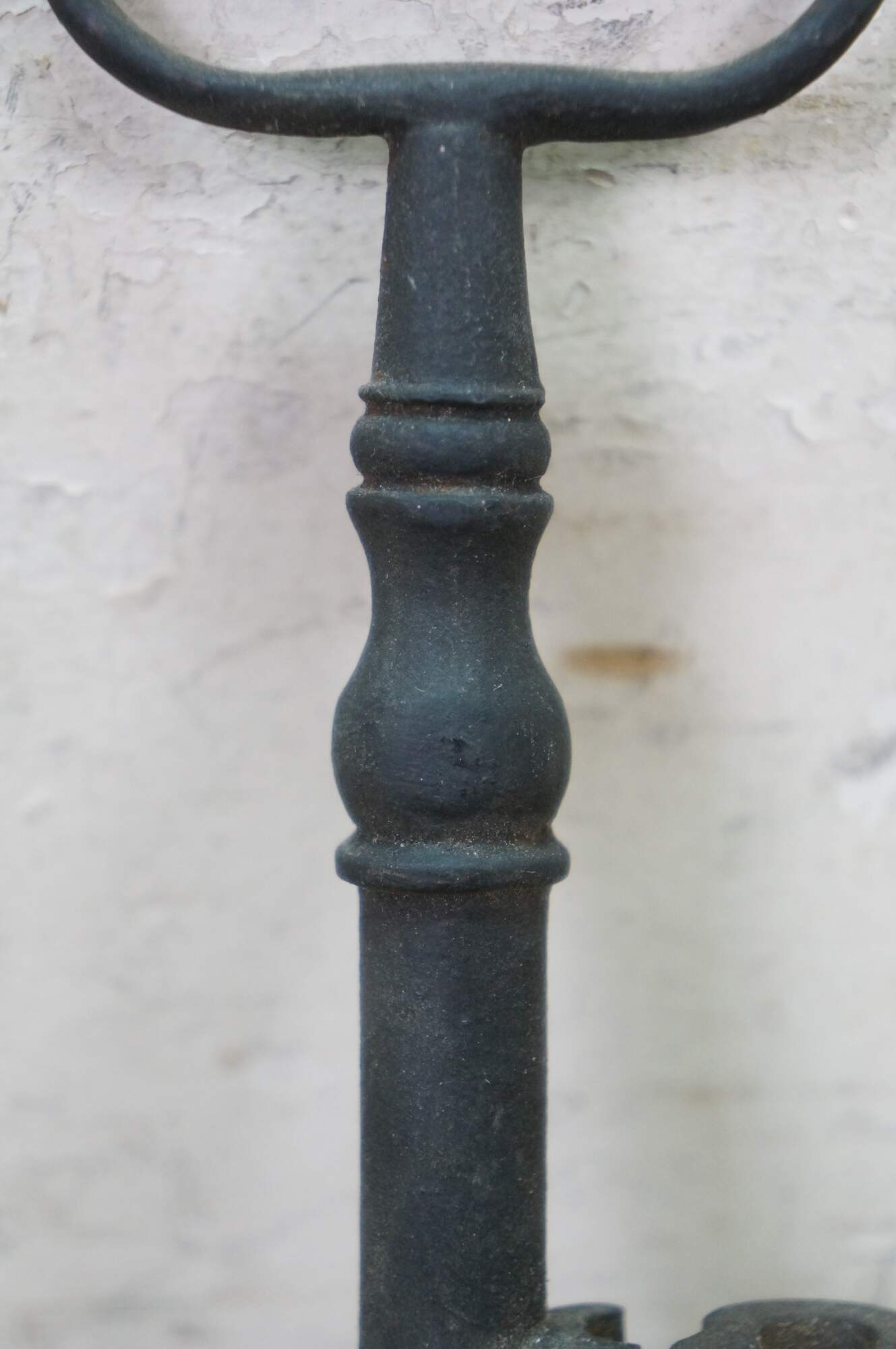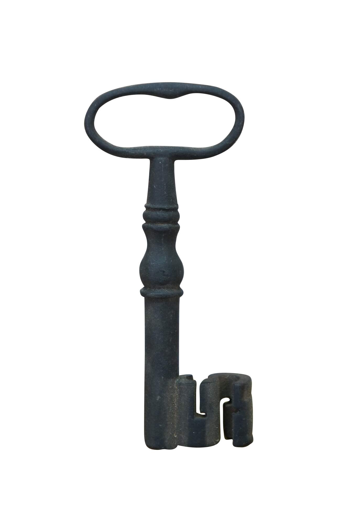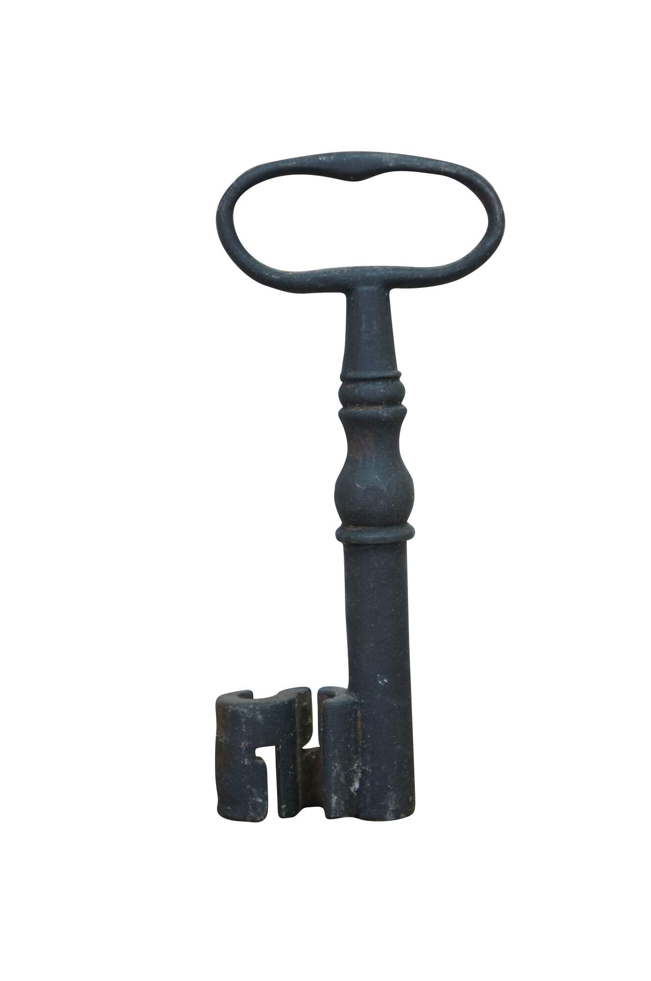 Antique wrought iron skeleton key for a large door, gate, cabinet, trunk, armoire, or jail cell. Features a large bow (handle), a solid or hollow barrel, and a complex bit (the part that interacts with the lock mechanism).