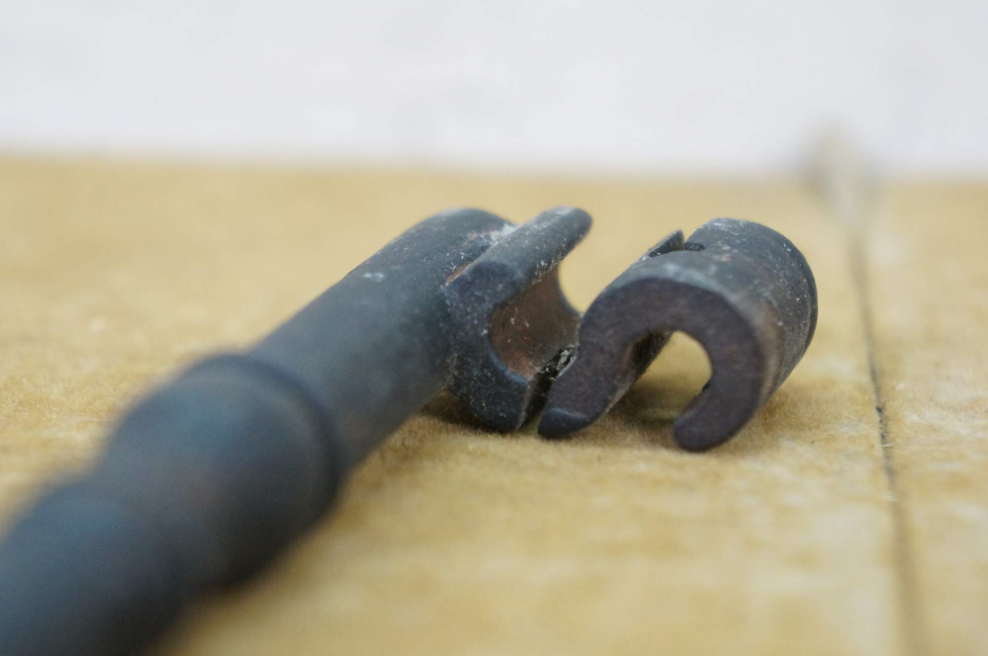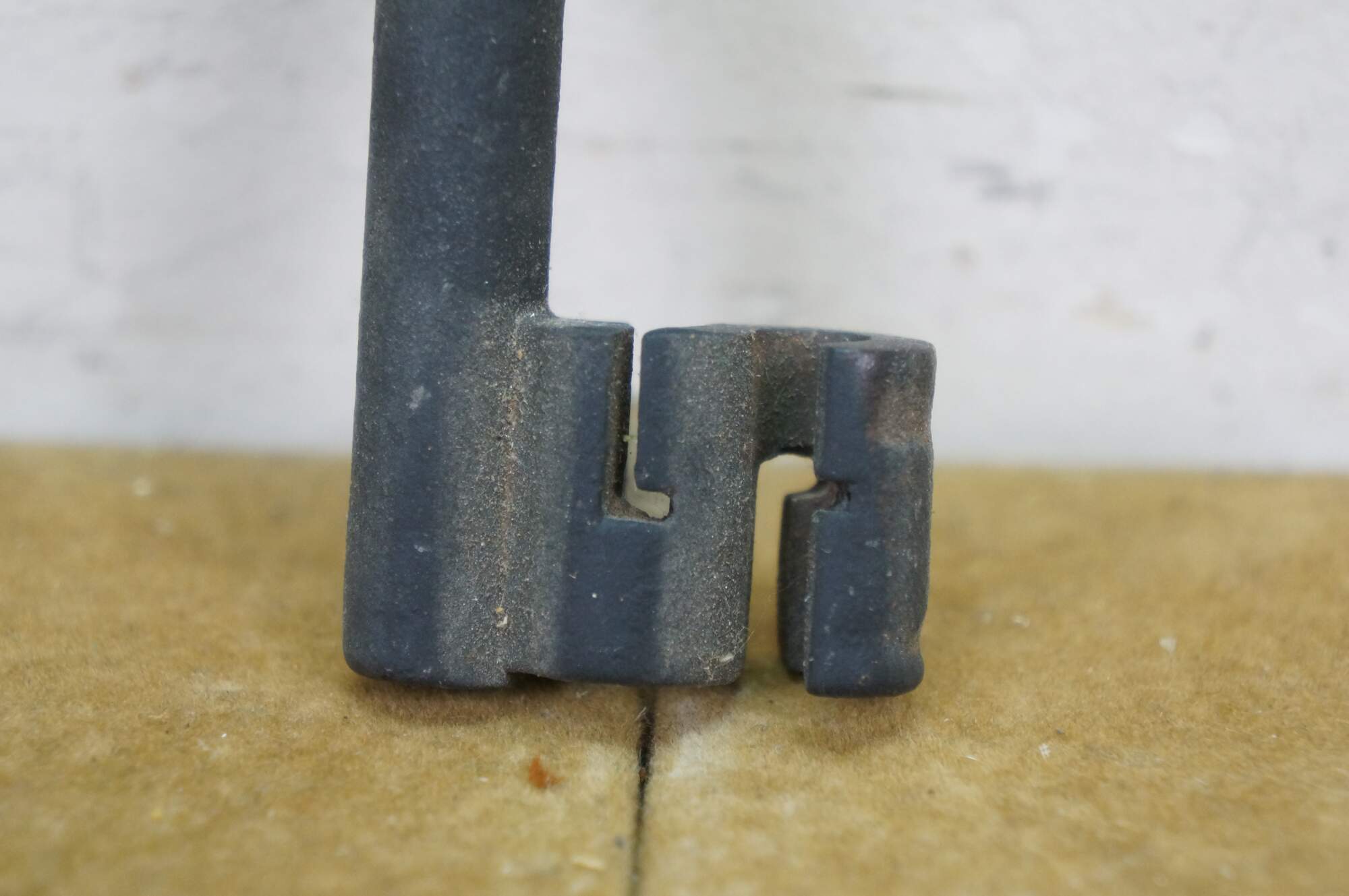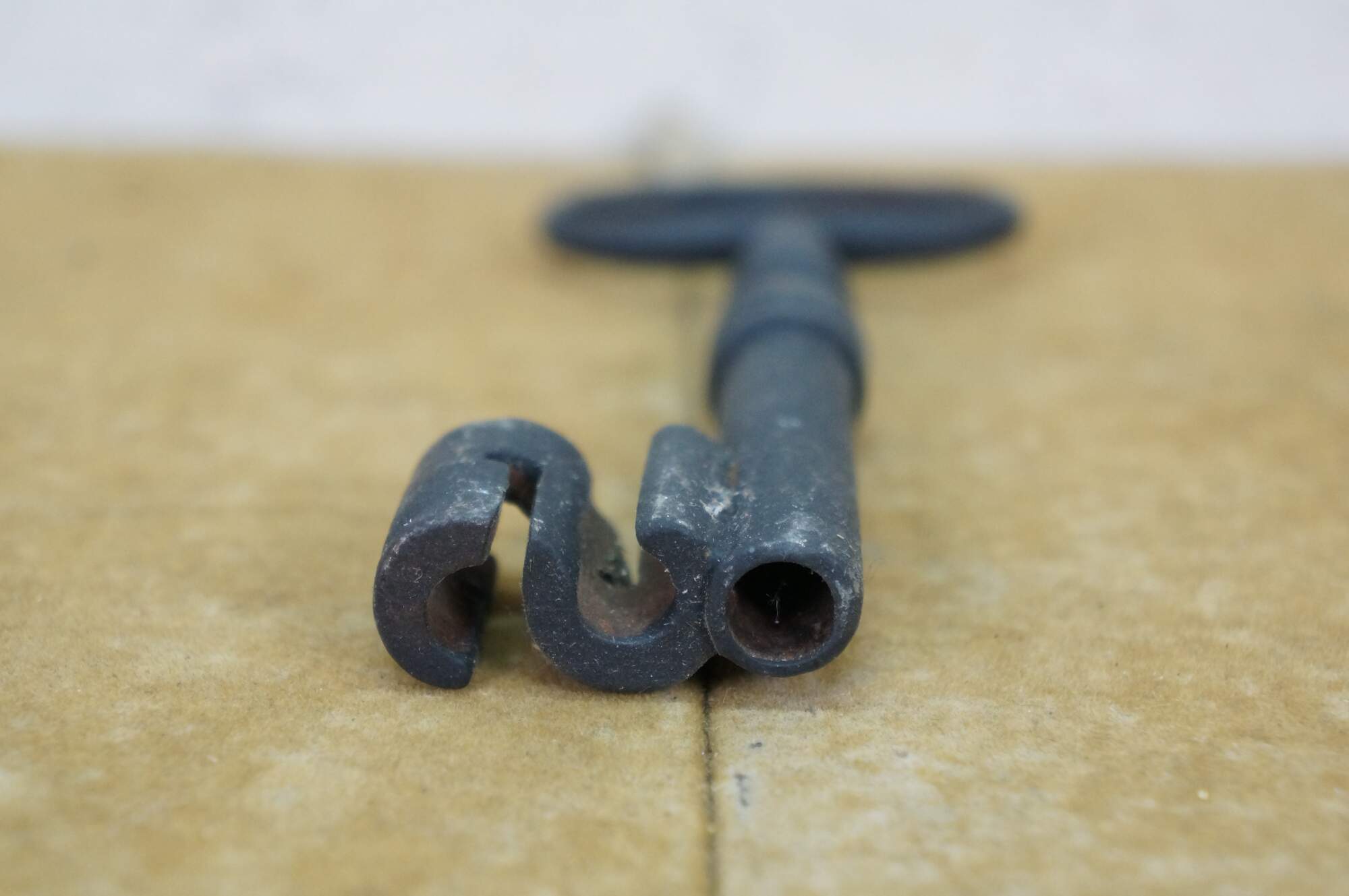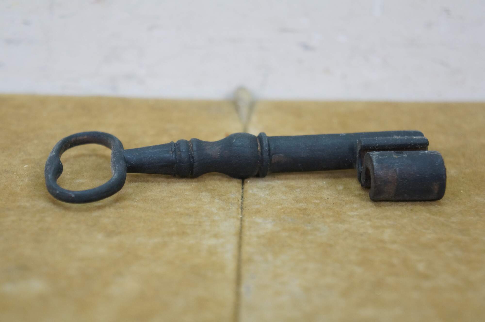 Antique wrought iron skeleton key for a large door, gate, cabinet, trunk, armoire, or jail cell. Features a large bow (handle), a solid or hollow barrel, and a complex bit (the part that interacts with the lock mechanism).