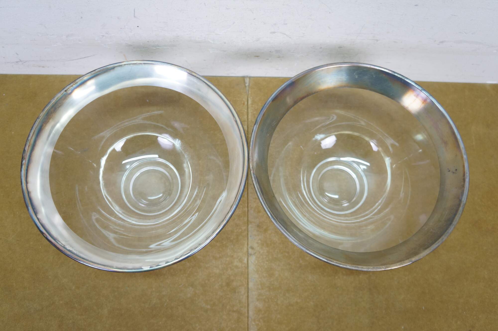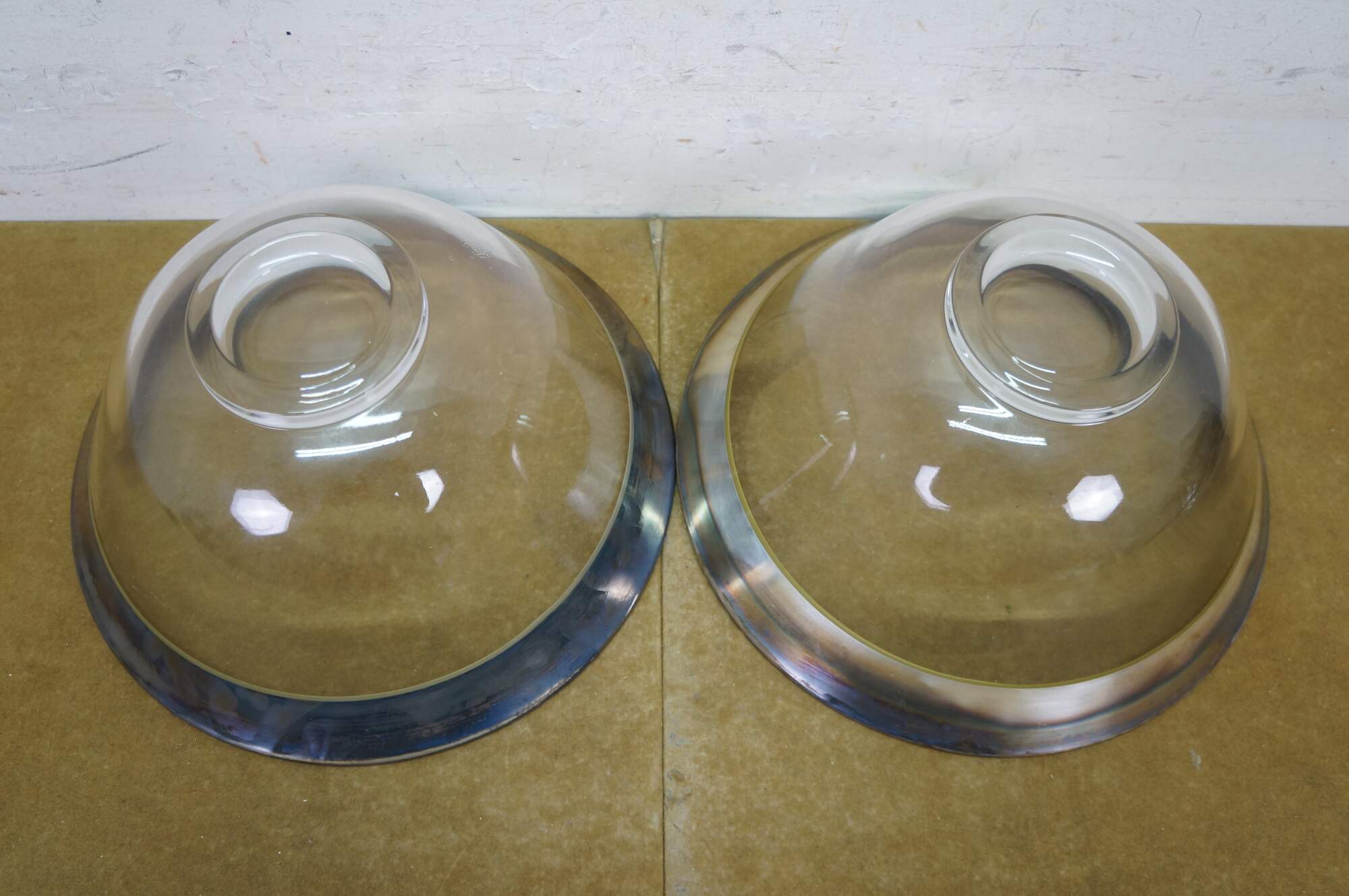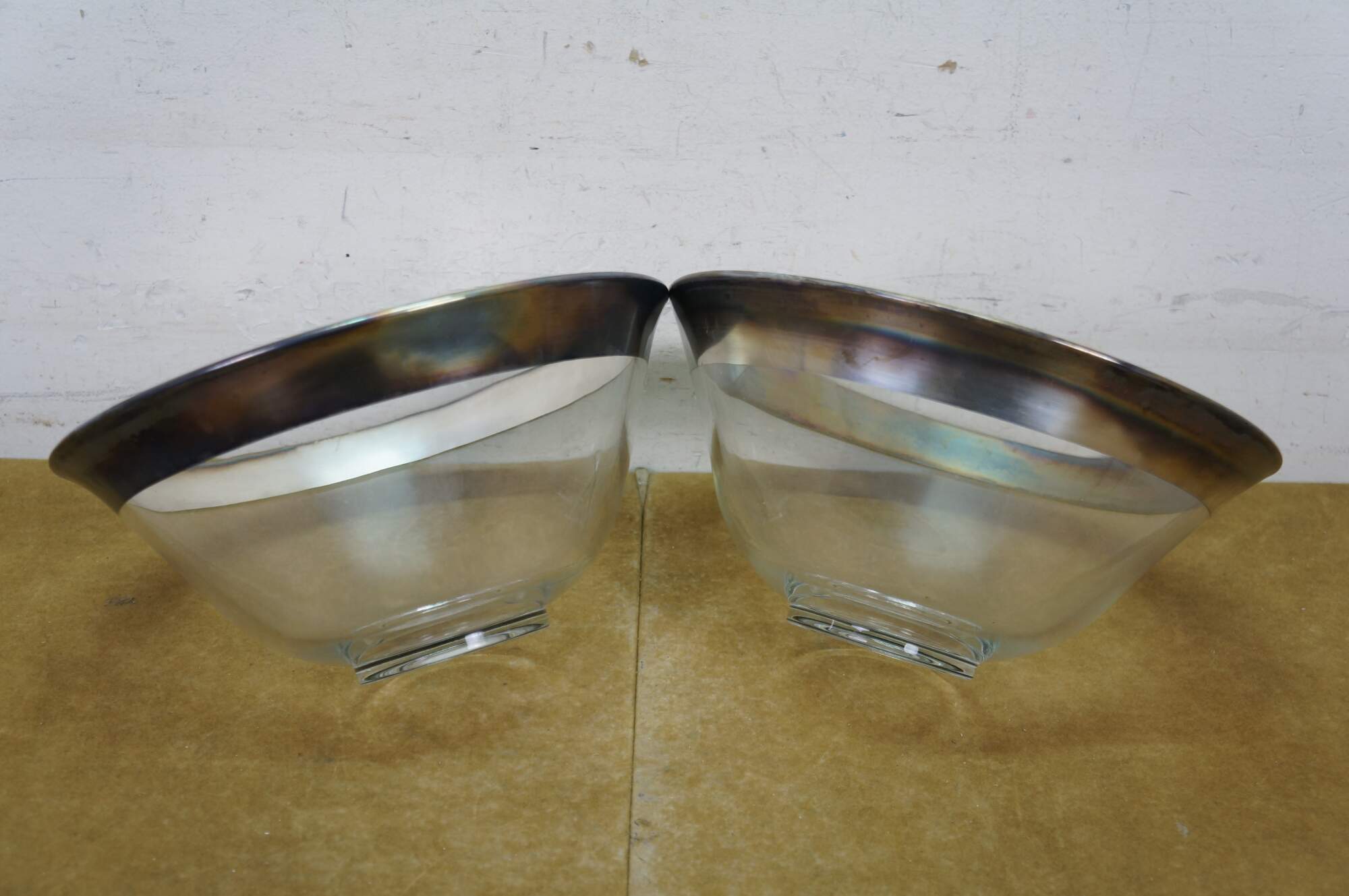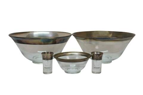 Mid century Dorothy Thorpe silver rim / banded chip and dip set with two large bowls, one small bowl and two shot glasses / toothpick holders.