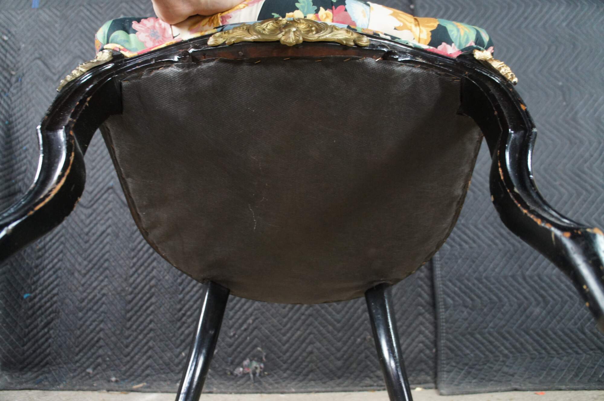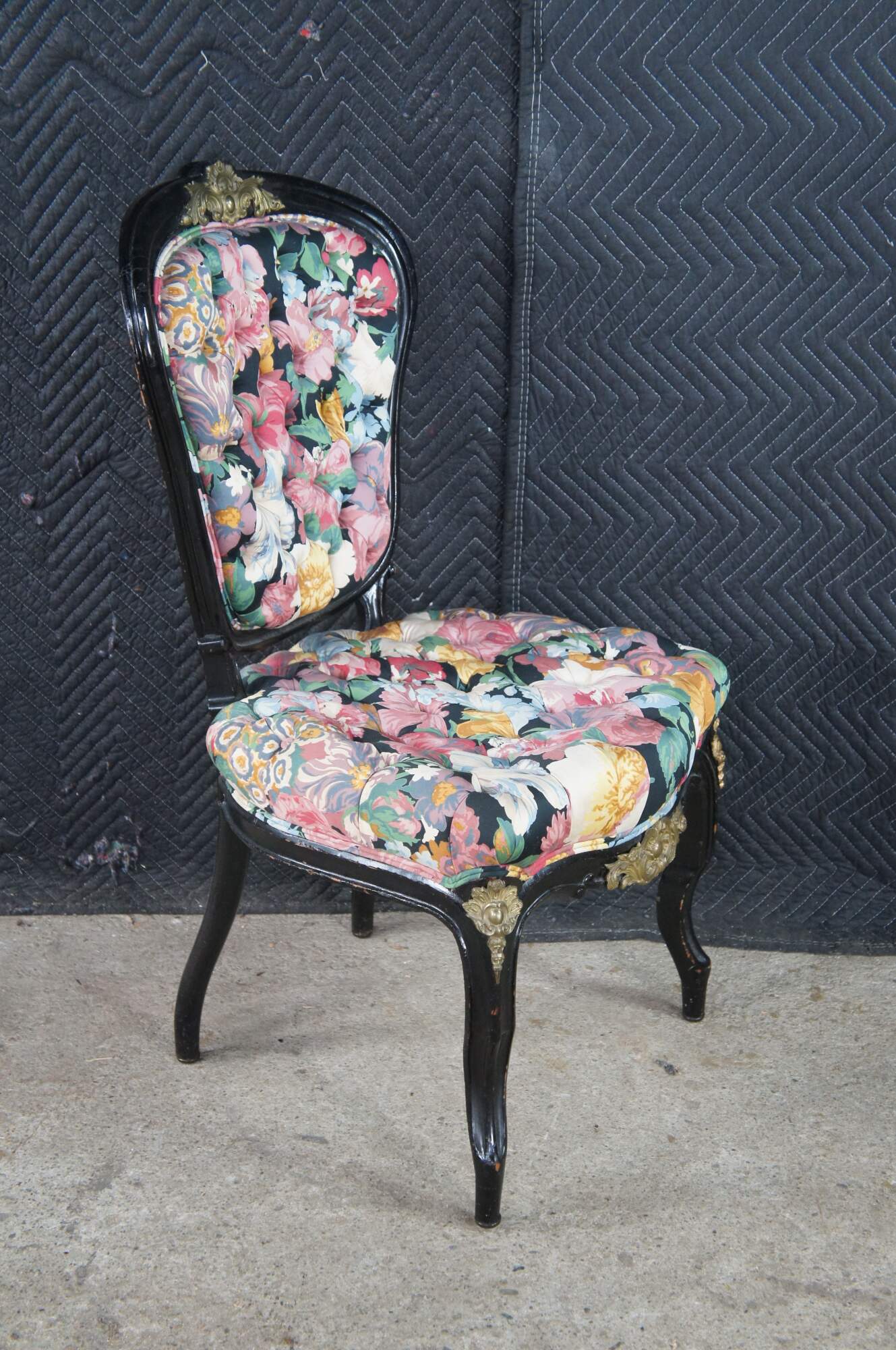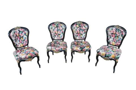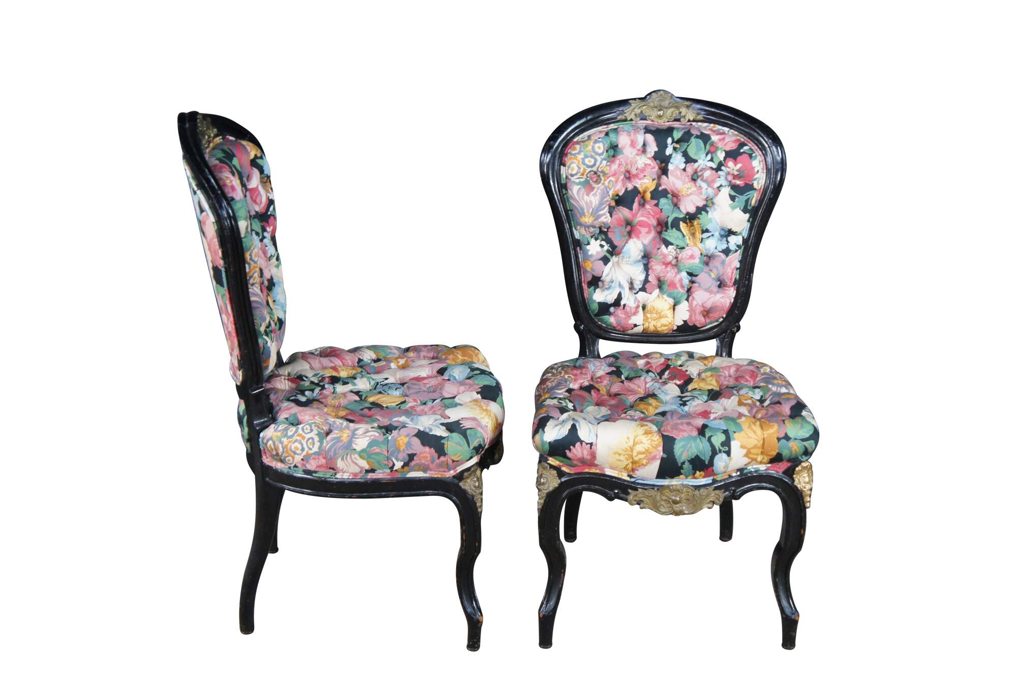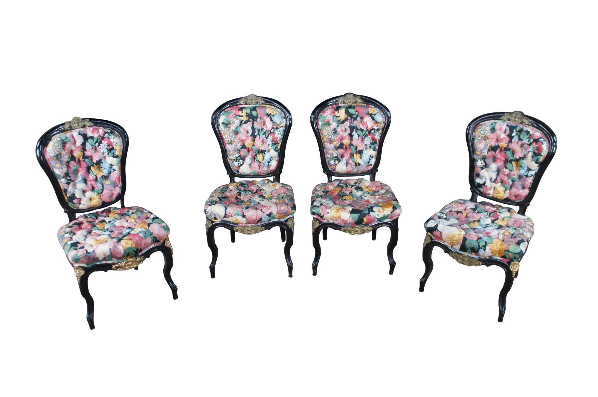 Set of four antique French Louis XV style dining chairs. Features an ebonized frame with Baroque ormolu mounts. The chairs are upholstered in Boussac tufted fabric. Includes 3 pillows.