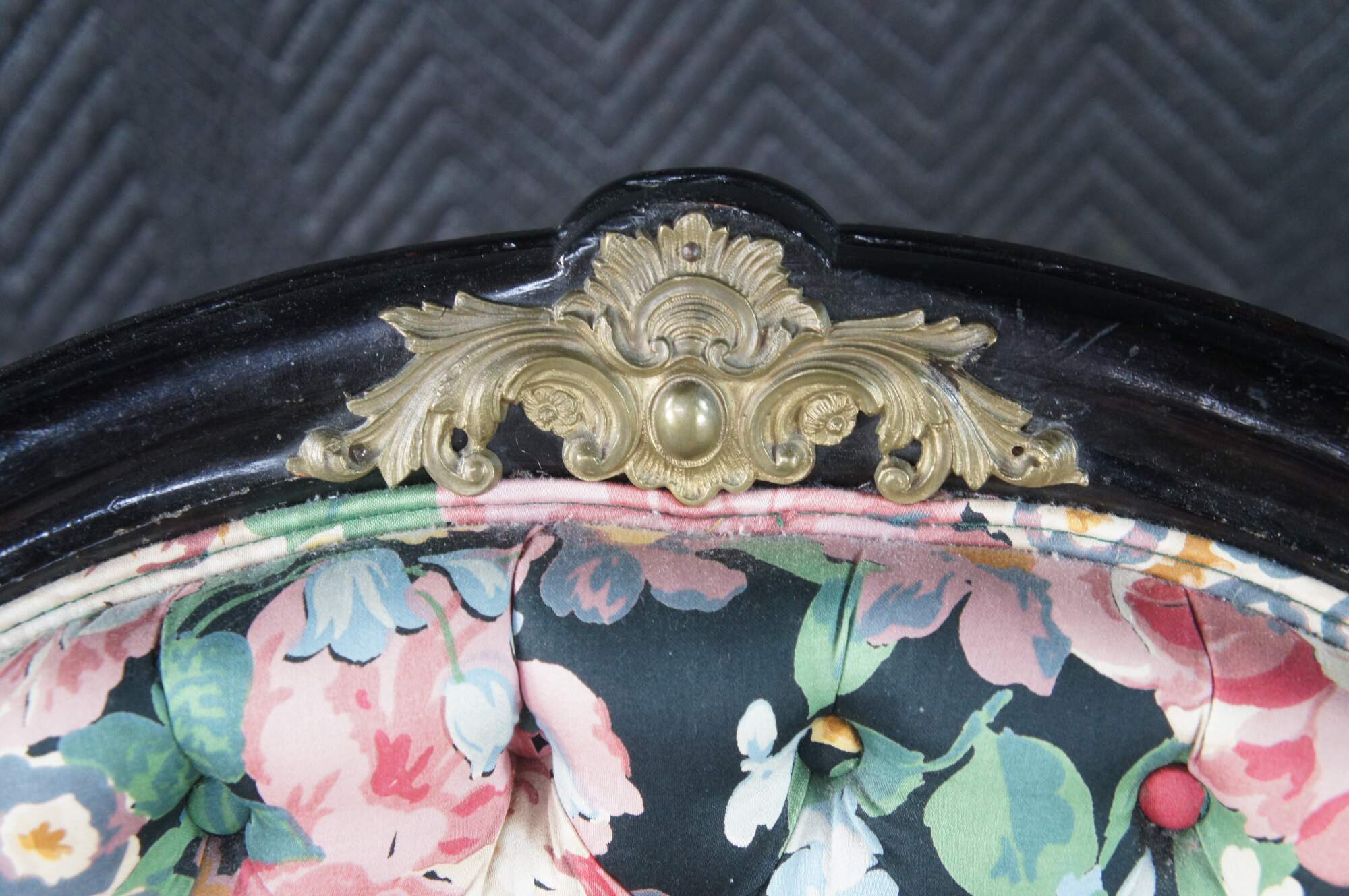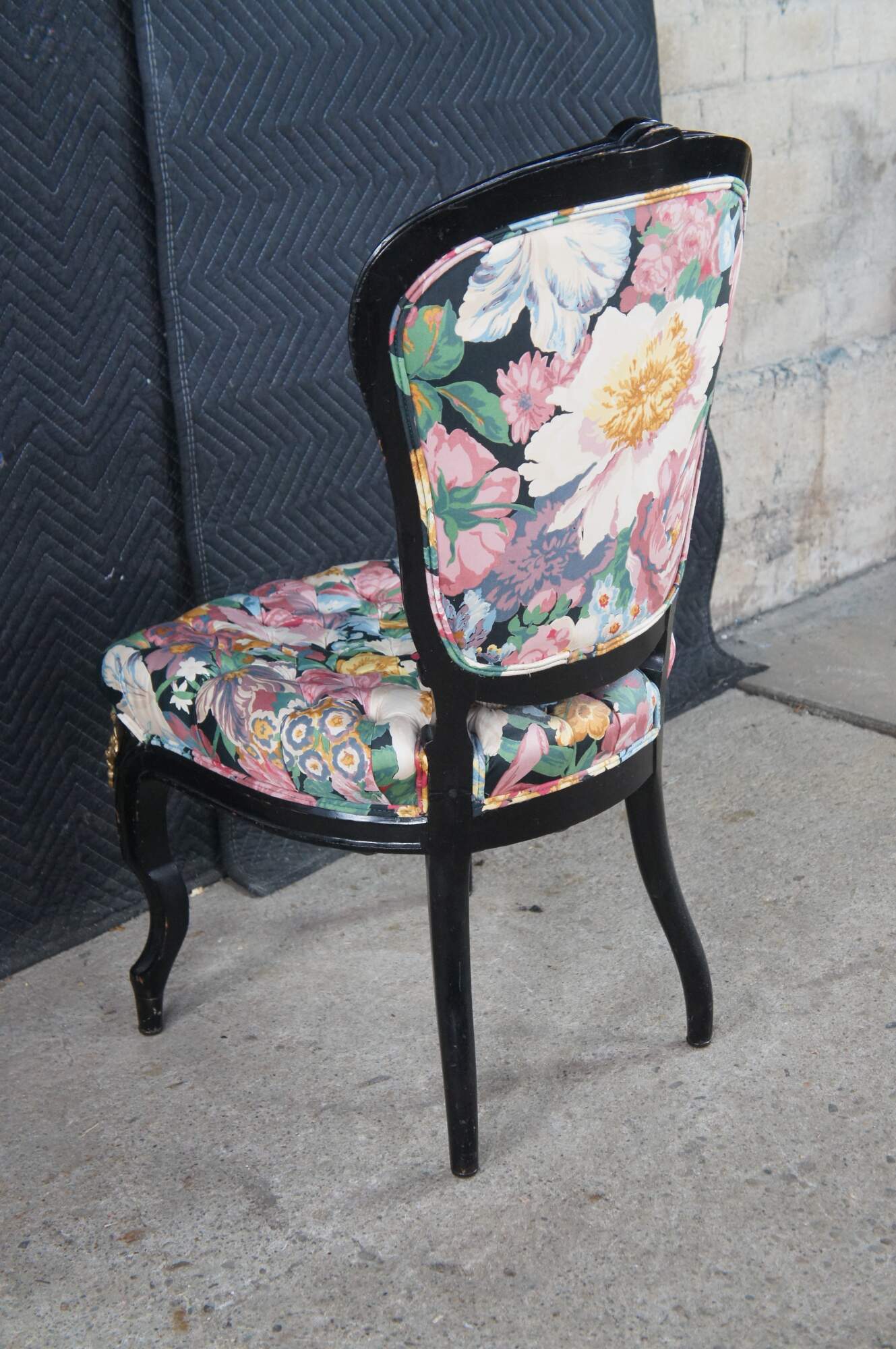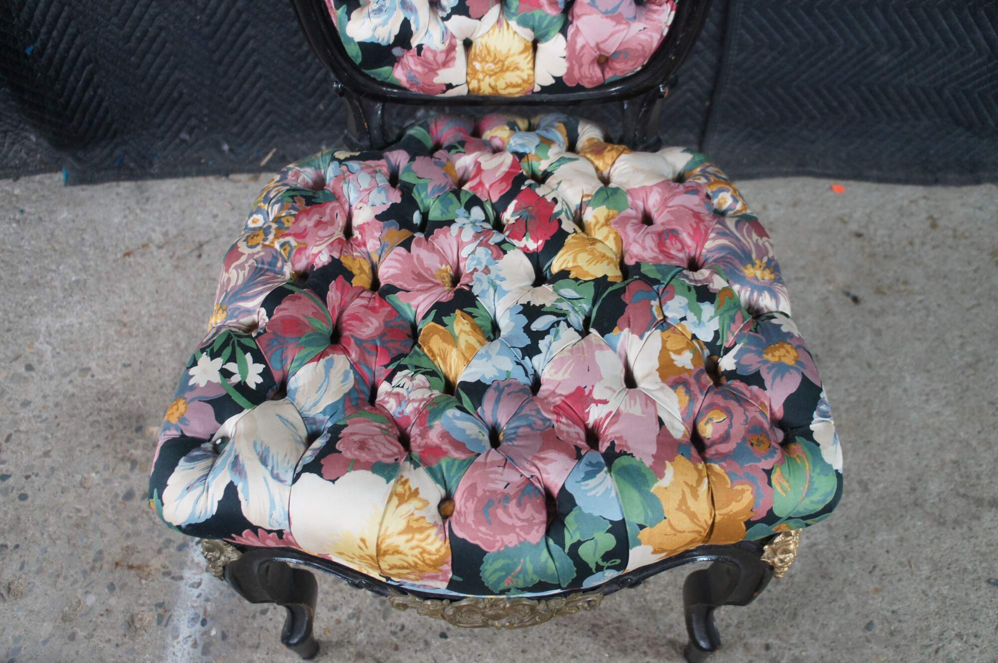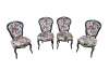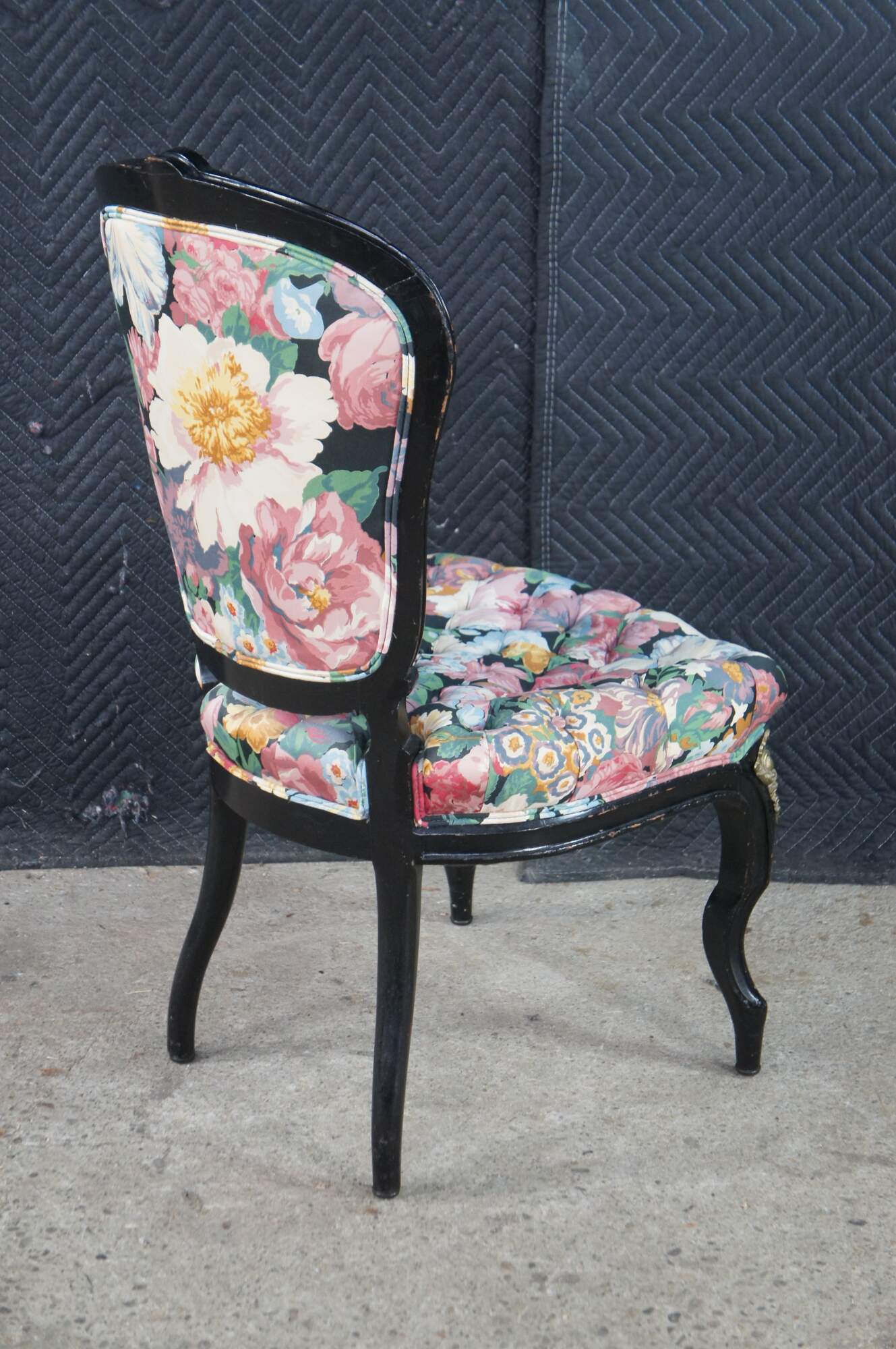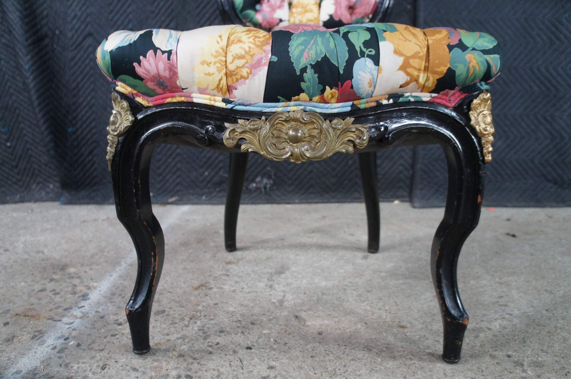 Set of four antique French Louis XV style dining chairs. Features an ebonized frame with Baroque ormolu mounts. The chairs are upholstered in Boussac tufted fabric. Includes 3 pillows.