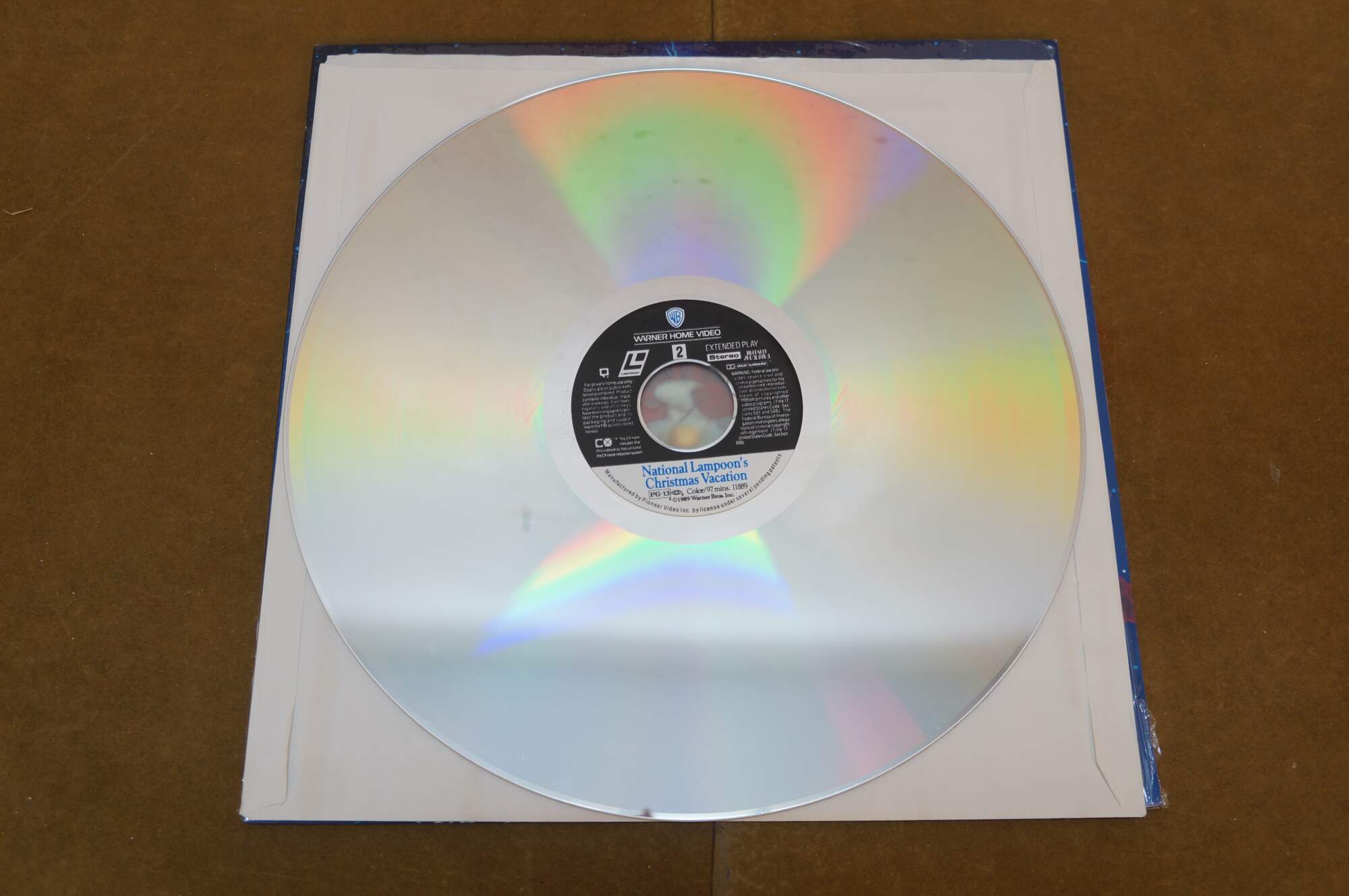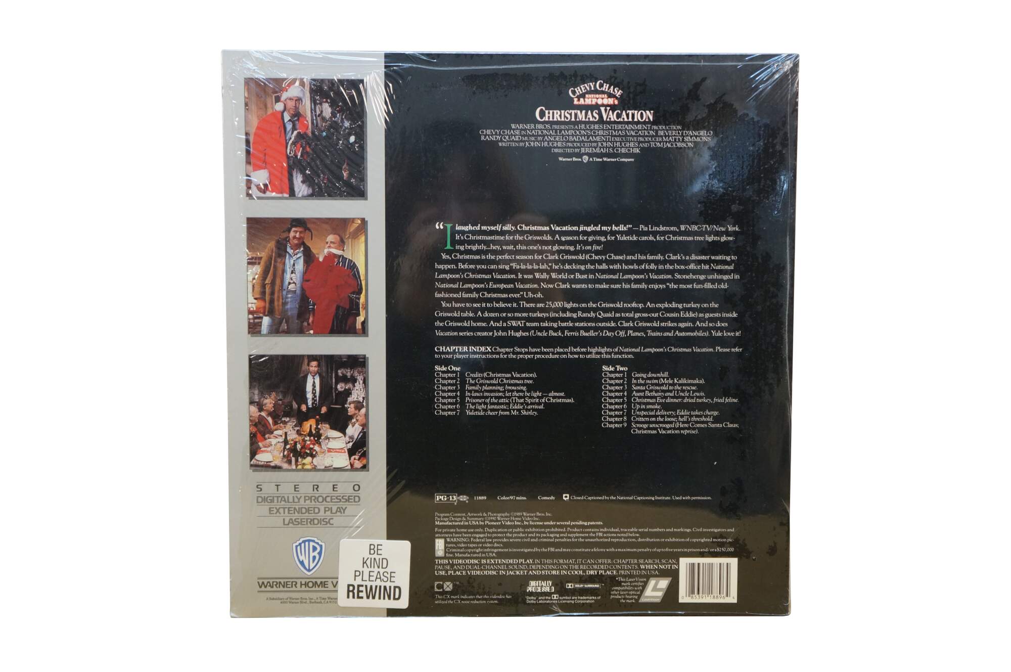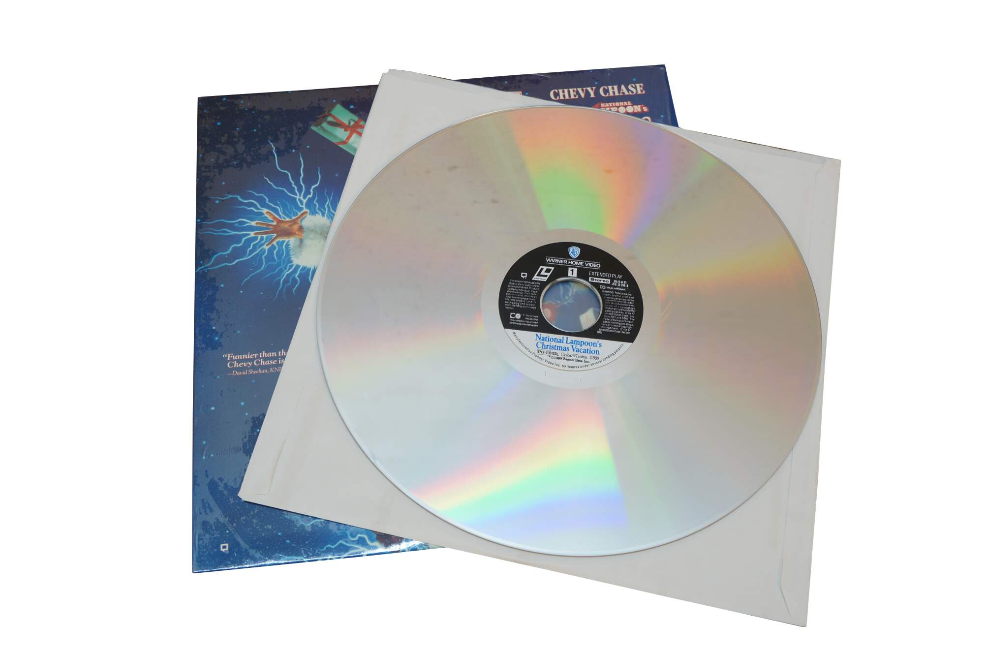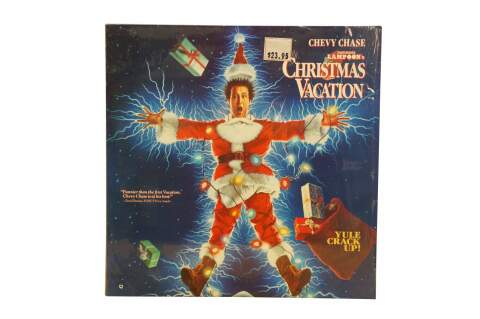Vintage National Lampoon's Christmas Vacation Laserdisc. It features the iconic cover art of Clark Griswold (Chevy Chase) entangled in Christmas lights. Released circa 1989 by Warner Home Video.