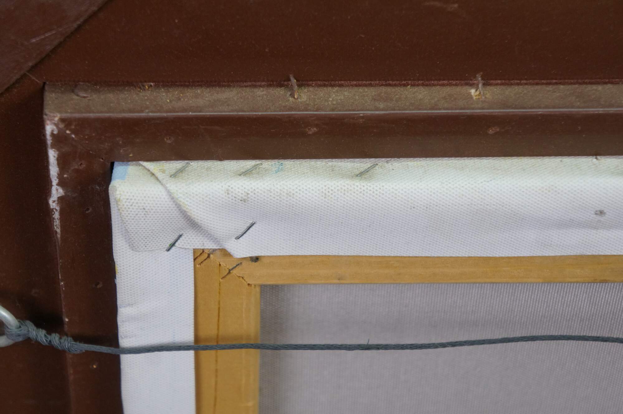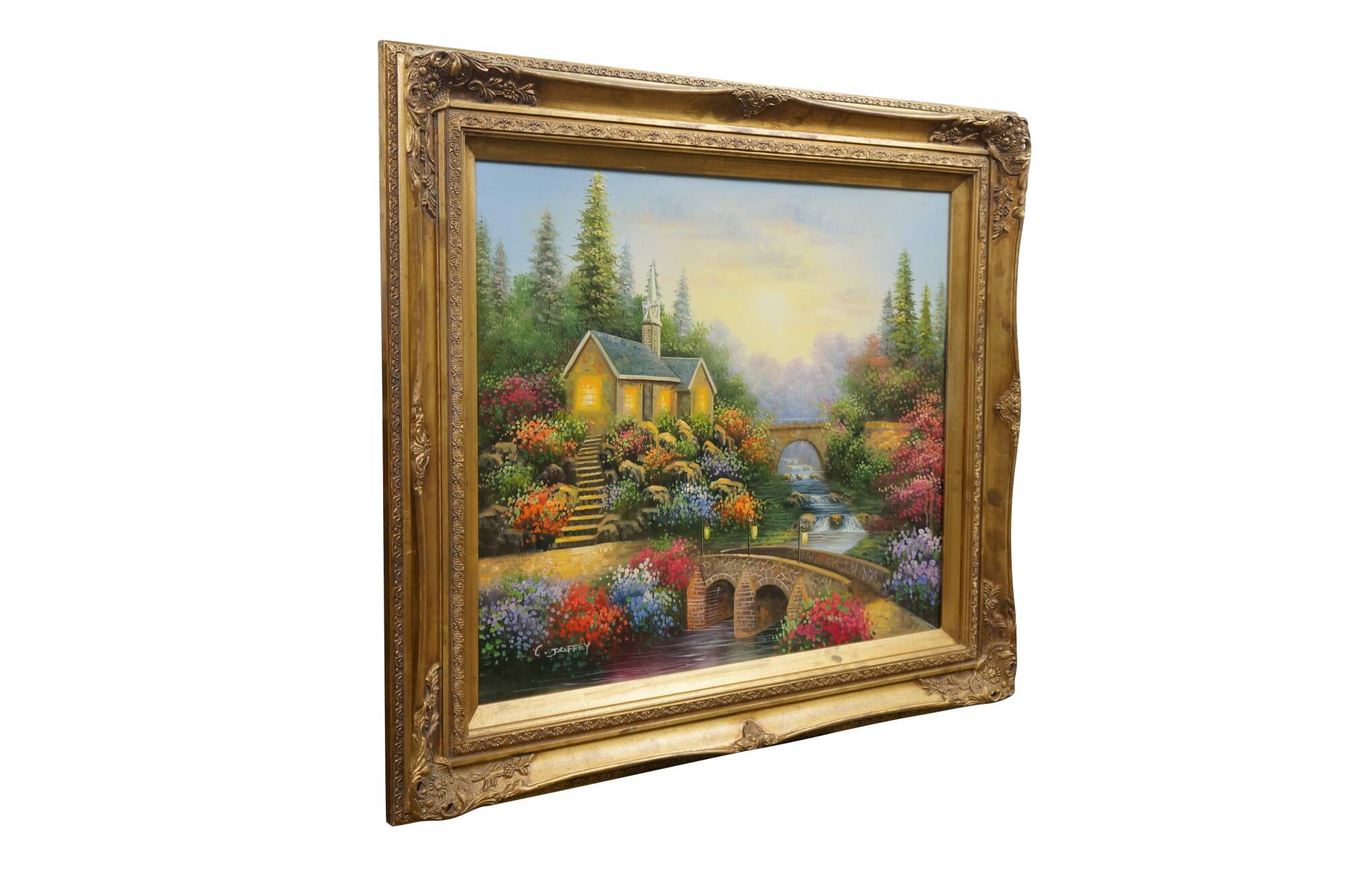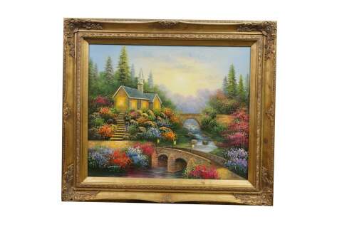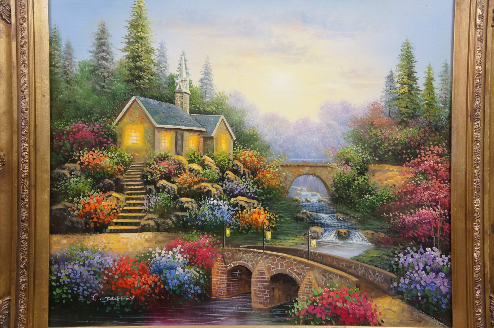 Vintage C. Jaffey oil painting on canvas featuring a serene, picturesque cottage scene with vibrant flowers and a flowing stream. A stone cottage sits on a hill with warm yellow light glowing from the windows. A stream of water cascades down rocks and passing under two stone bridges.� The surrounding area is lush with greenery and tall evergreen trees, all under a soft, bright sky. Framed in wood gold gesso frame.