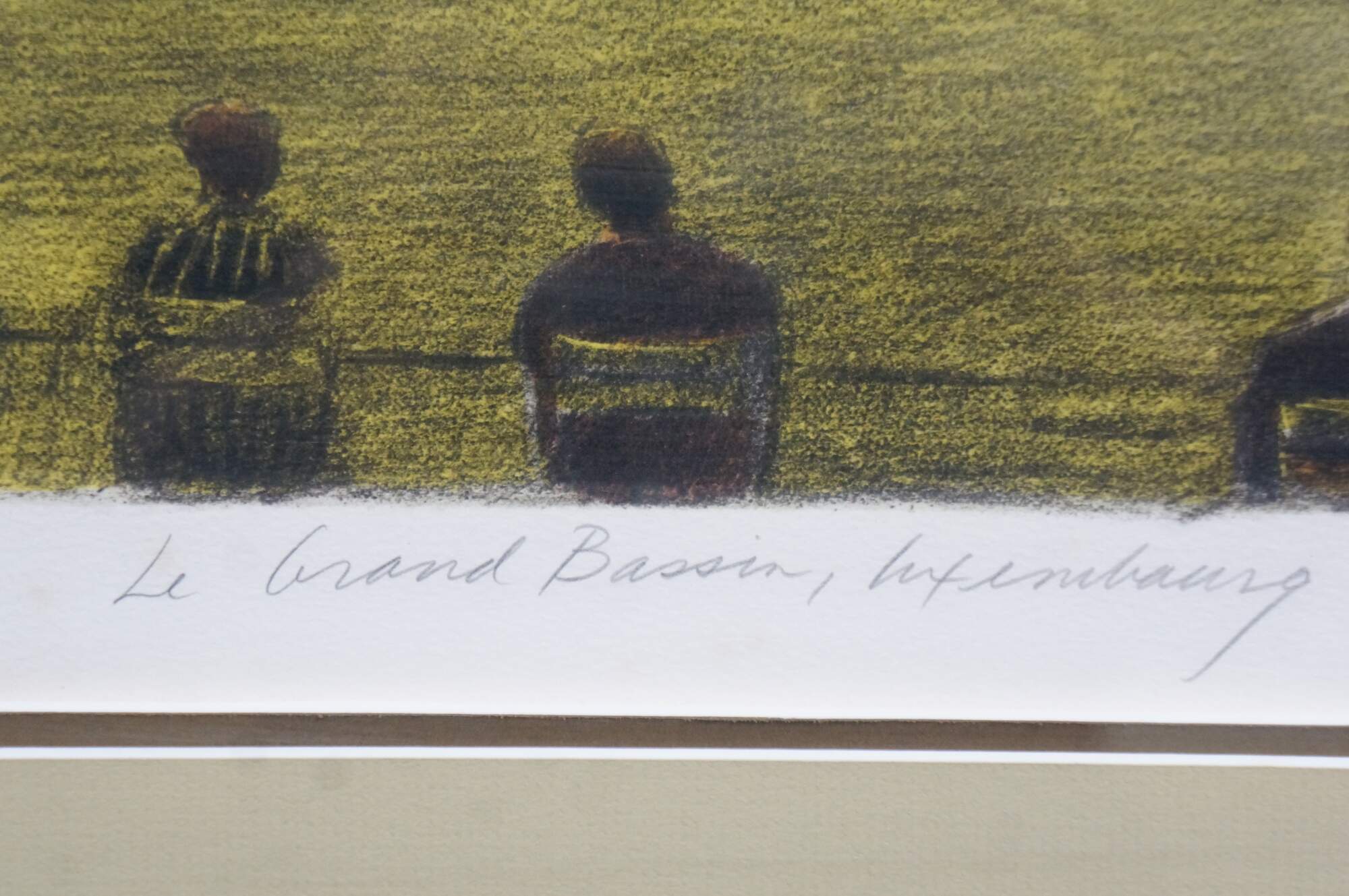 Vintage signed lithograph titled Le Grand Bassin, Luxembourg by American artist Harold Altman.� Harold Altman (1924–2003), a recognized American printmaker known for his park scenes. The artwork depicts the grand fountain pond in the Jardin du Luxembourg in Paris France. The print is hand signed and numbered by the artist. 84 / 285 circa 1983.