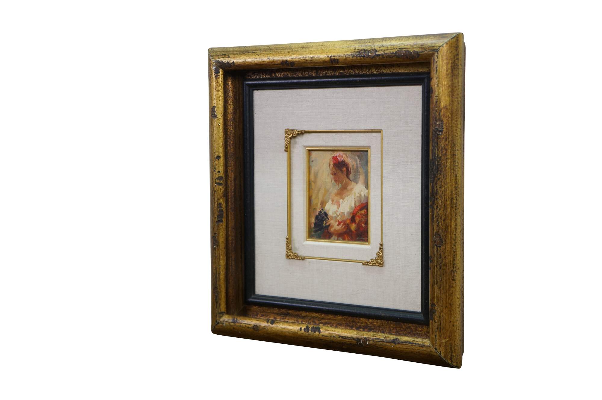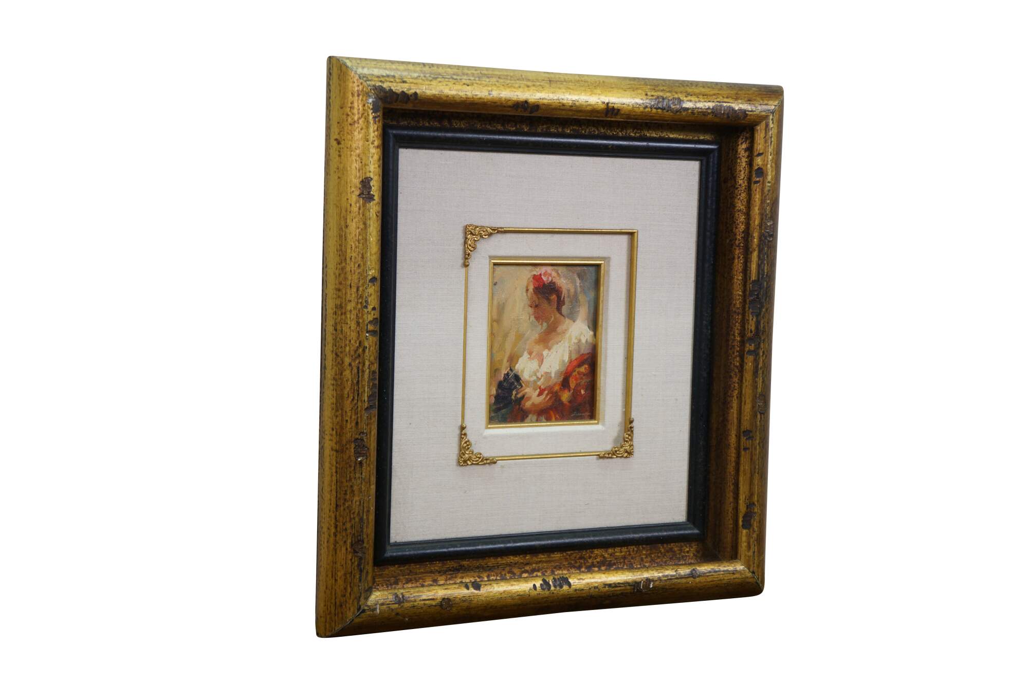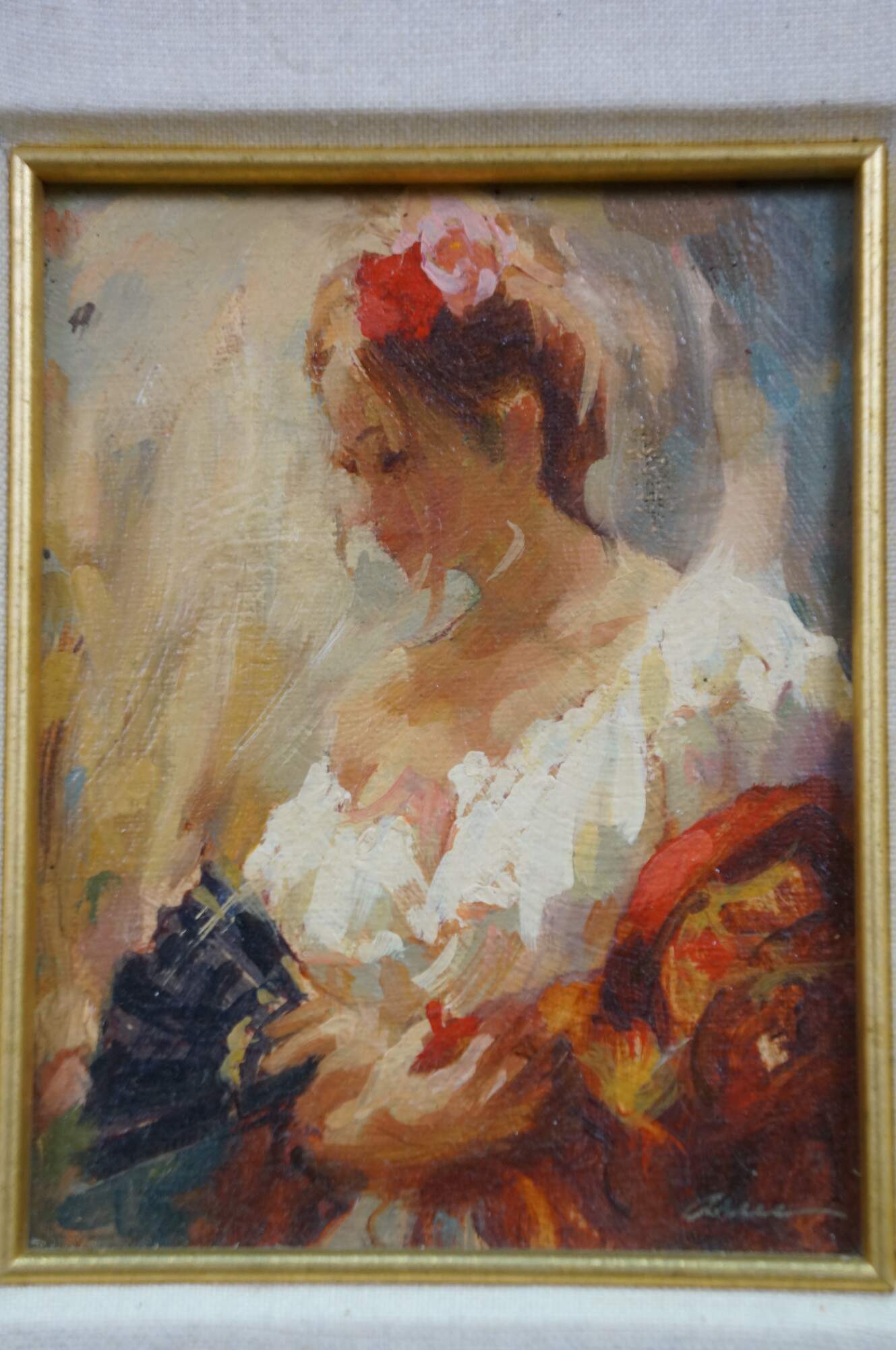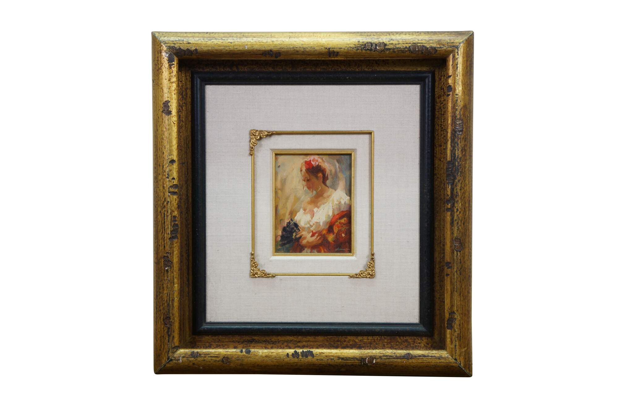 Vintage oil painting on board by Mark Arian titled Study XIX featuring a woman / ballerina / Spanish flamenco dancer holding a fan. Mark Arian is known as a contemporary painter of figurative art and dancers. The painting is done in a soft, impressionistic style with loose brushwork.