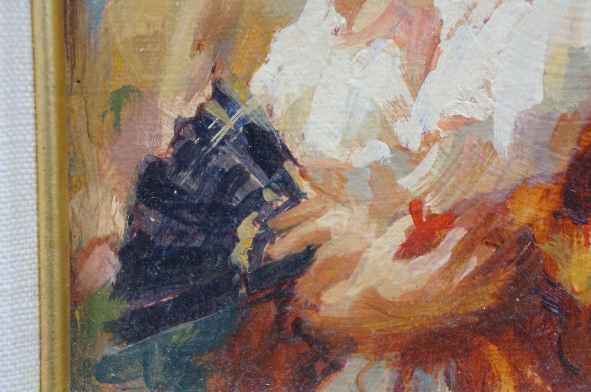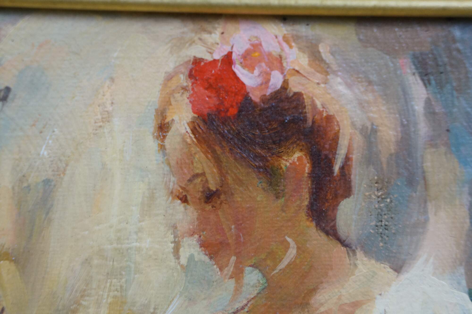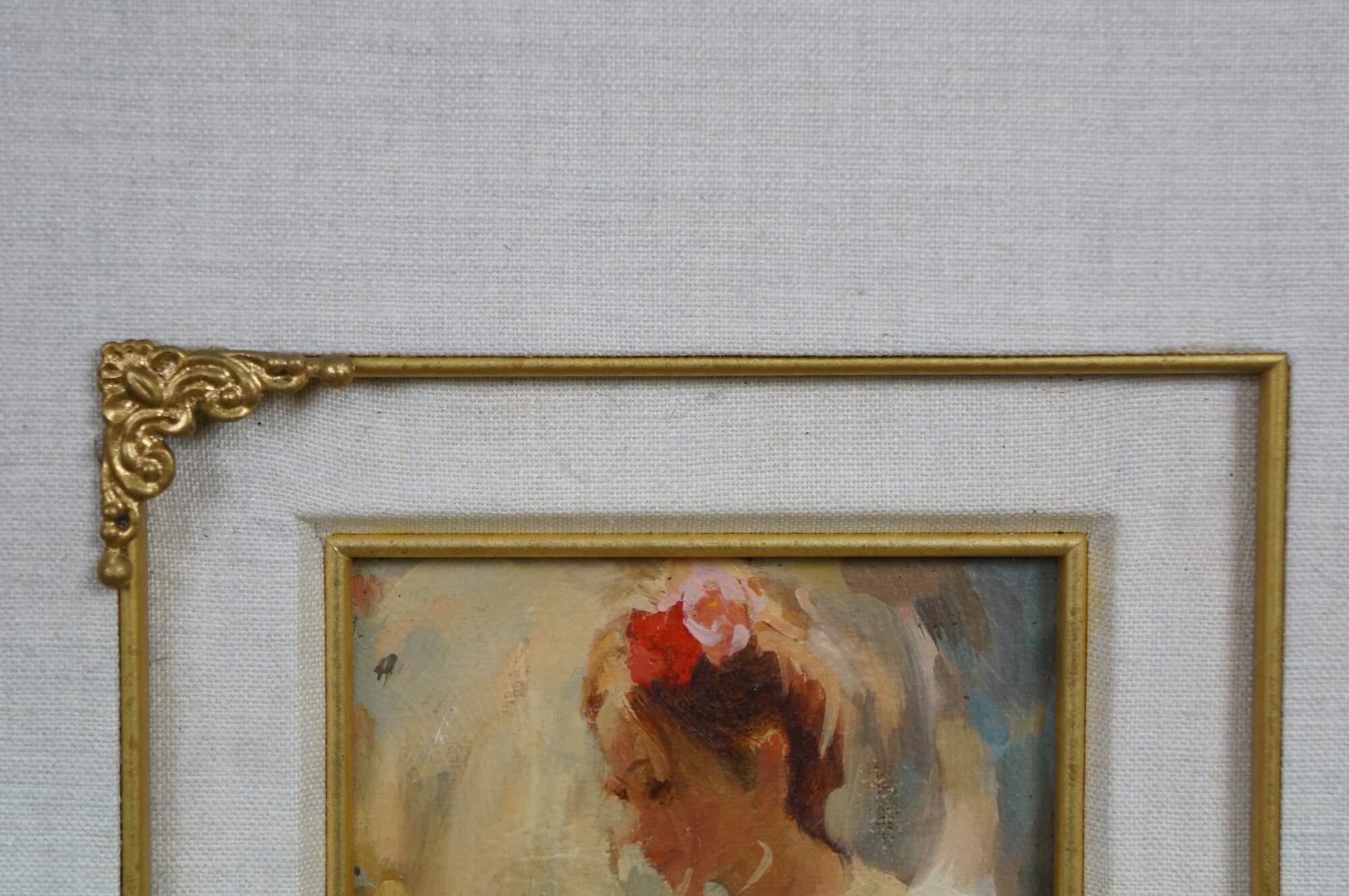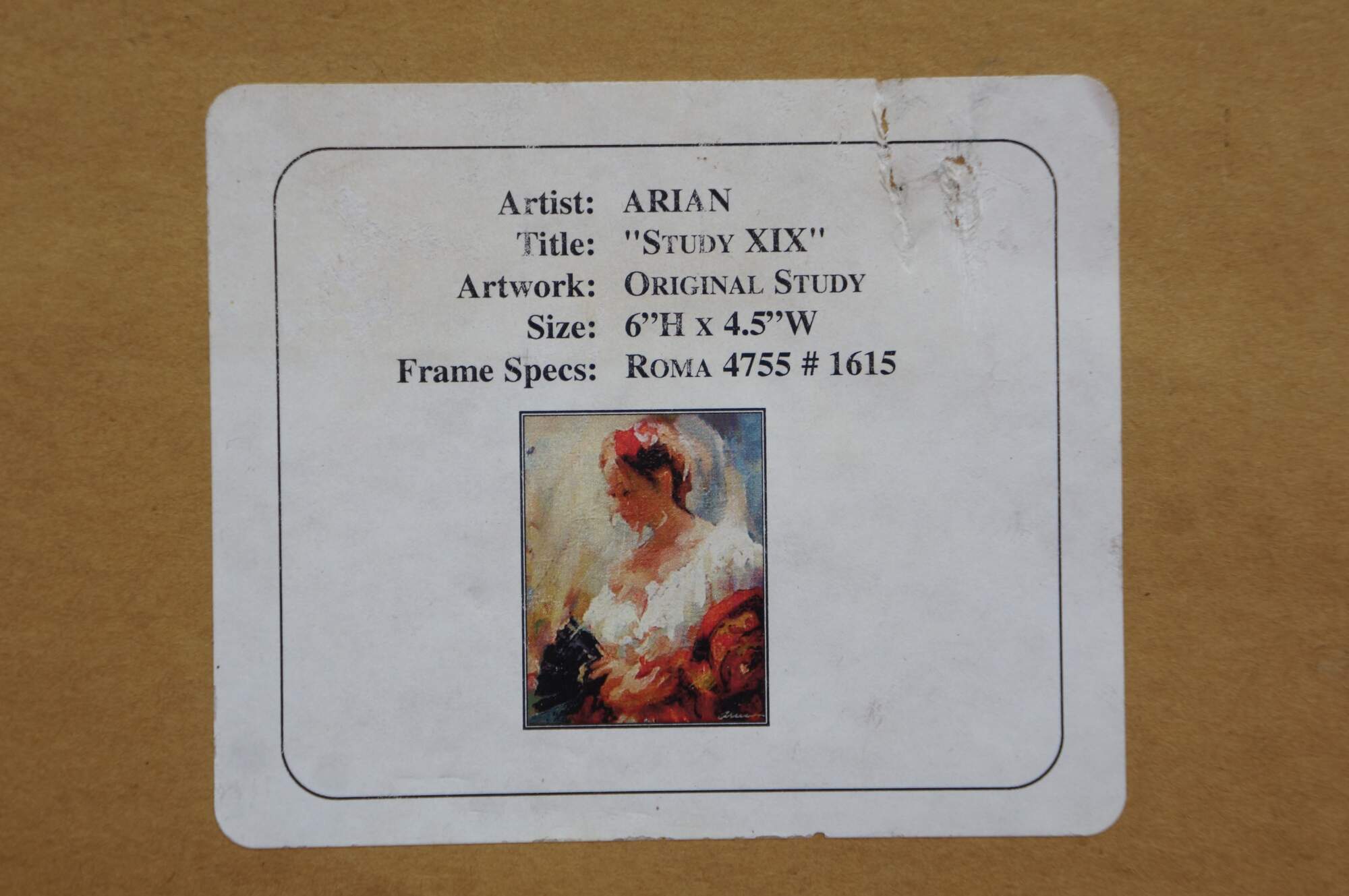 Vintage oil painting on board by Mark Arian titled Study XIX featuring a woman / ballerina / Spanish flamenco dancer holding a fan. Mark Arian is known as a contemporary painter of figurative art and dancers. The painting is done in a soft, impressionistic style with loose brushwork.