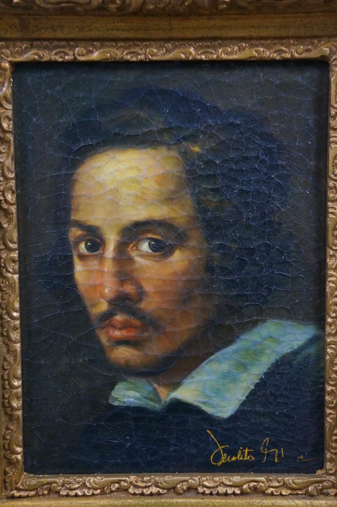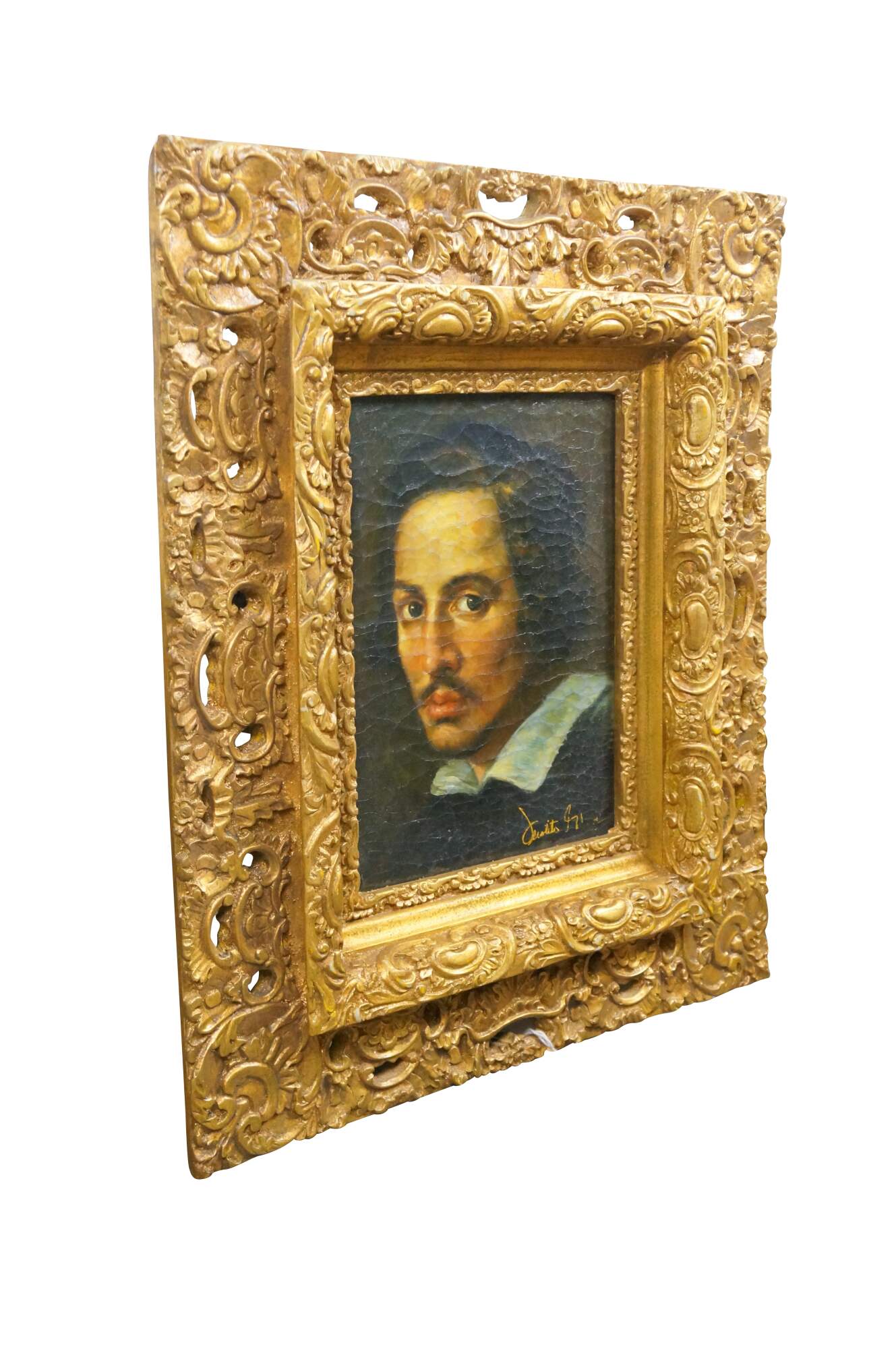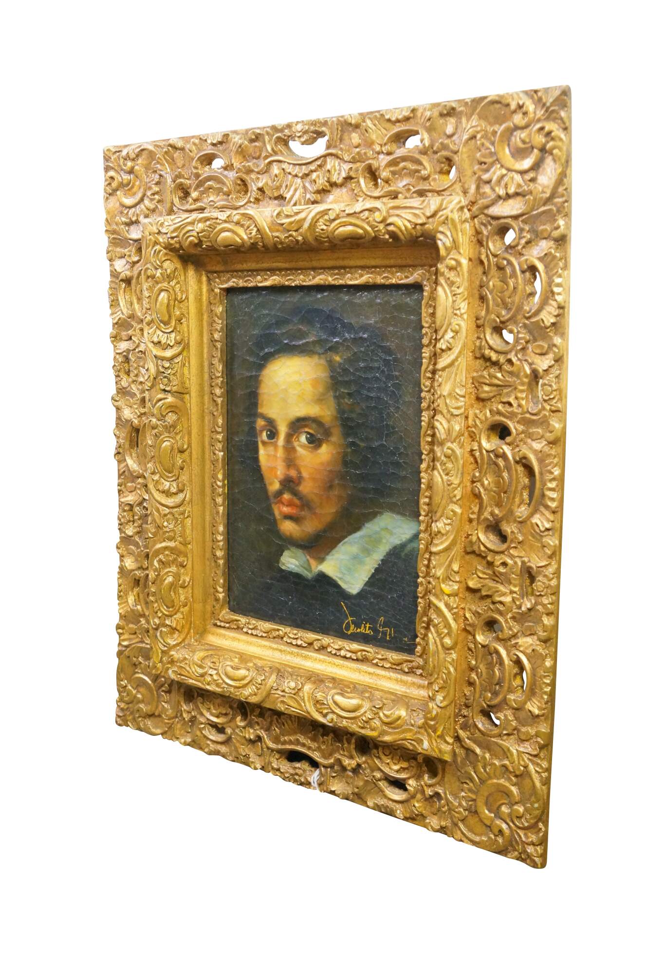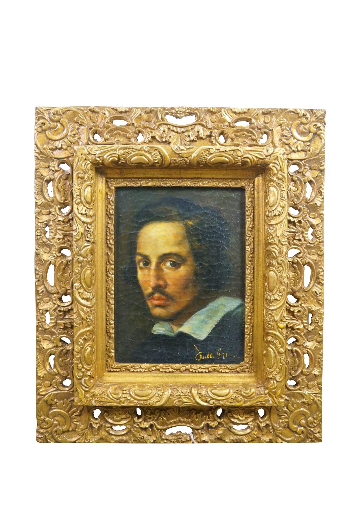 Vintage oil painting on linen after a self-portrait created by the Italian artist Gian Lorenzo Bernini.� The painting is a self-portrait depicting the artist as a young man.� Originally painted in 1623 and housed in Galleria Borghese in Rome. Baroque gold reticulated acanthus resin molded frame.