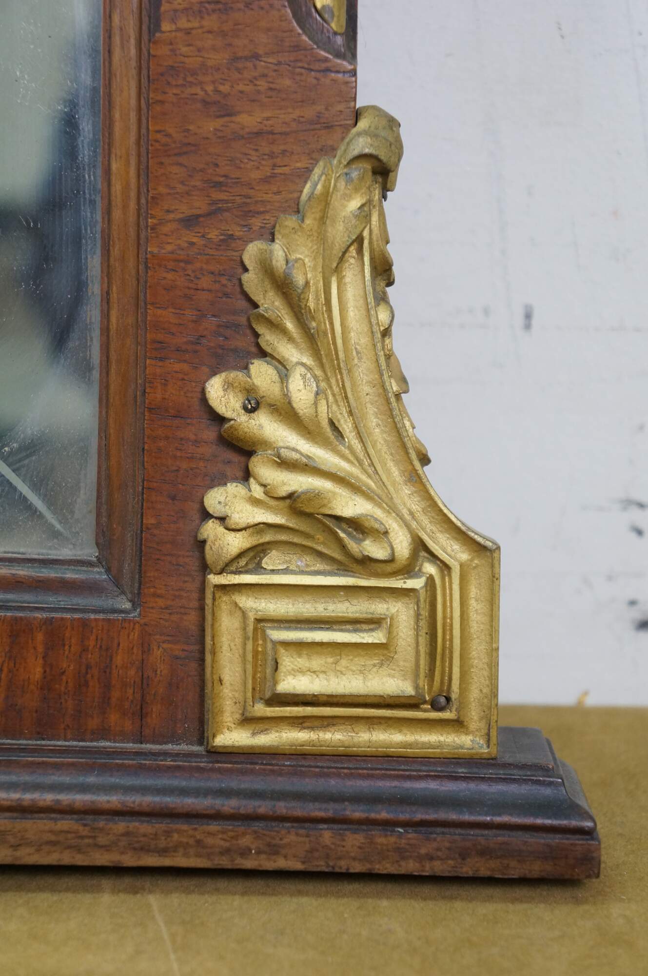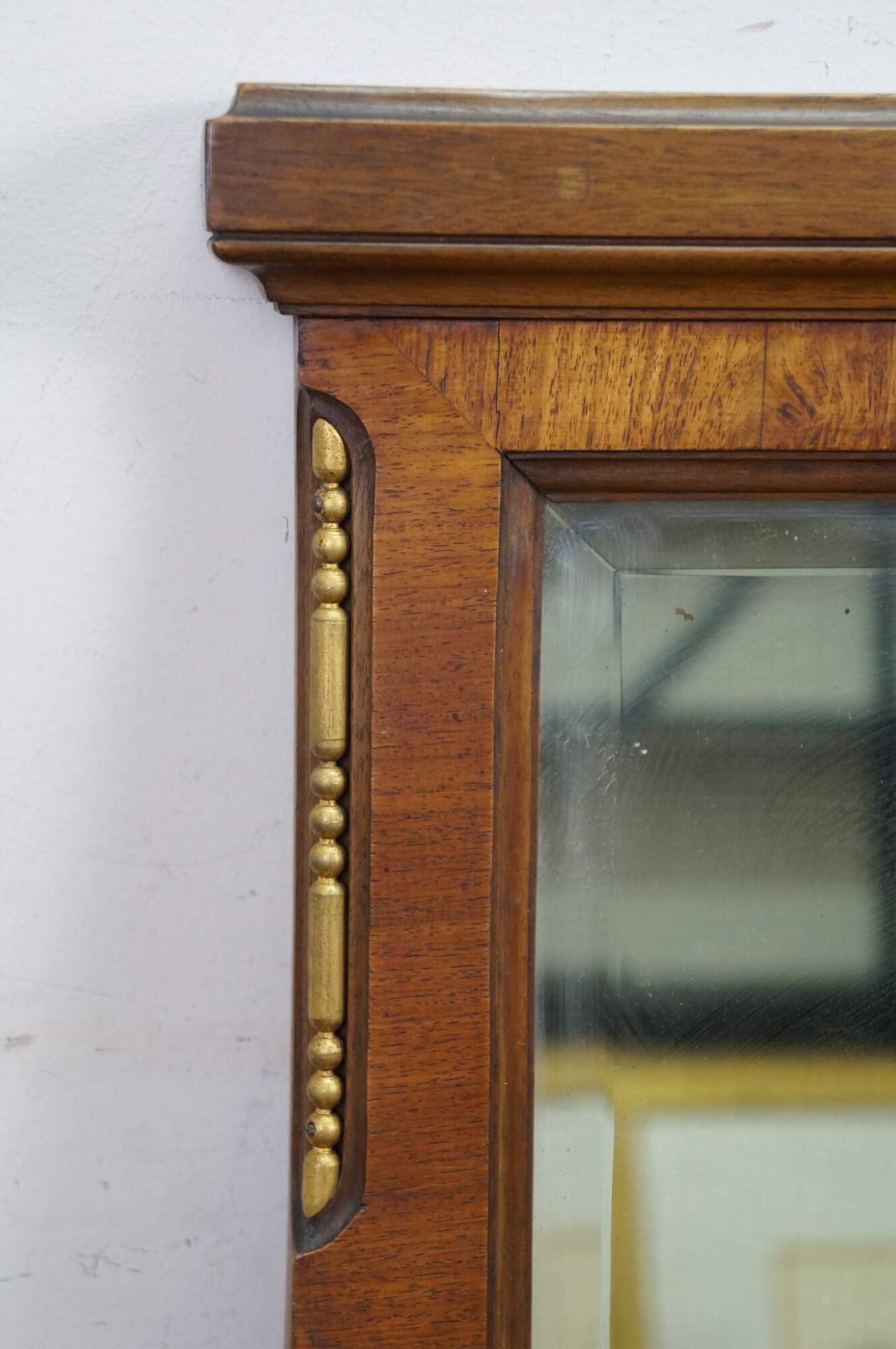 Antique Victorian Empire style mahogany mantel mirror with gold gilded decorative mounts, ornate central crest, acanthus accents, and beveled mirror.