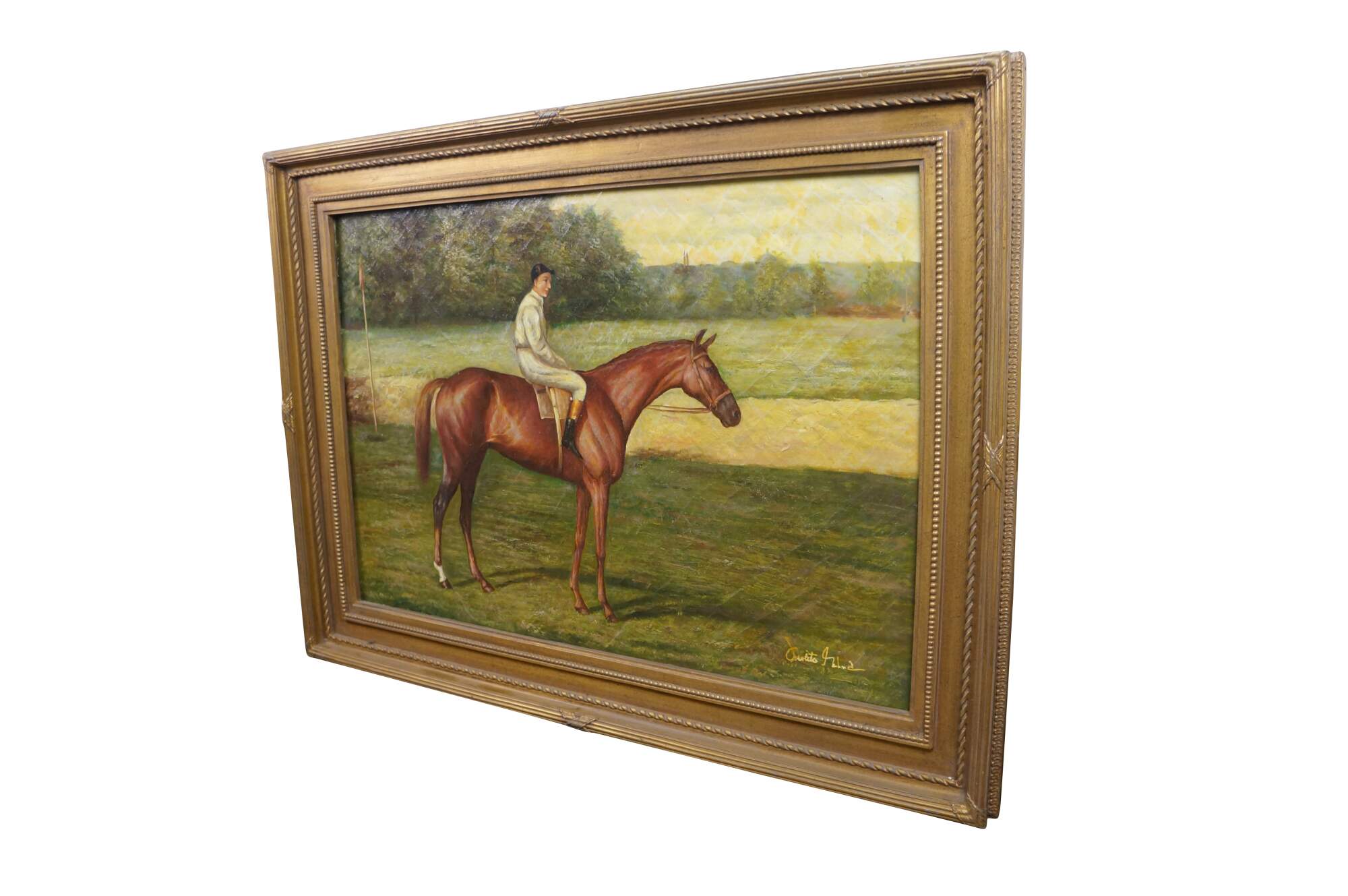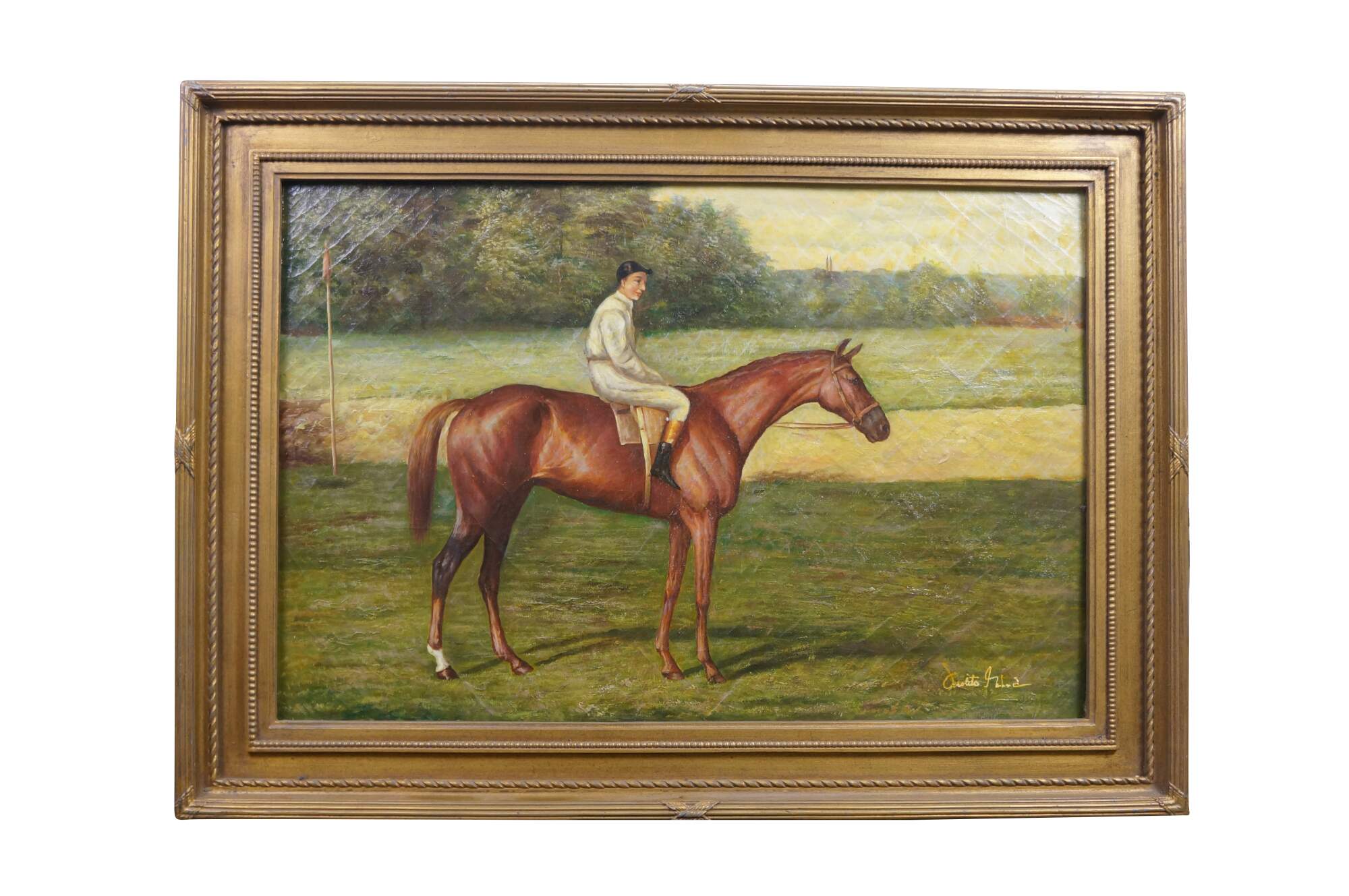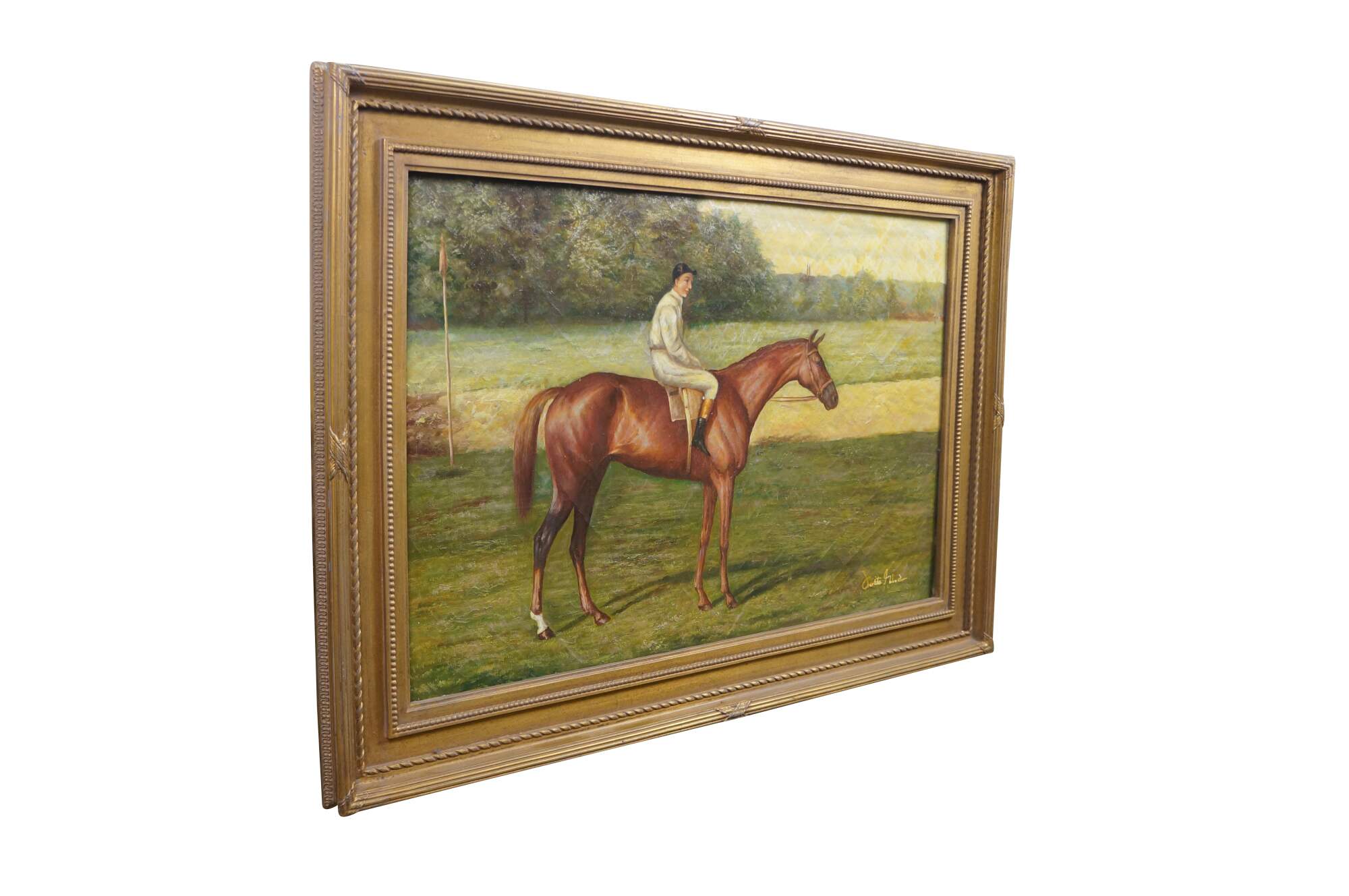 A large late 20th century equestrian landscape oil painting on linen of a Chestnut Racehorse after work by Allen Culpepper Sealy. Depicts a chestnut colored racehorse with one white sock on a hind leg, with a jockey in white riding him. Signed in lower right corner. Neoclassical gold composite Frame.