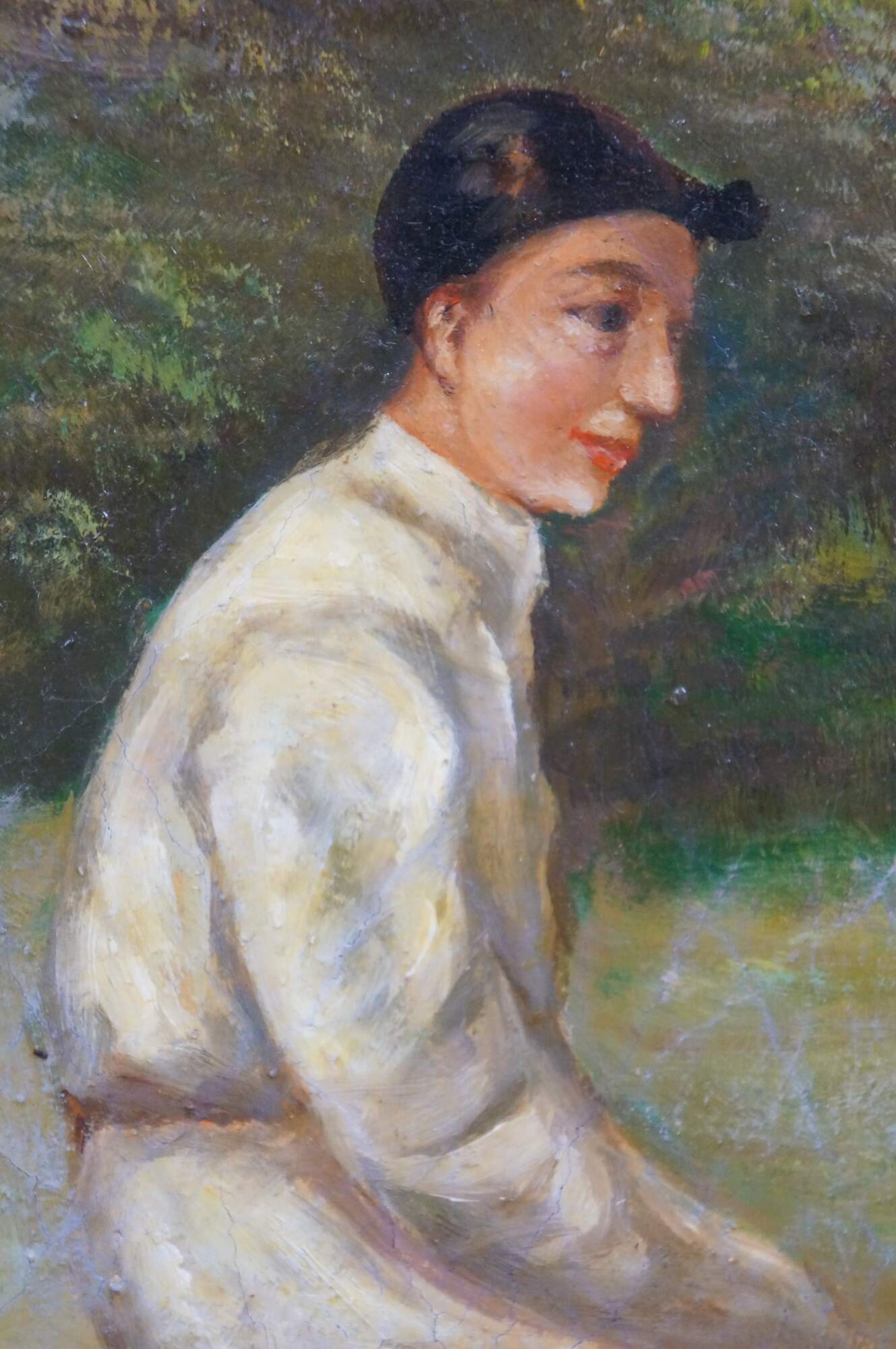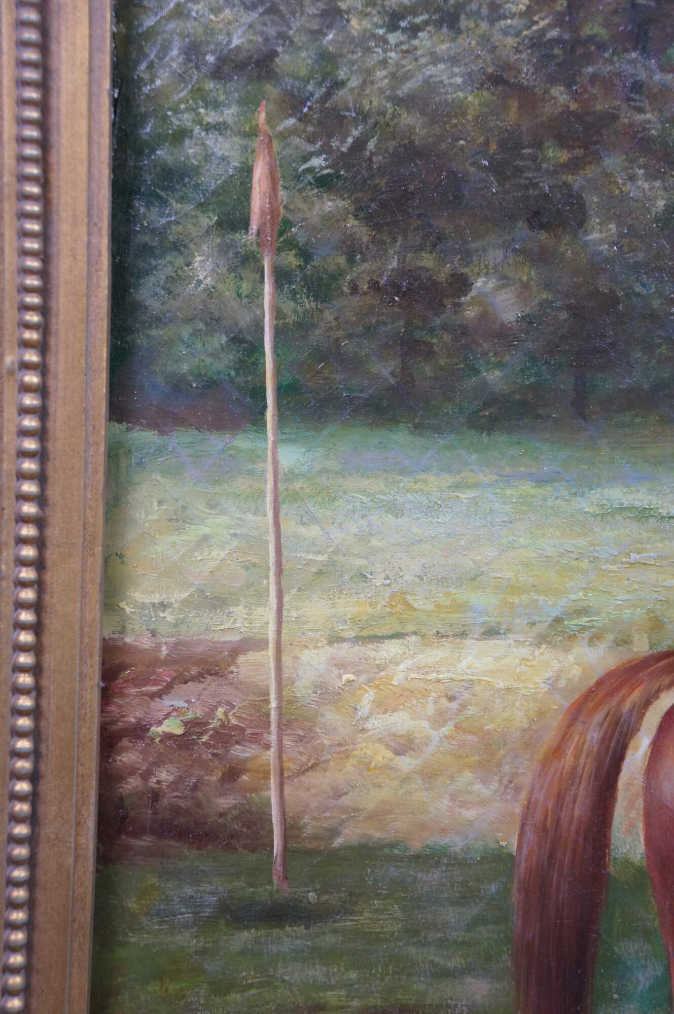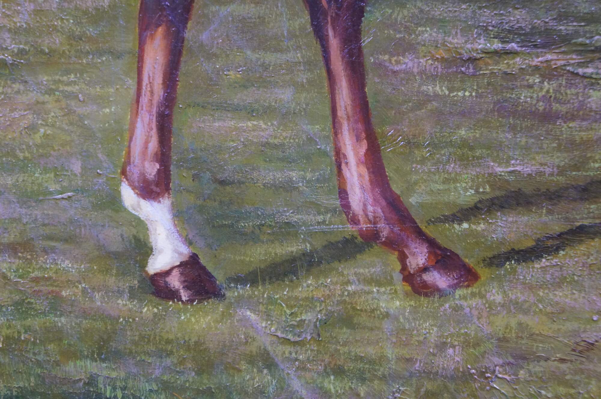 A large late 20th century equestrian landscape oil painting on linen of a Chestnut Racehorse after work by Allen Culpepper Sealy. Depicts a chestnut colored racehorse with one white sock on a hind leg, with a jockey in white riding him. Signed in lower right corner. Neoclassical gold composite Frame.