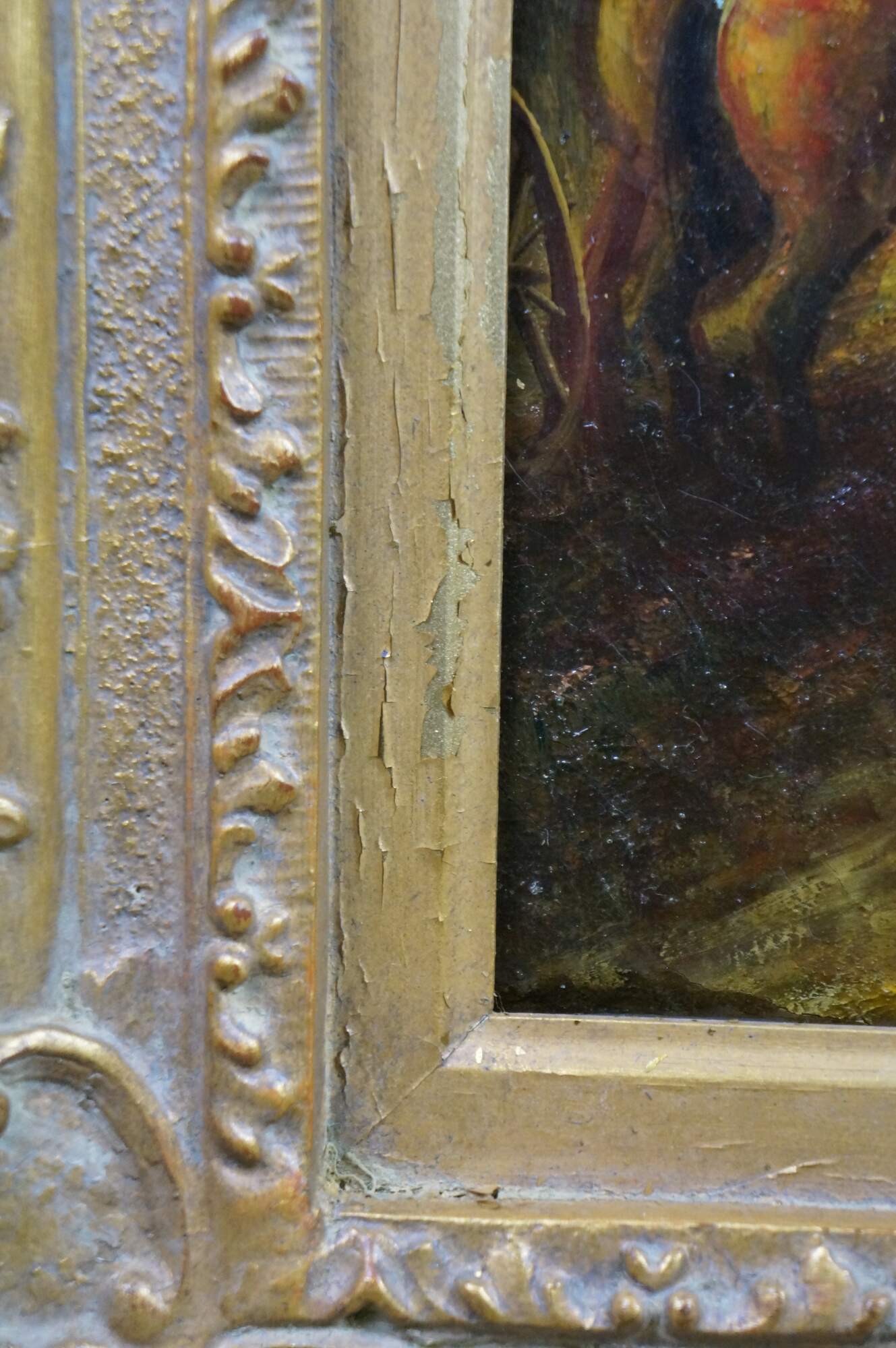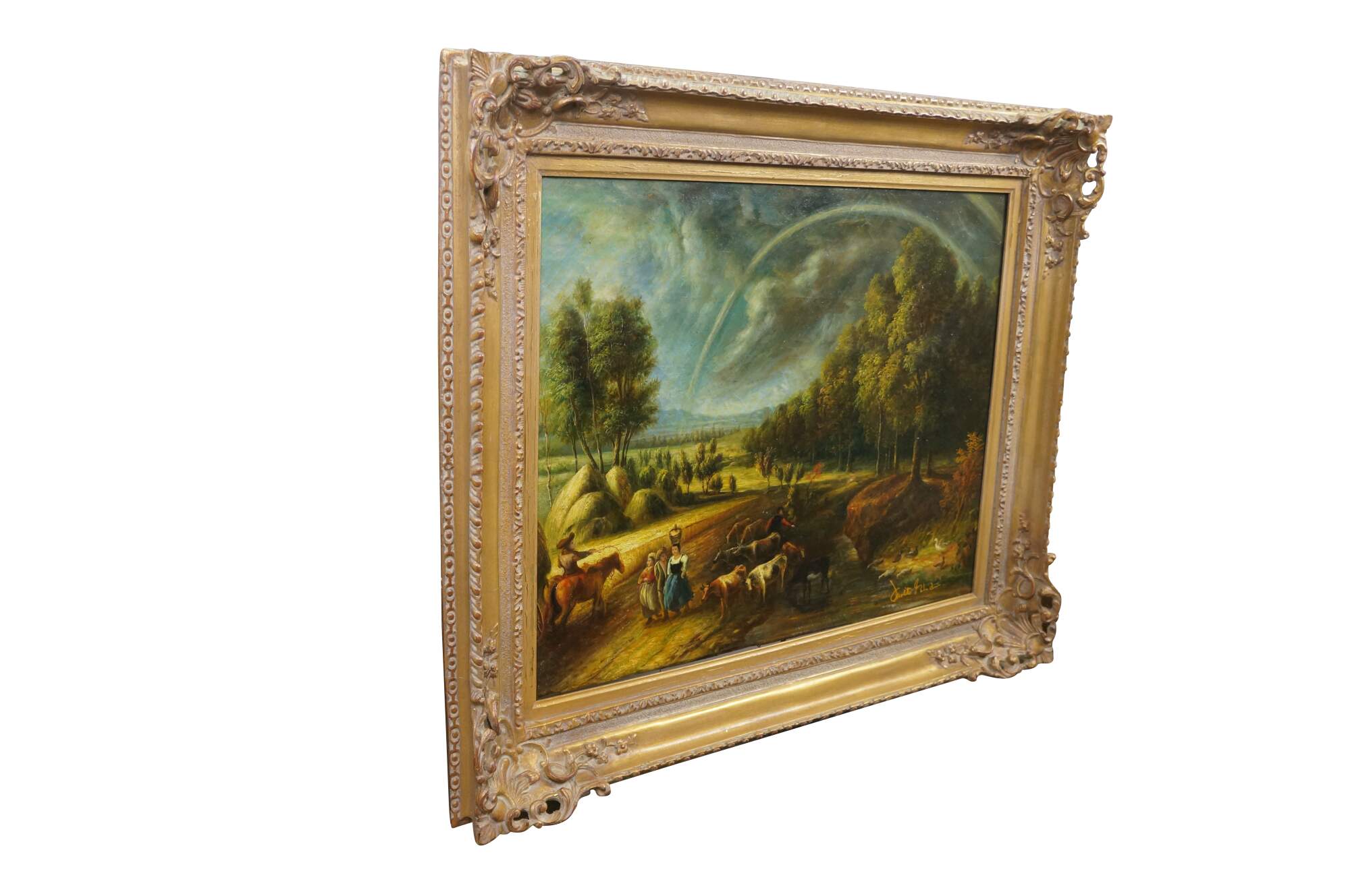 Vintage landscape oil painting on canvas after Peter Paul Rubens. The painting depicts a scene from his country estate, Het Steen, during a late summer afternoon. The scene famously shows a large Rainbow after a storm. Baroque wood frame.