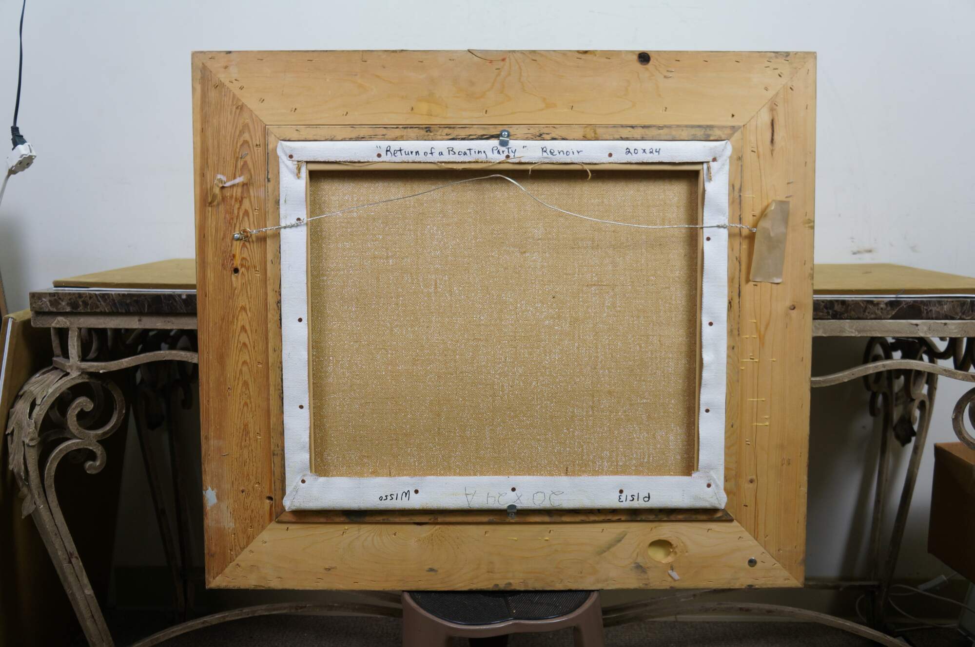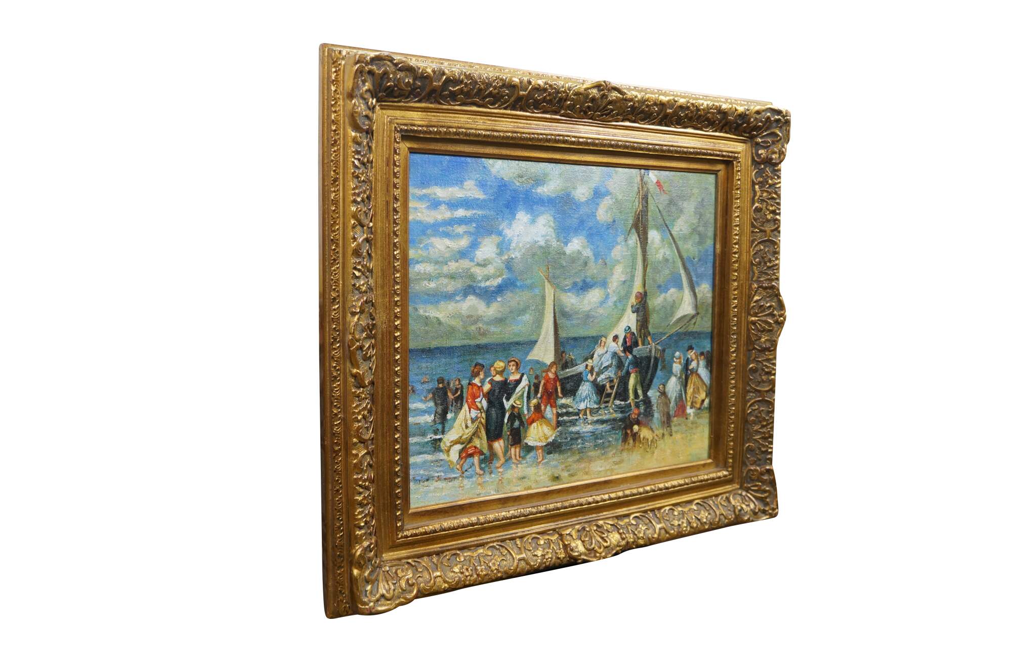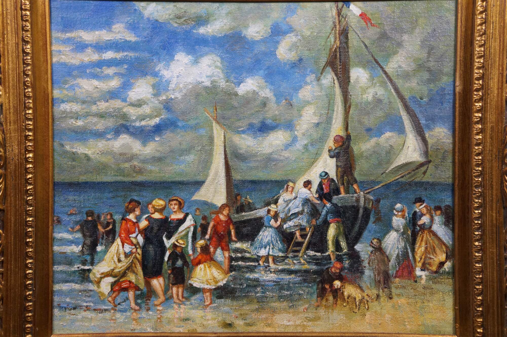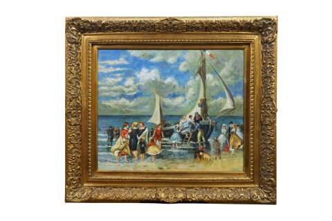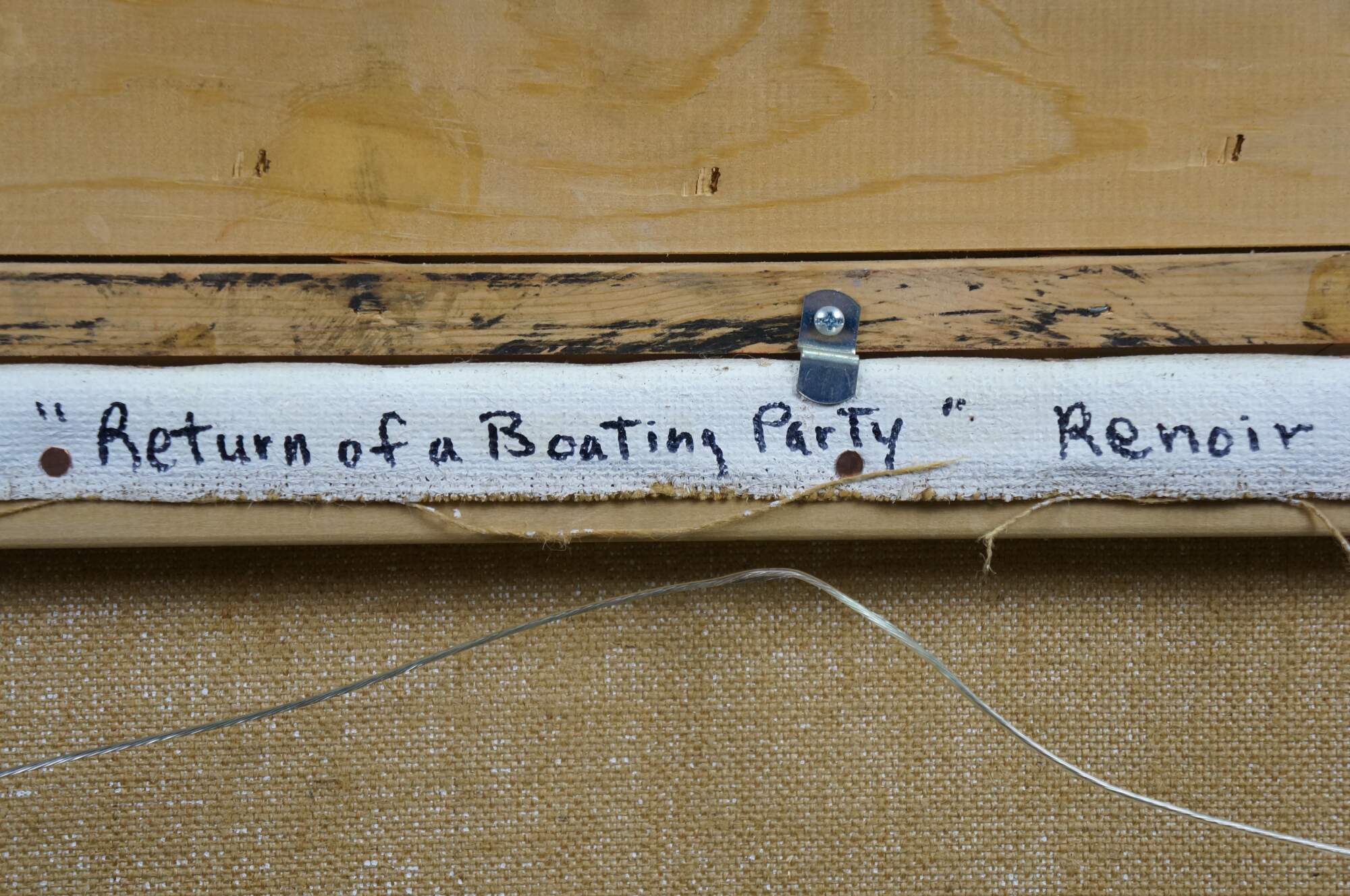 Vintage nautical / maritime / seascape oil painting on canvas titled The Return of the Boating Party after Pierre-Auguste Renoir. Originally painted around 1862, this work depicts a beach scene with figures unloading from the sailboat onto the shore.