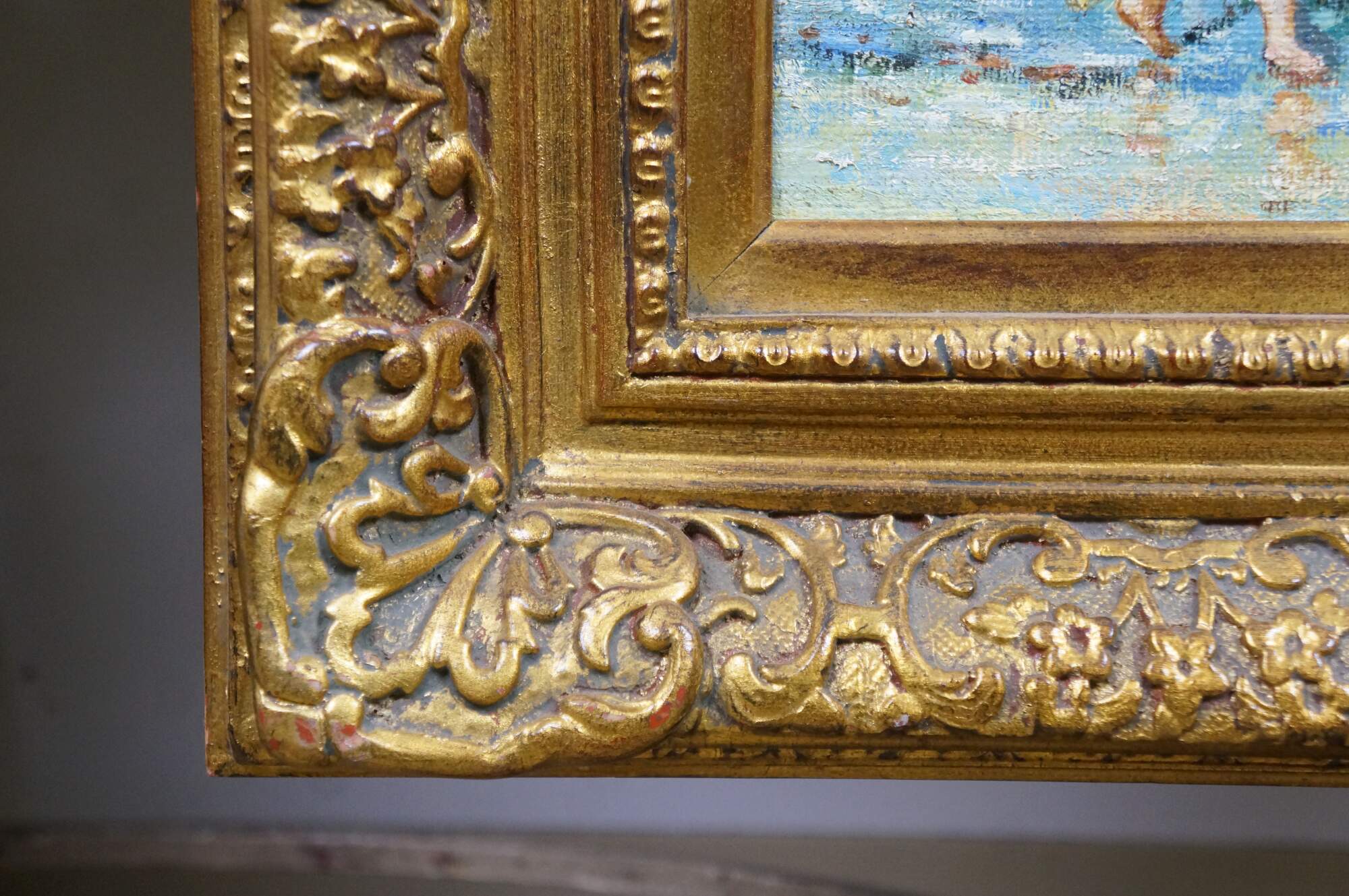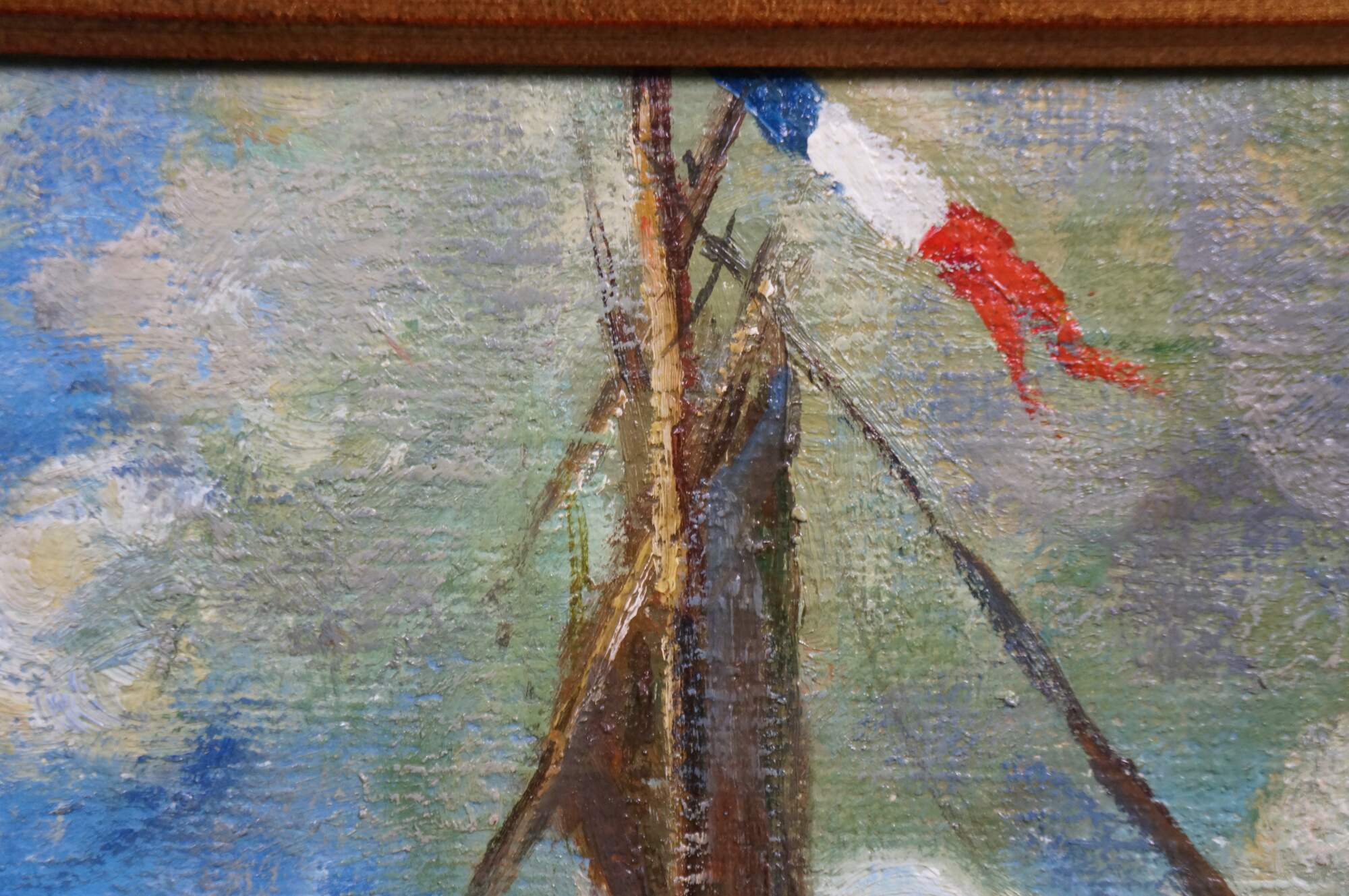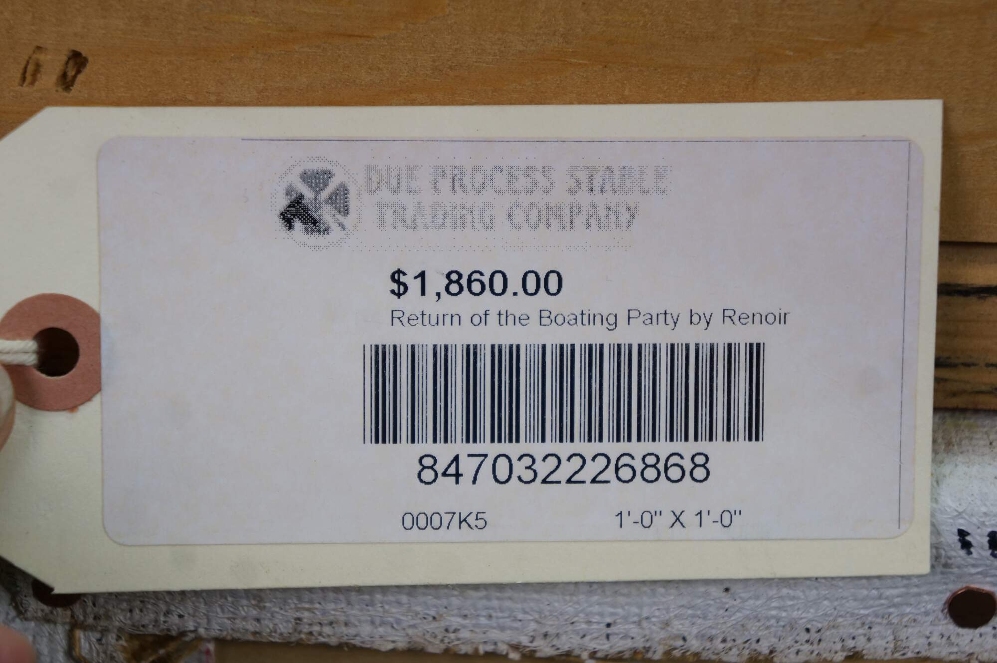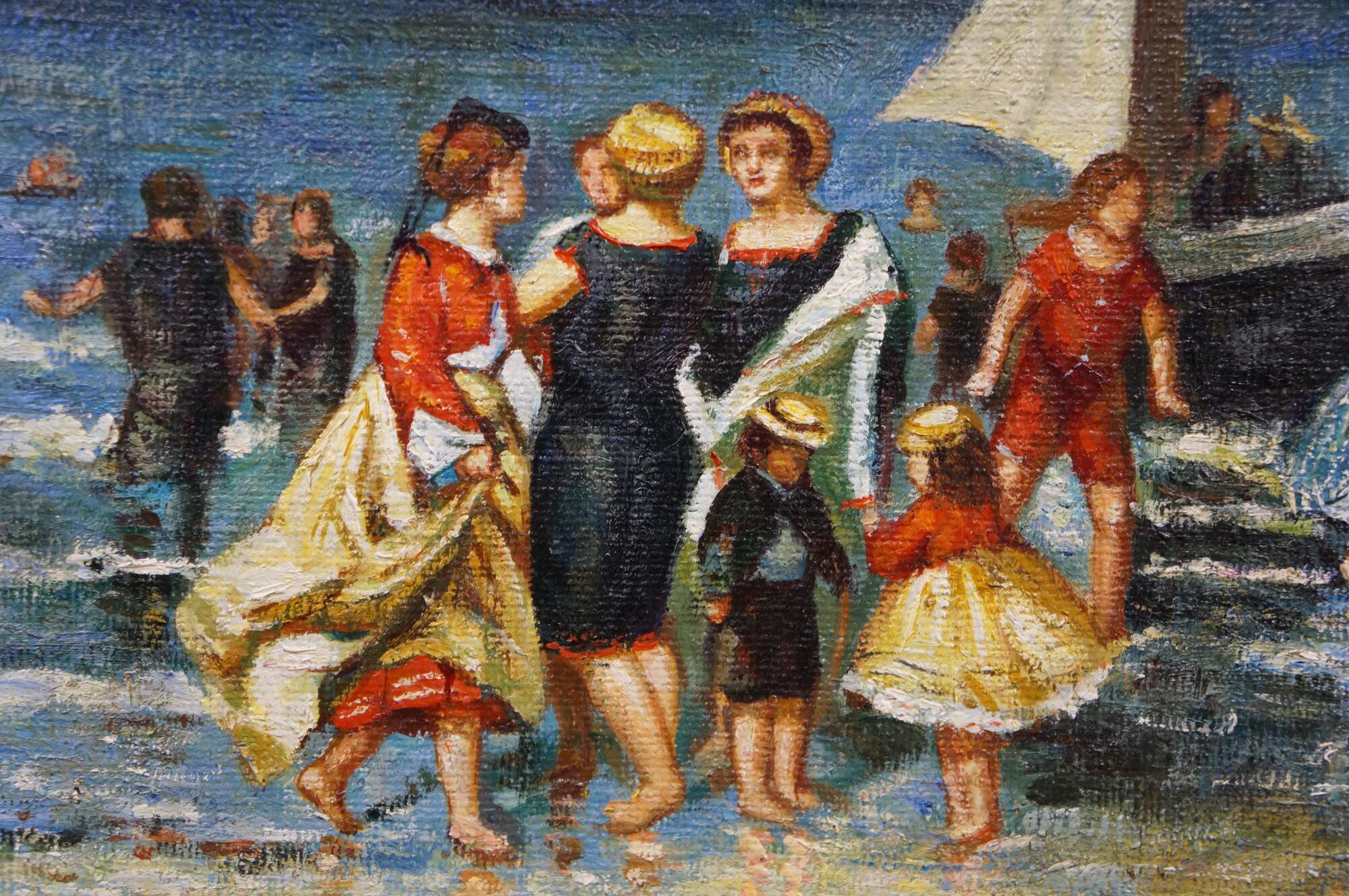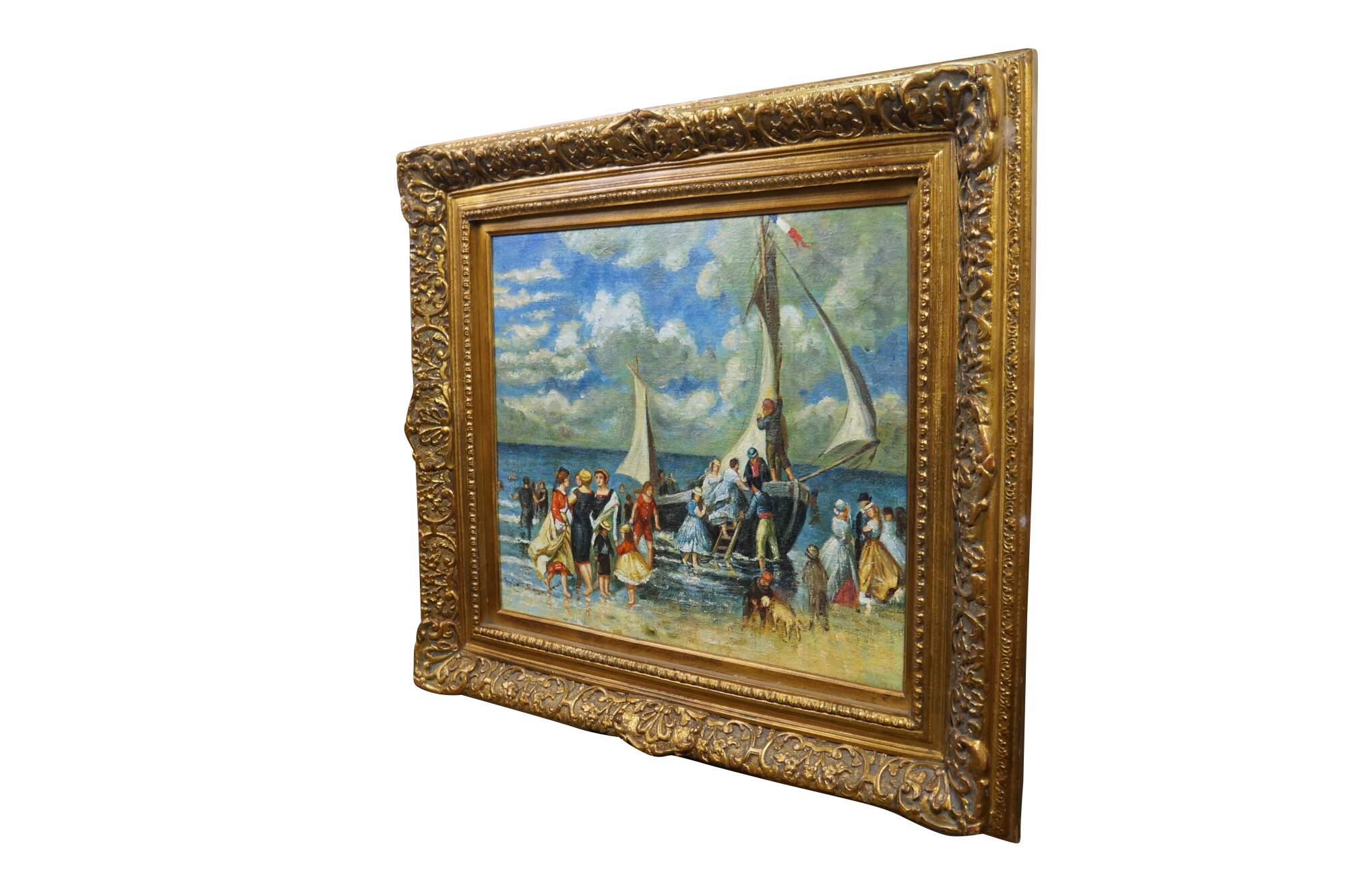 Vintage nautical / maritime / seascape oil painting on canvas titled The Return of the Boating Party after Pierre-Auguste Renoir. Originally painted around 1862, this work depicts a beach scene with figures unloading from the sailboat onto the shore.