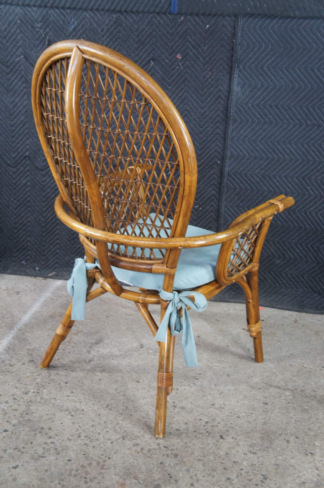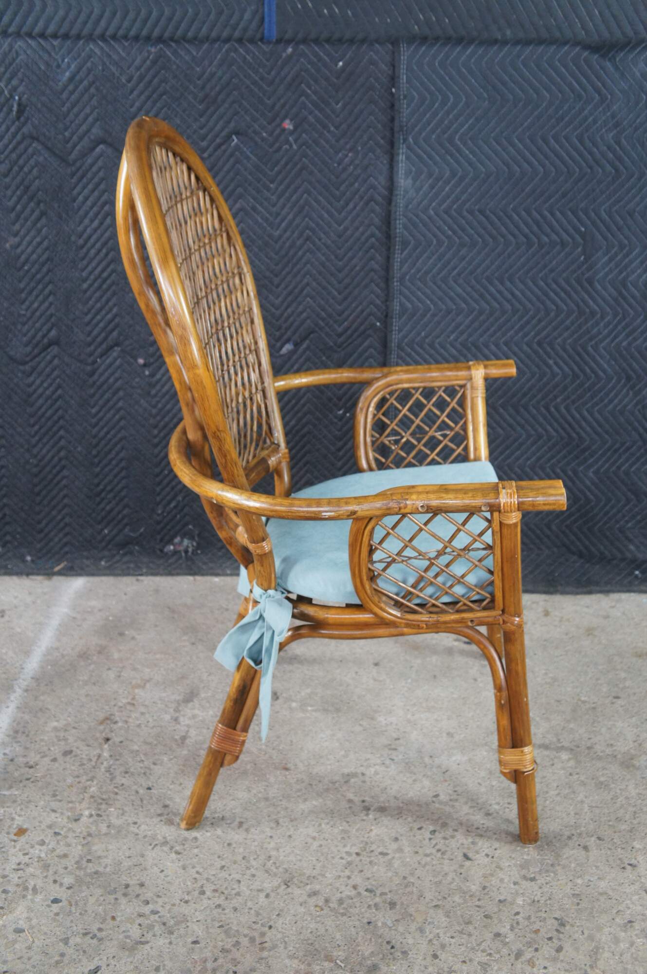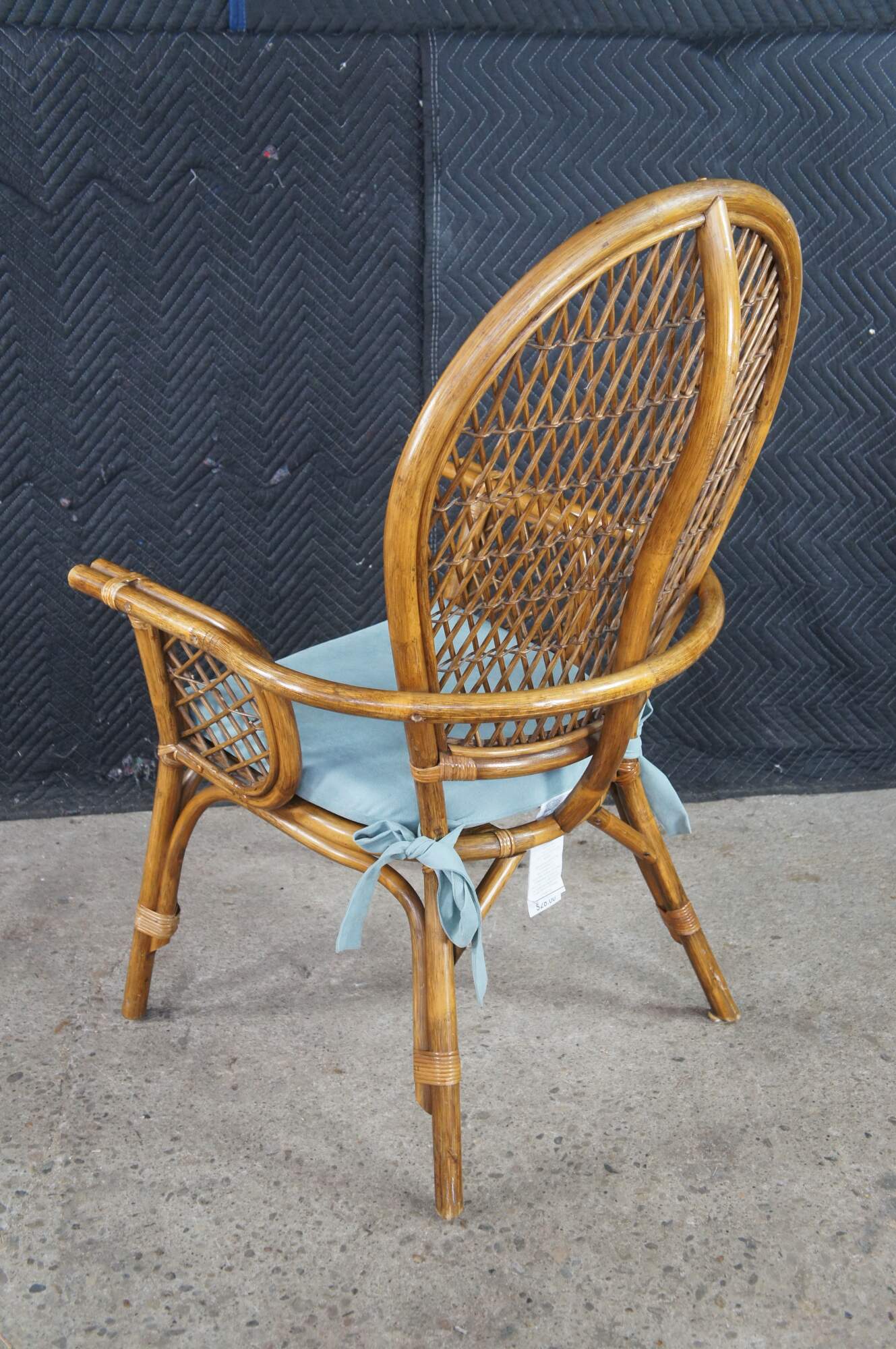 Pair of Mid Century Coastal Bohemian Armchairs. Features a bamboo frame with interlaced rattan balloon back and removable cushions.