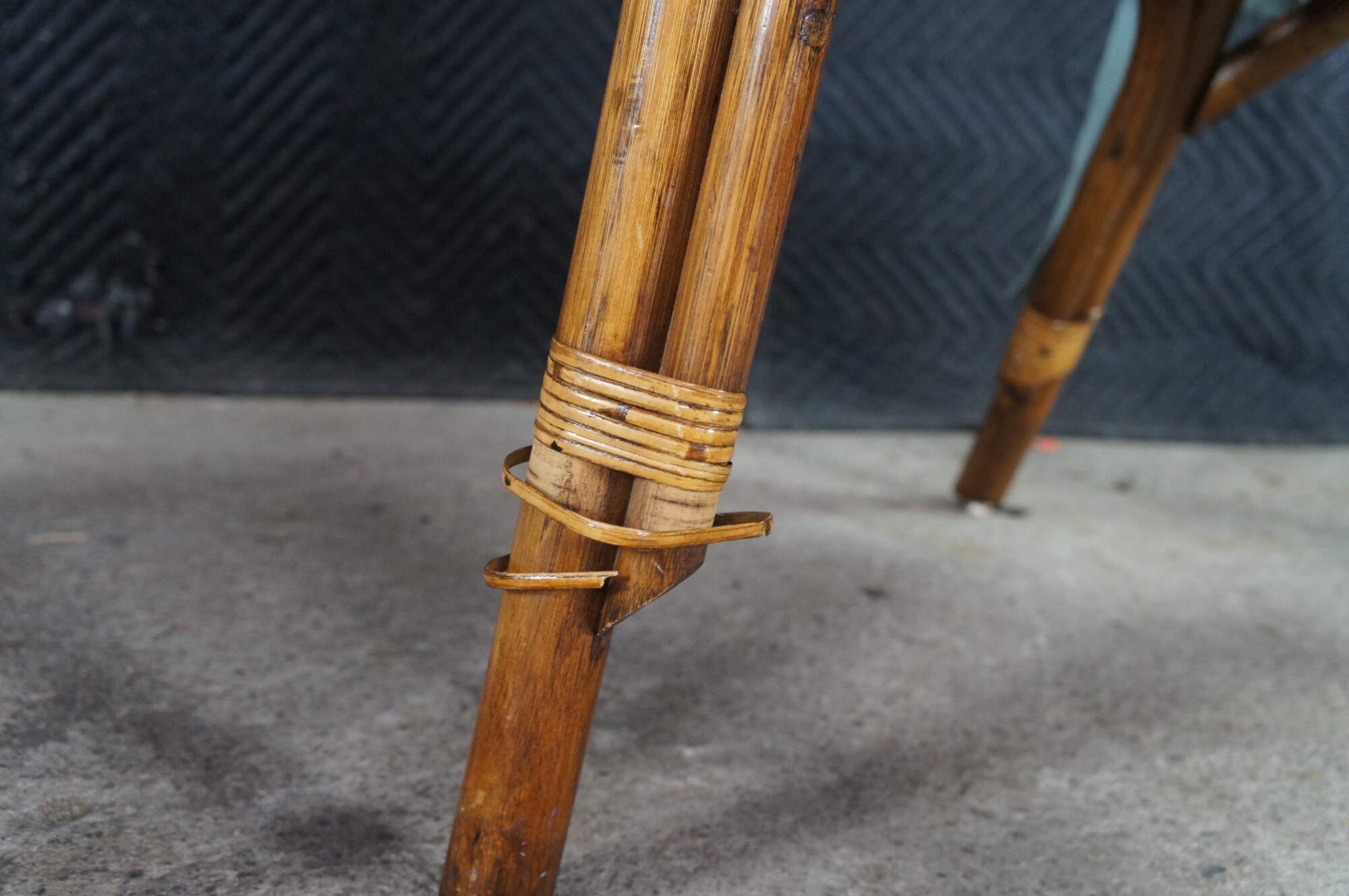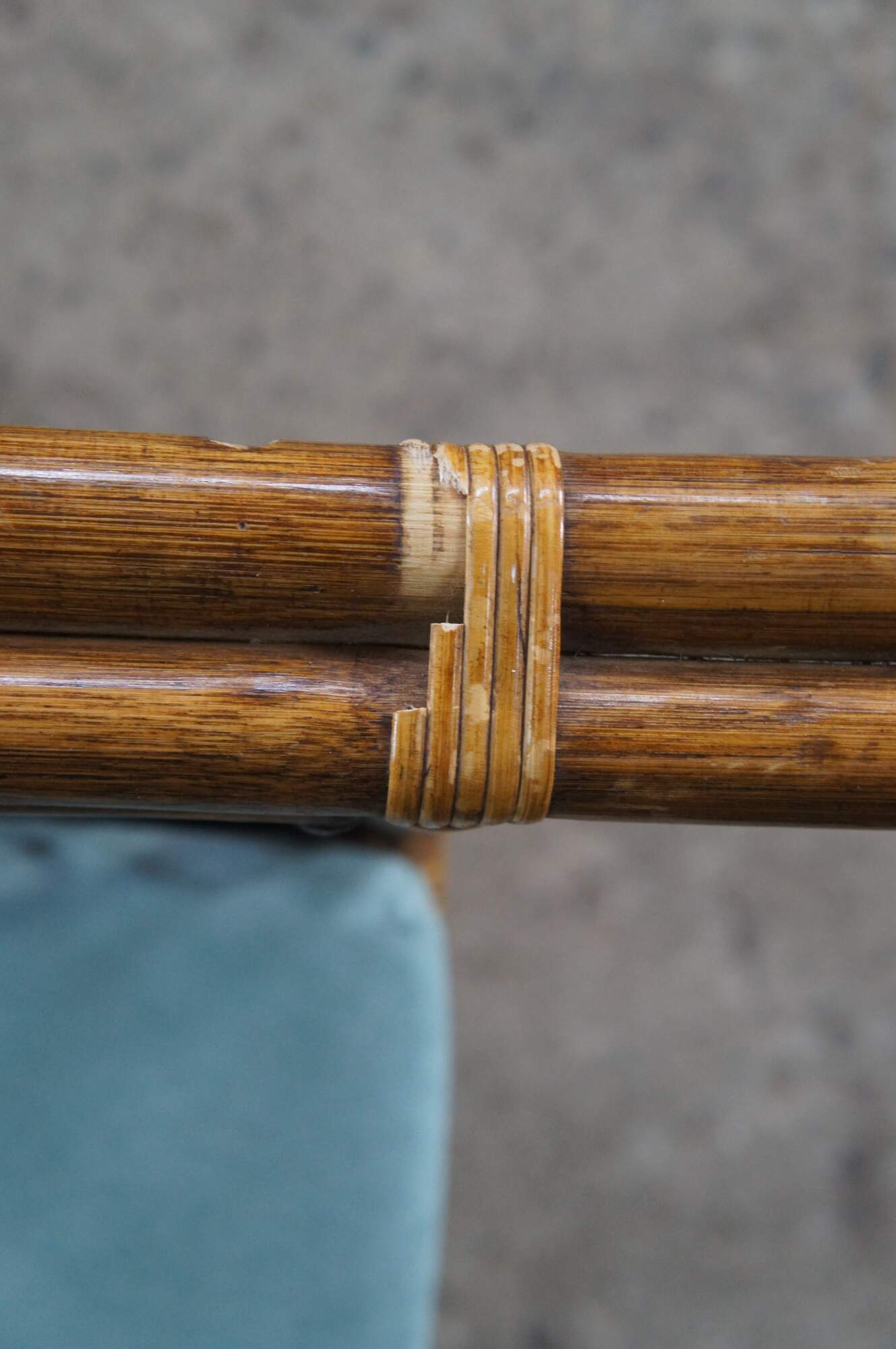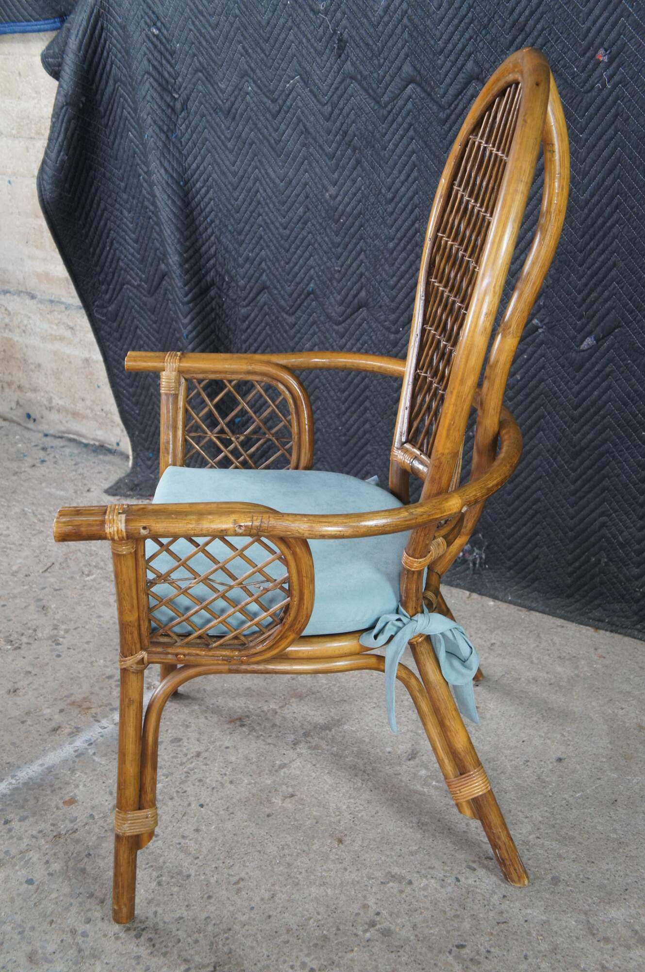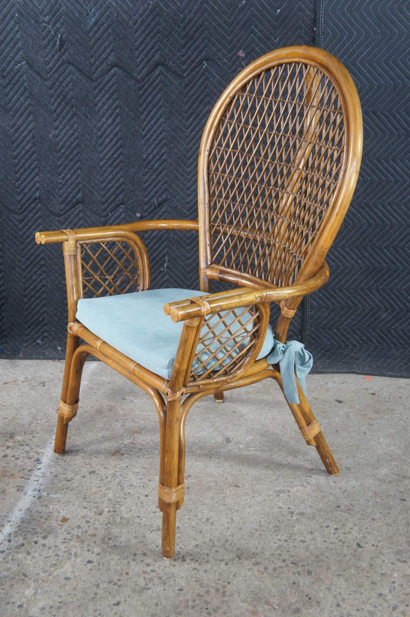 Pair of Mid Century Coastal Bohemian Armchairs. Features a bamboo frame with interlaced rattan balloon back and removable cushions.