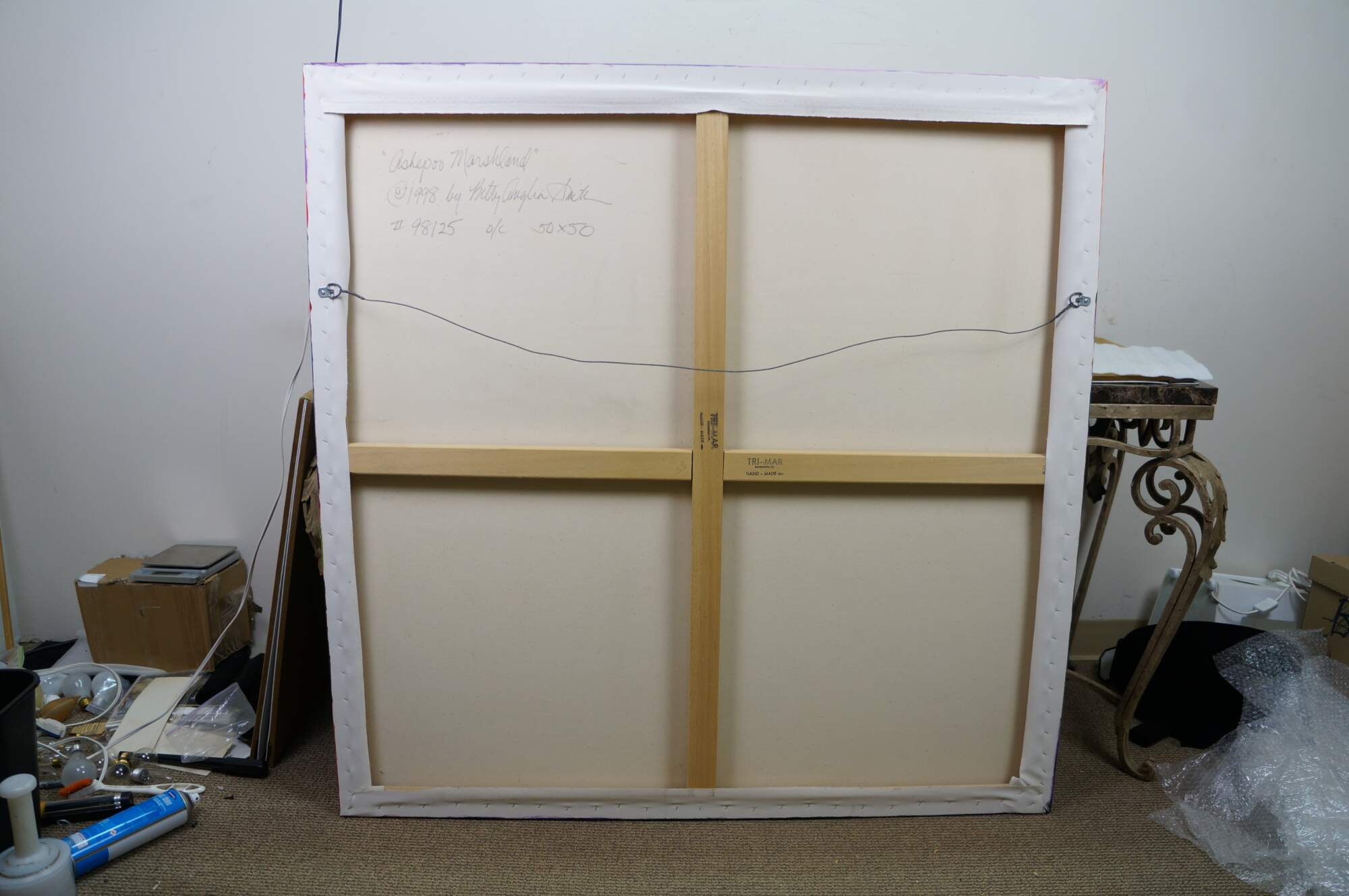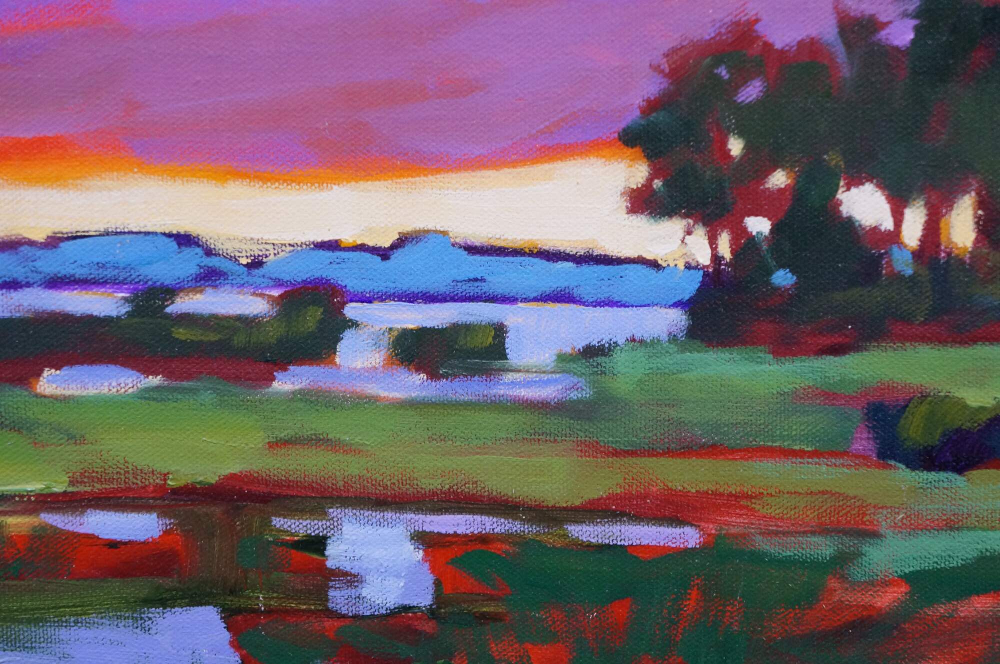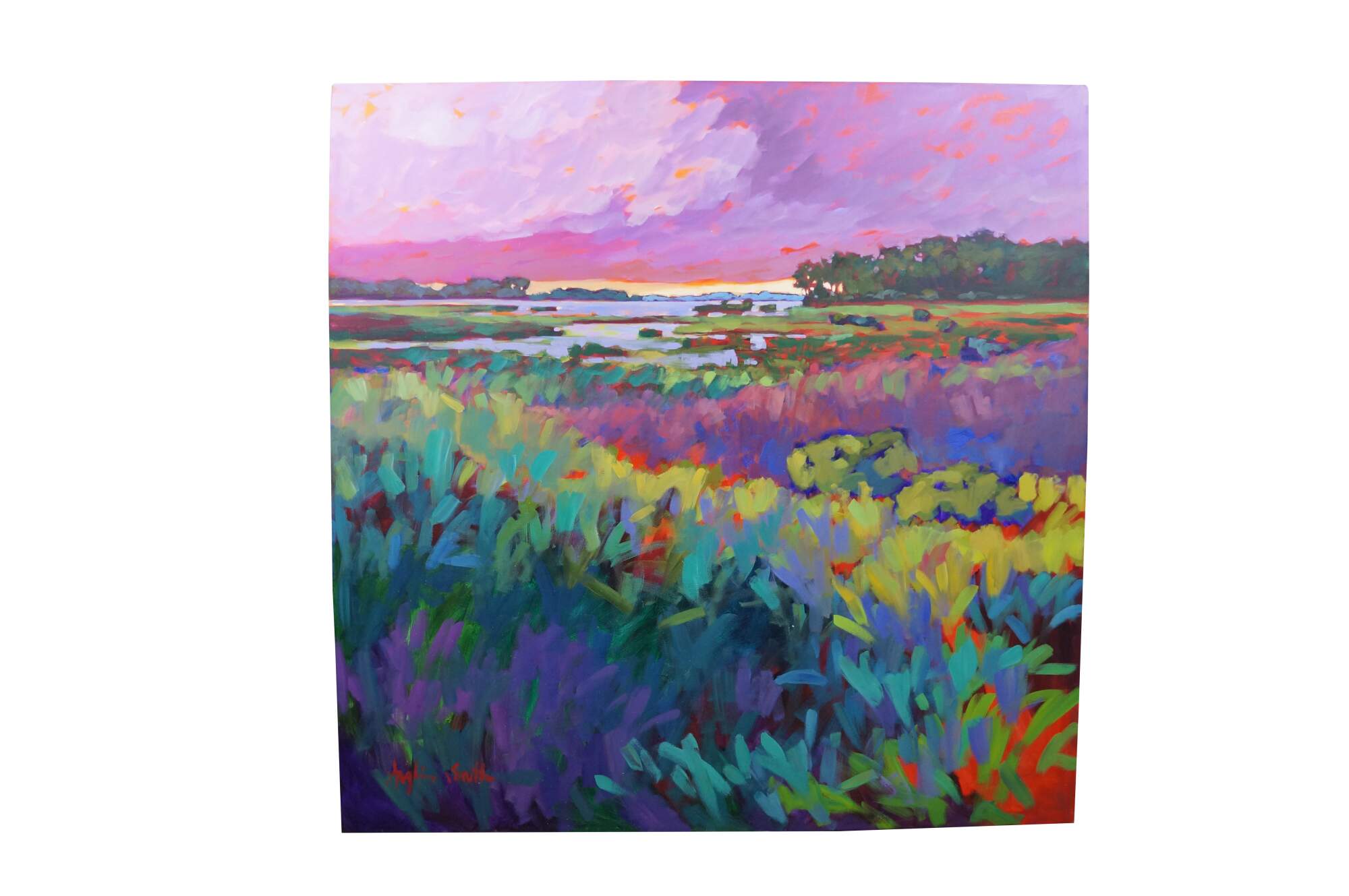 Vintage 1998 Betty Anglin Smith original oil painting on canvas titled Ashepoo Marshland. A vibrant landscape featuring a low-lying, waterlogged wetland dominated by grasses, reeds, rushes, trees and sedges.