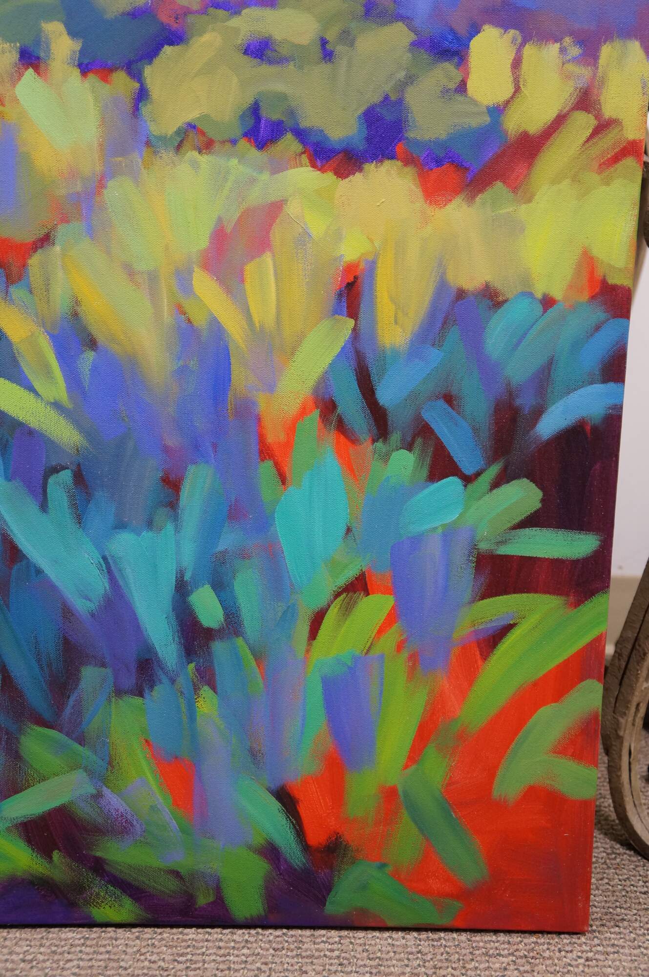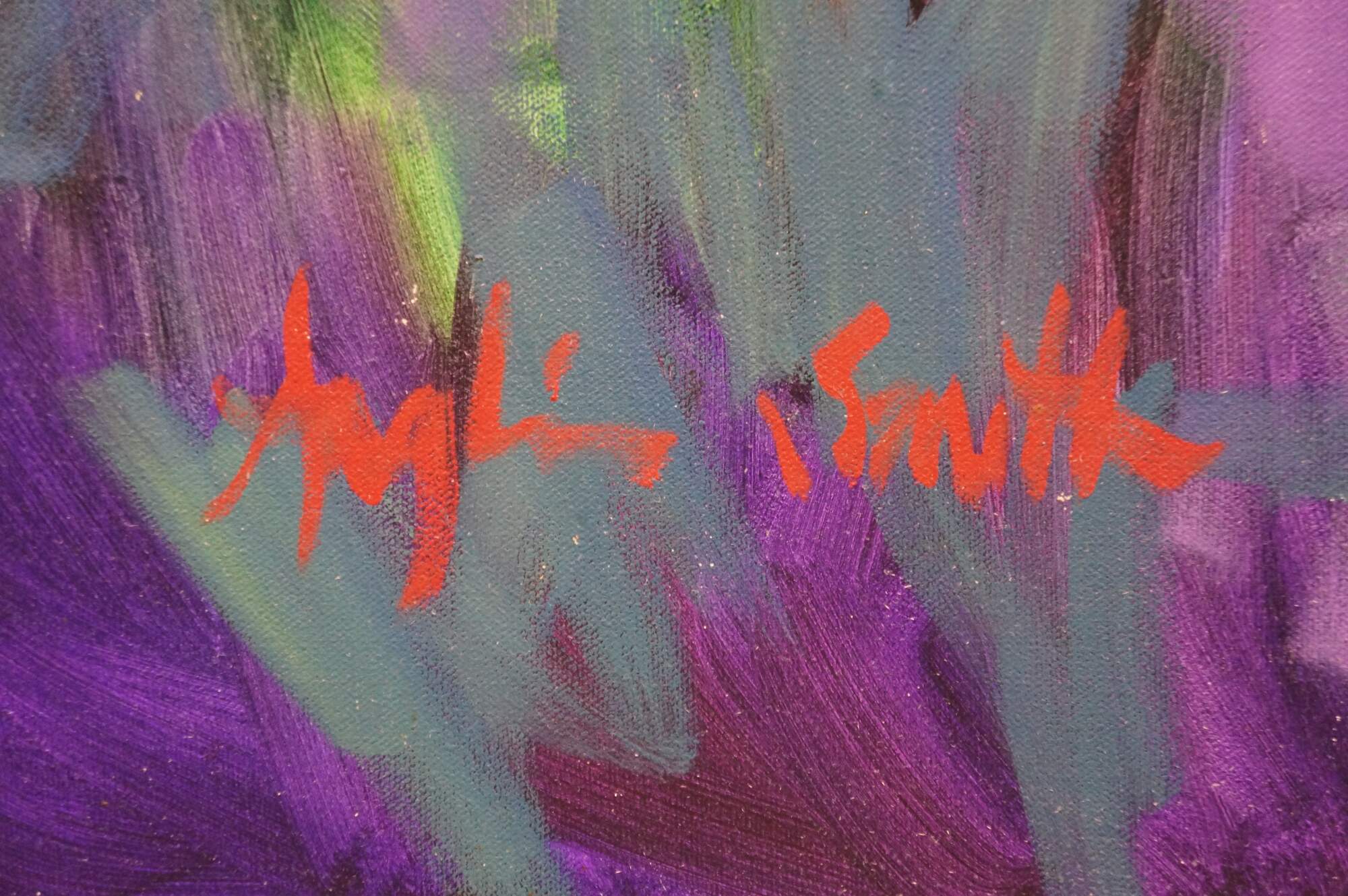 She has discovered that lines were to be found in the colorful shifting clouds and meandering creeks. Using large brushstrokes and eye-catching colors, Smith has worked to capture not just the physical nature of a place, but the feeling as well. Her goal with her paintings is to give the viewer a sense of the immediacy of the moment.
