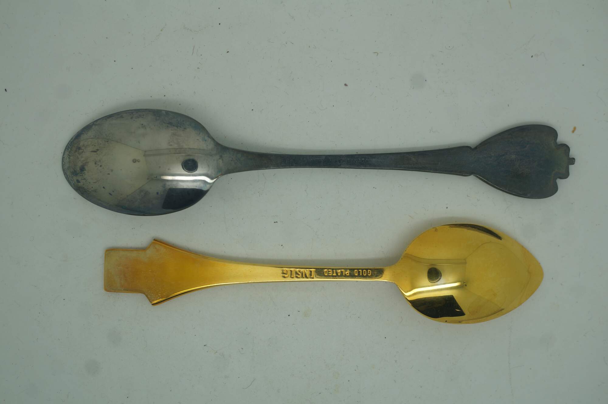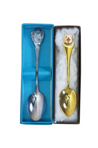 Two vintage souvenir spoons from Canada featuring silver-plated and gold-toned finishes, both in original presentation boxes..