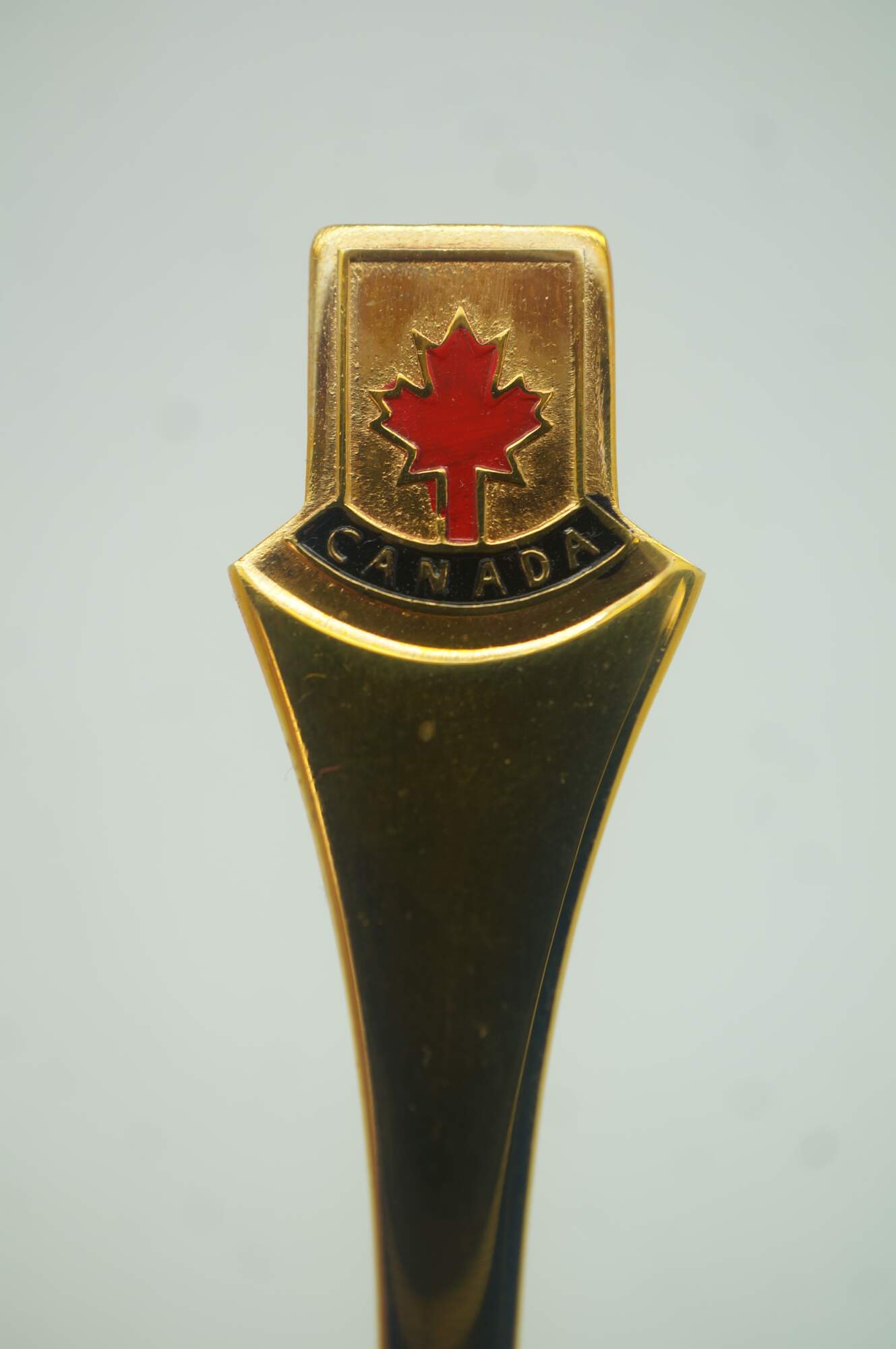 -Red enamel maple leaf motif with CANADA inscribed below it, Gold Plated Insig.