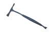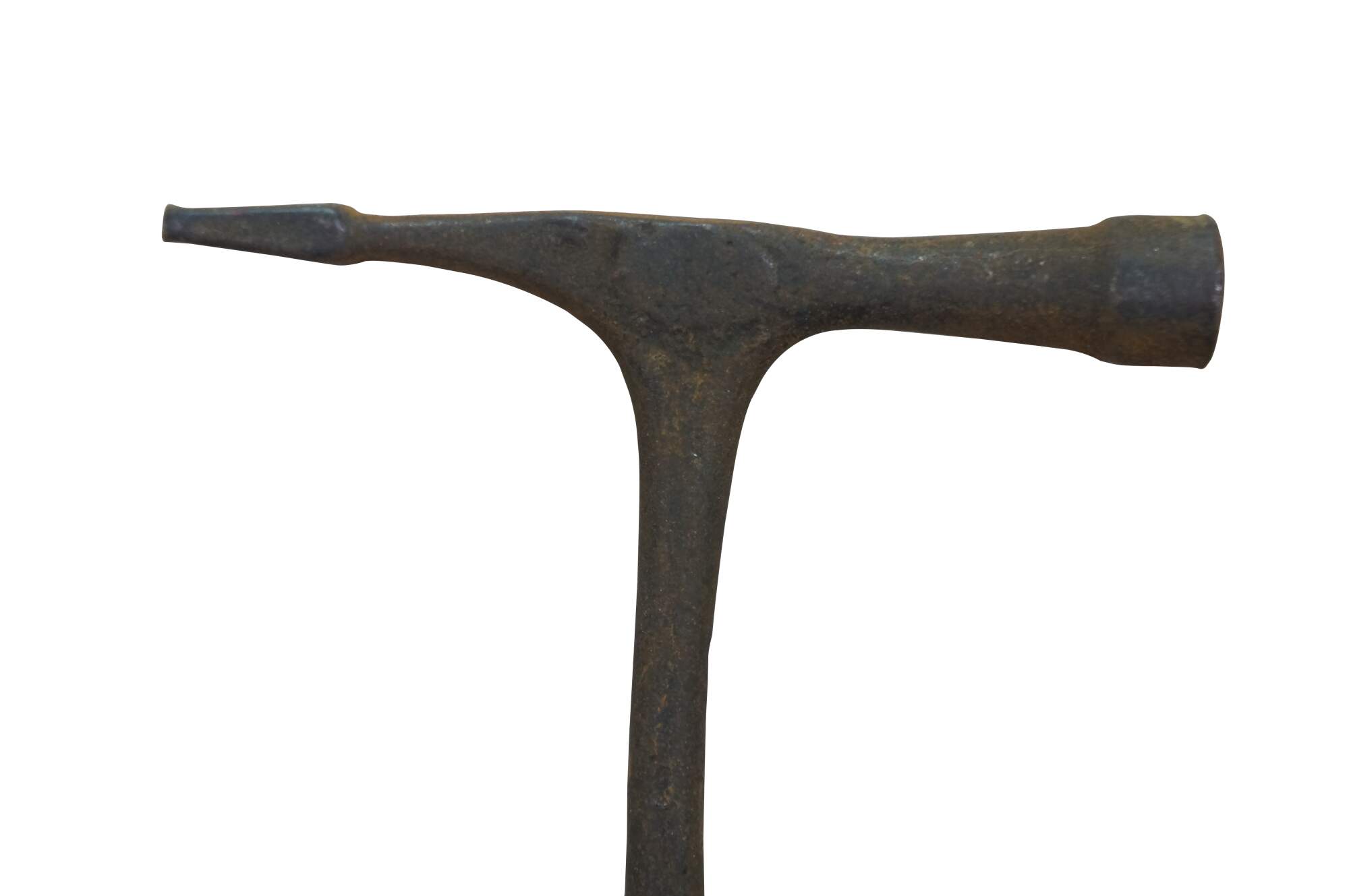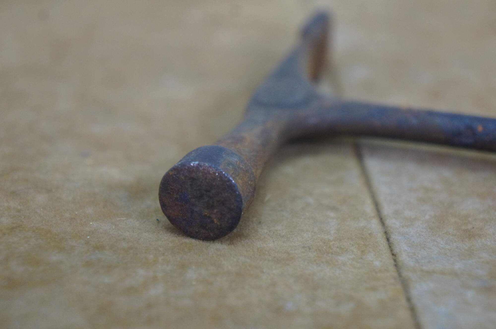 Antique tack hammer, used for upholstery, saddlery, or leatherwork. Designed for driving and pulling small tacks or nails into furniture frames or leather. Features a narrow, magnetized head for holding tacks and a split claw on the opposite end for pulling them.