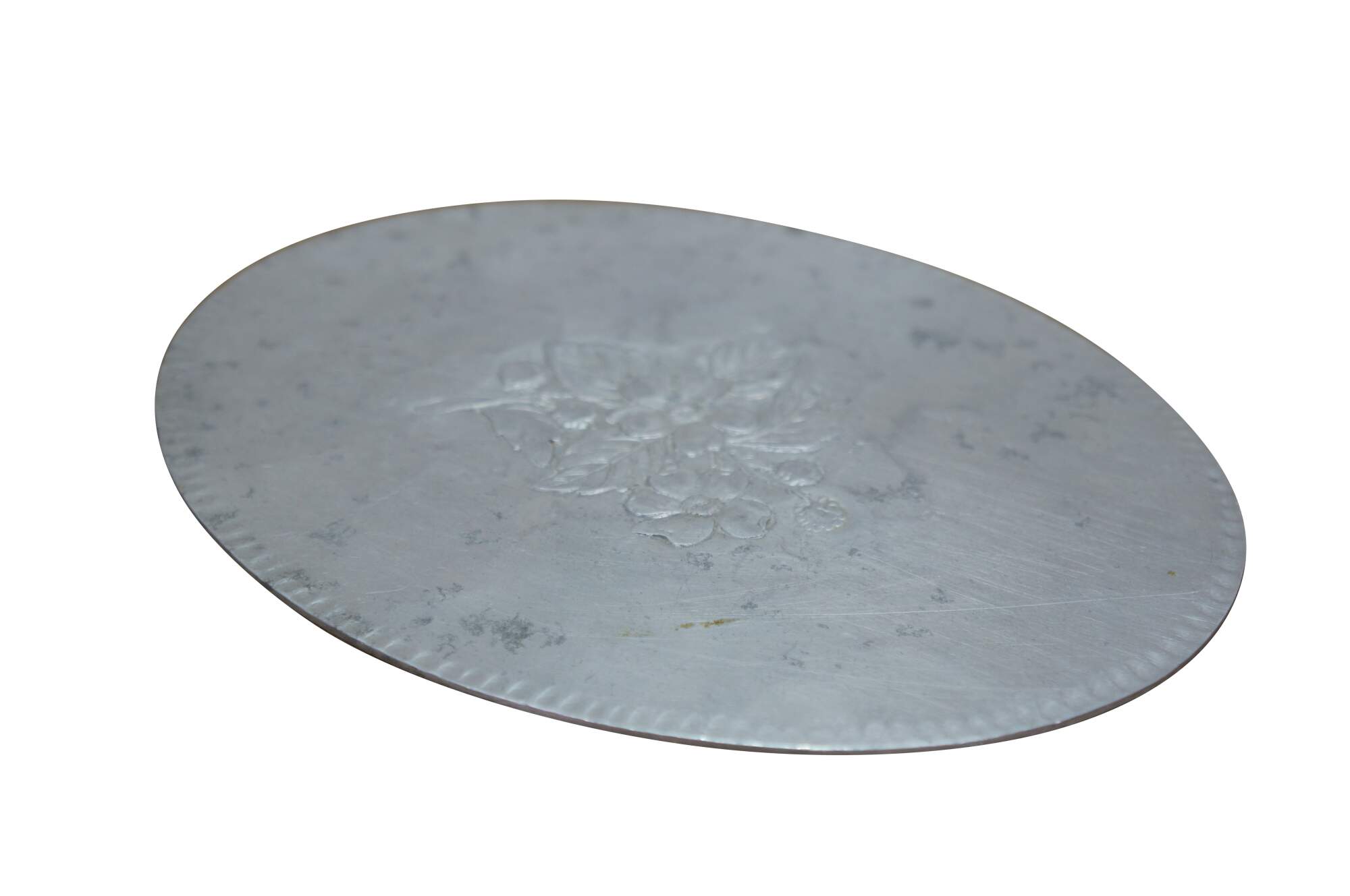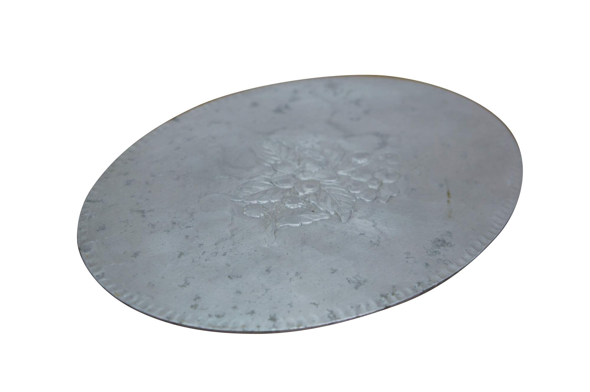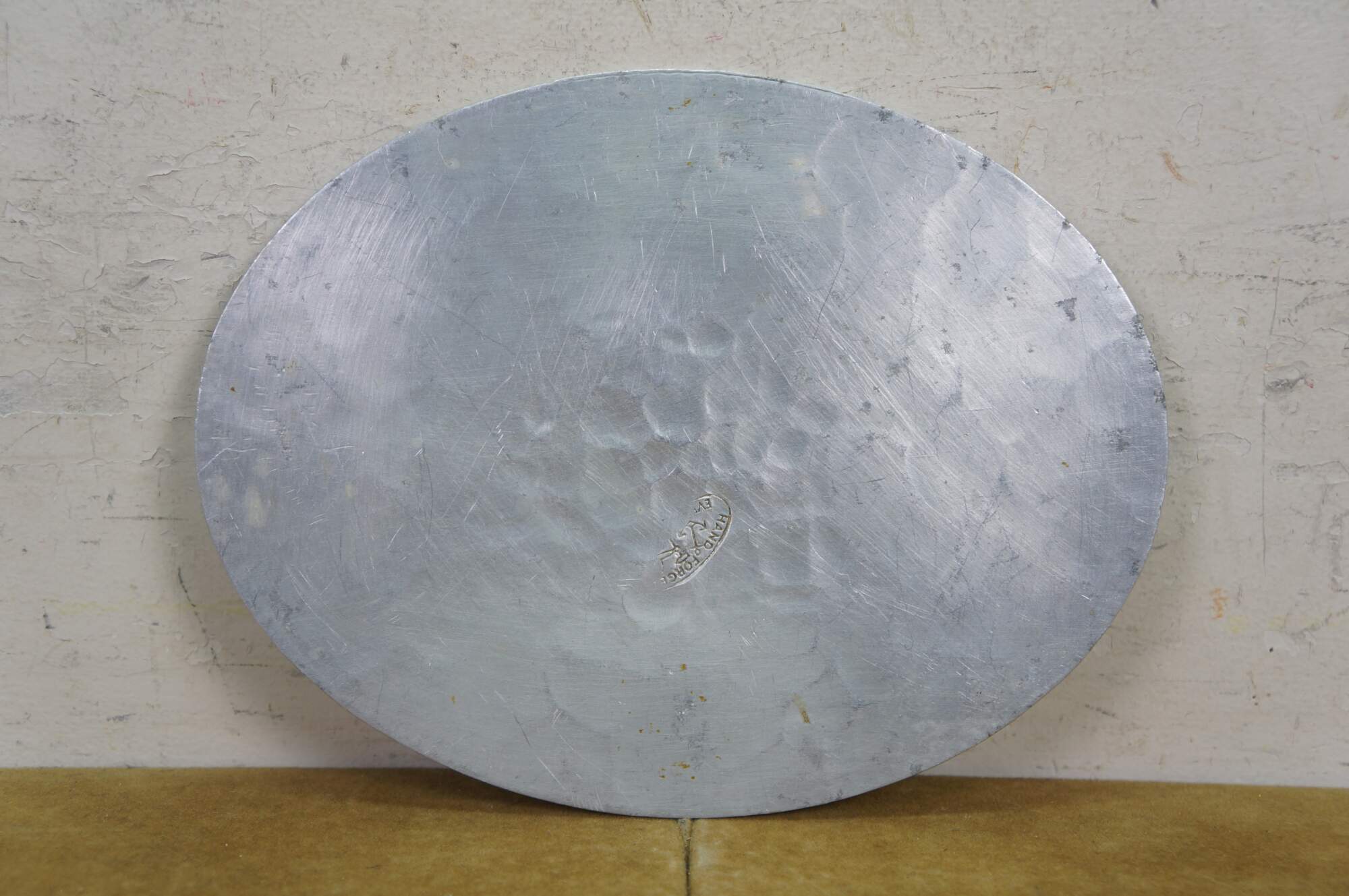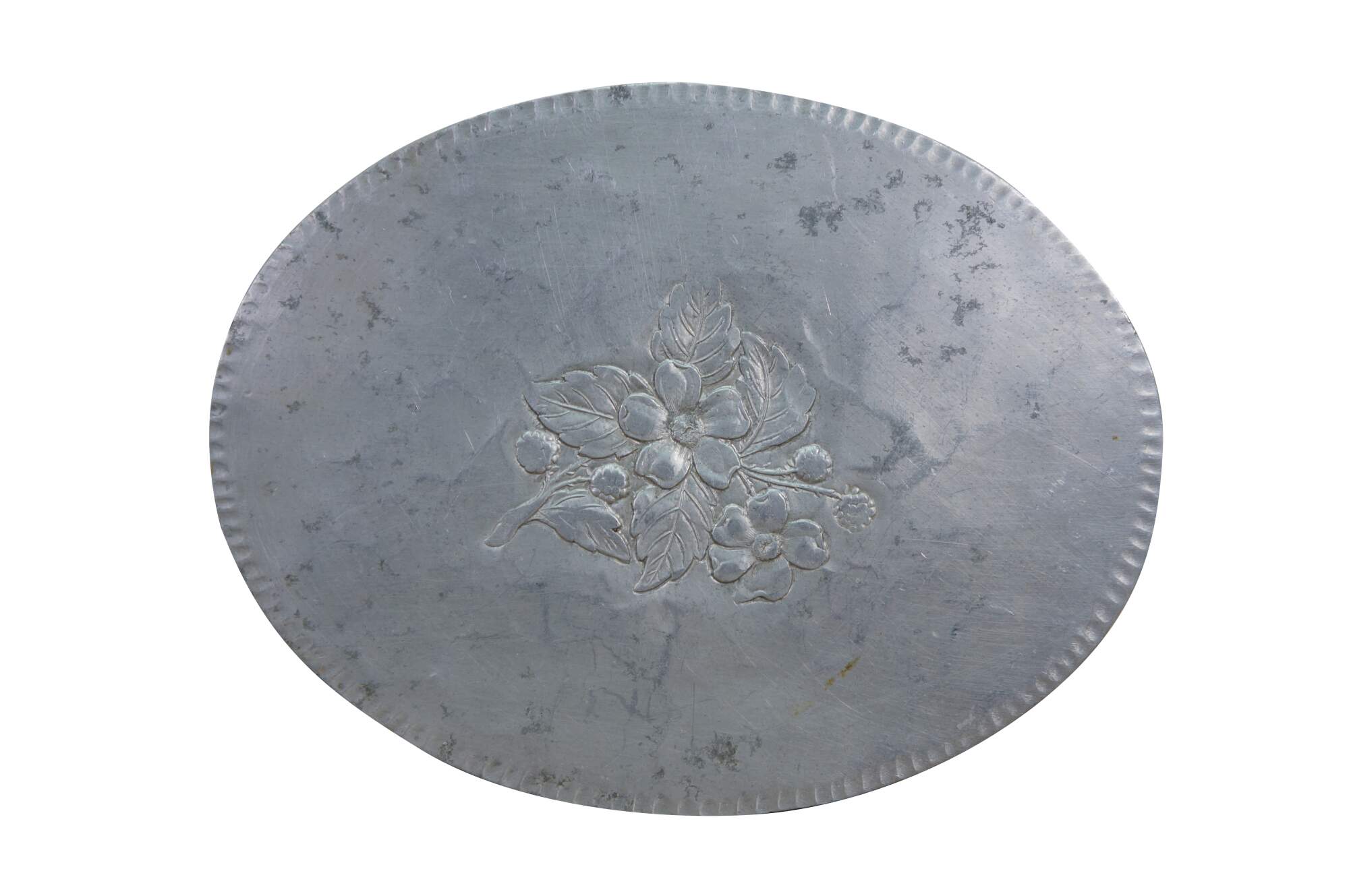 Vintage hammered aluminum trivet / bar / serving tray produced by the Everlast Metal Products Company in the mid-20th century. Oval-shaped with a scalloped edge and an embossed central floral or fruit motif.