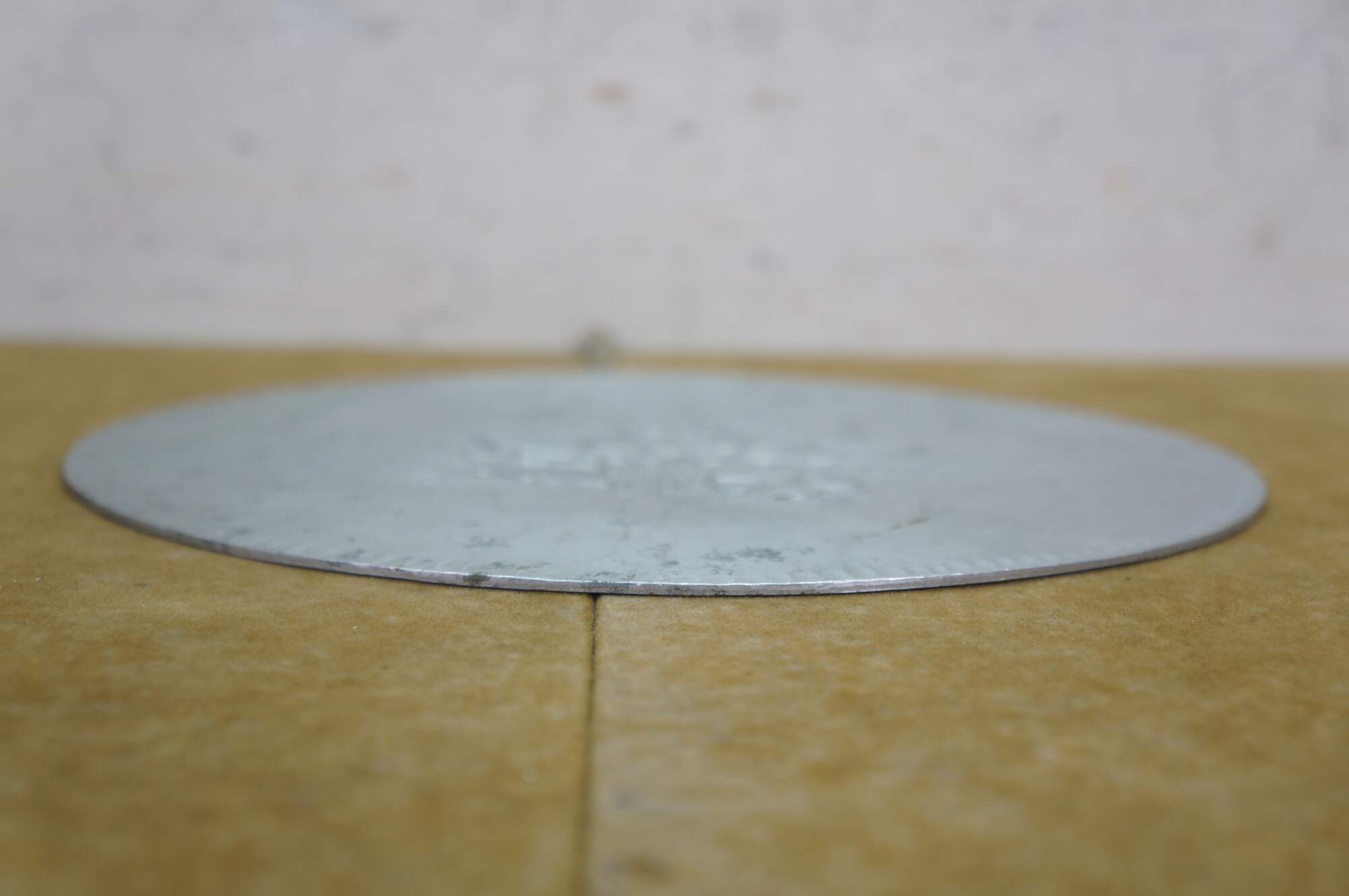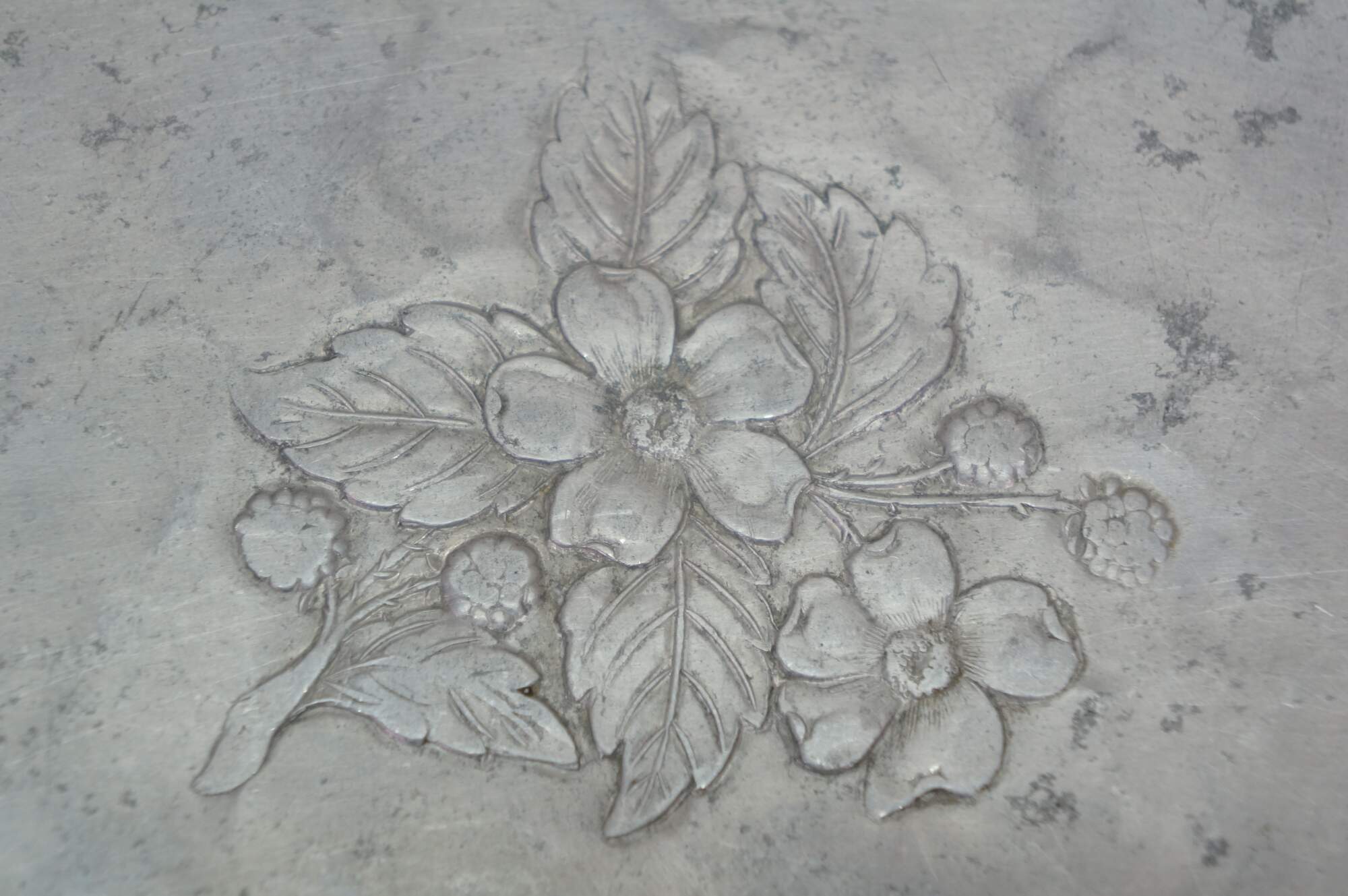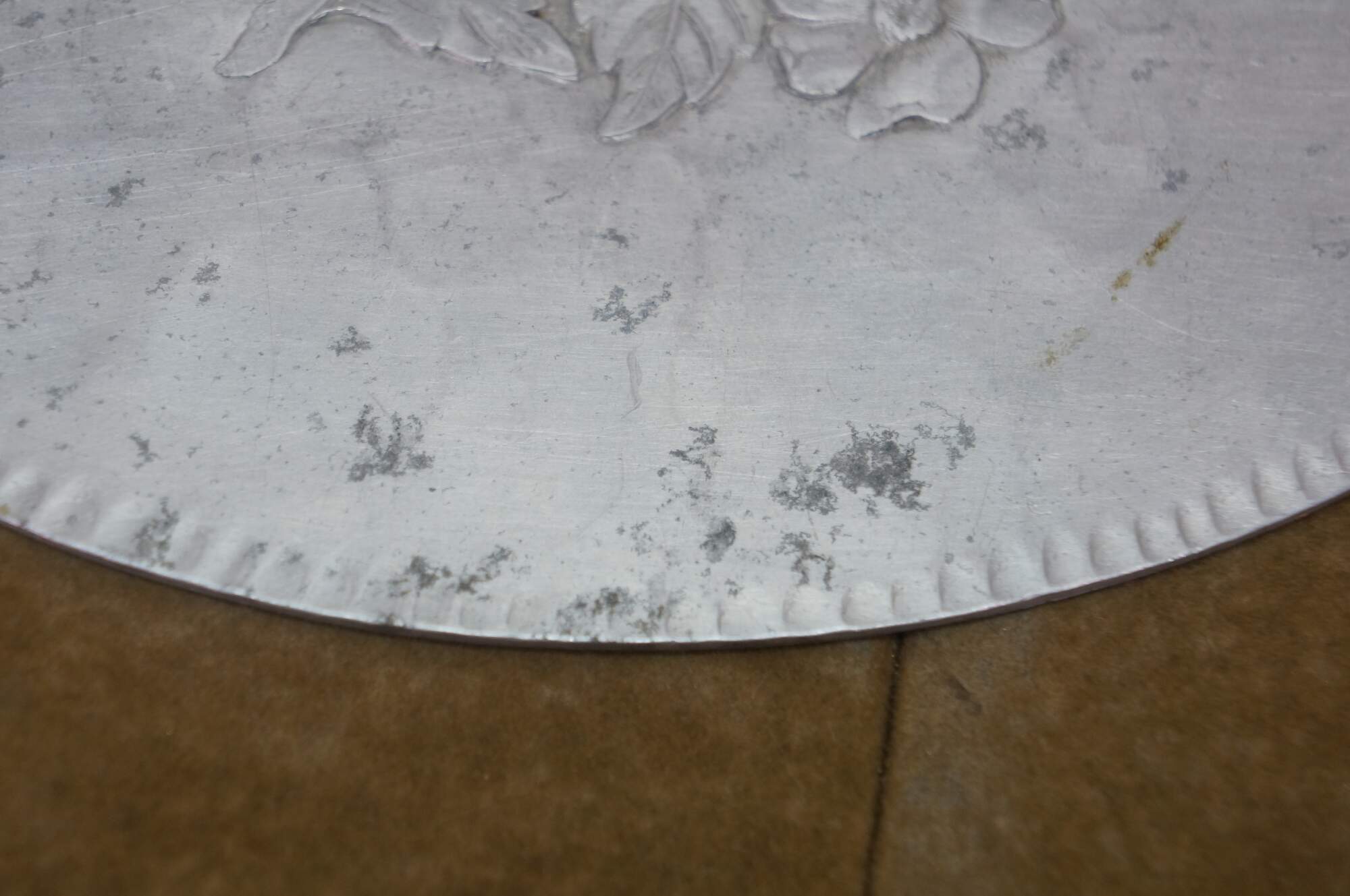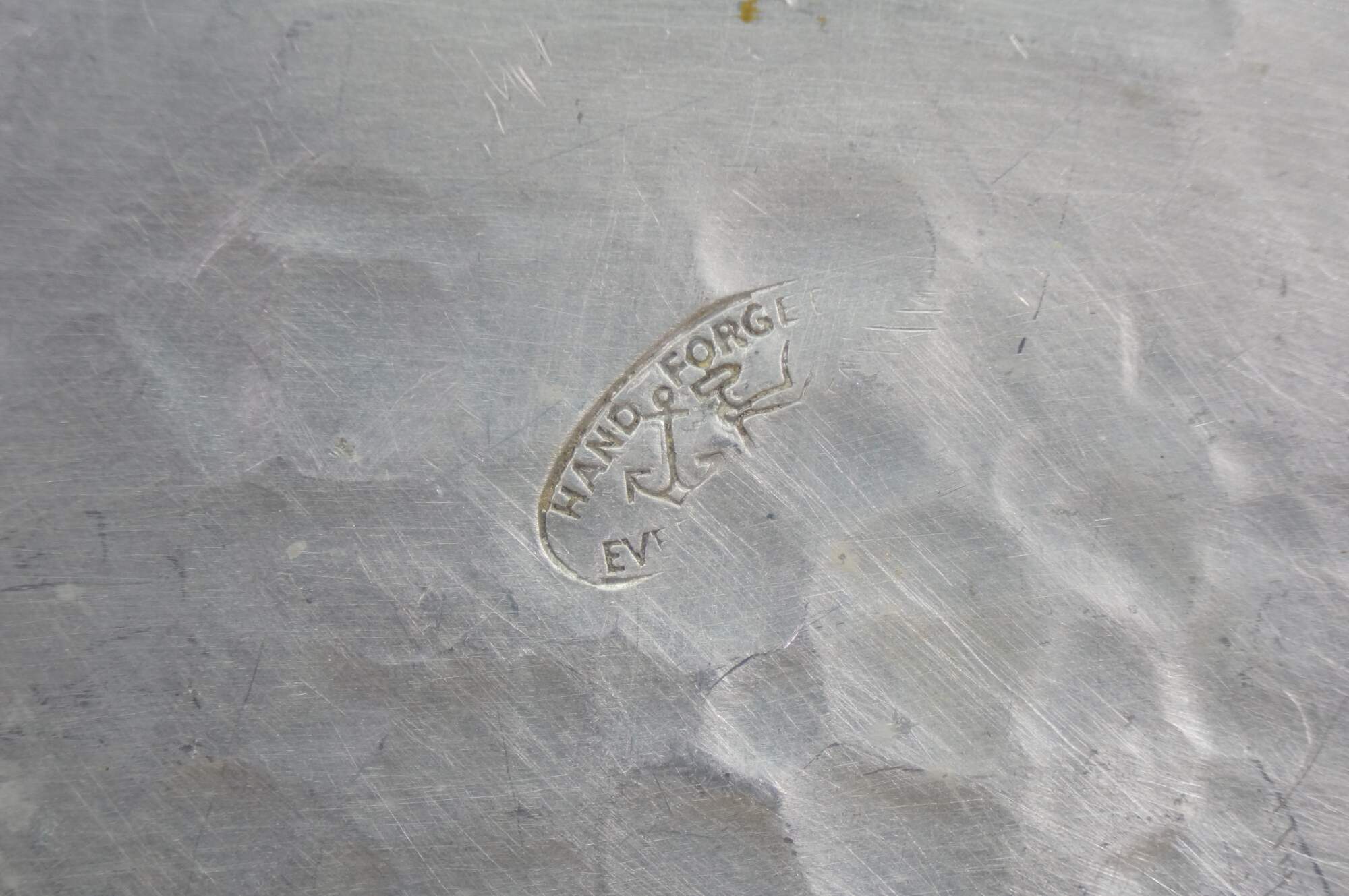 Vintage hammered aluminum trivet / bar / serving tray produced by the Everlast Metal Products Company in the mid-20th century. Oval-shaped with a scalloped edge and an embossed central floral or fruit motif.