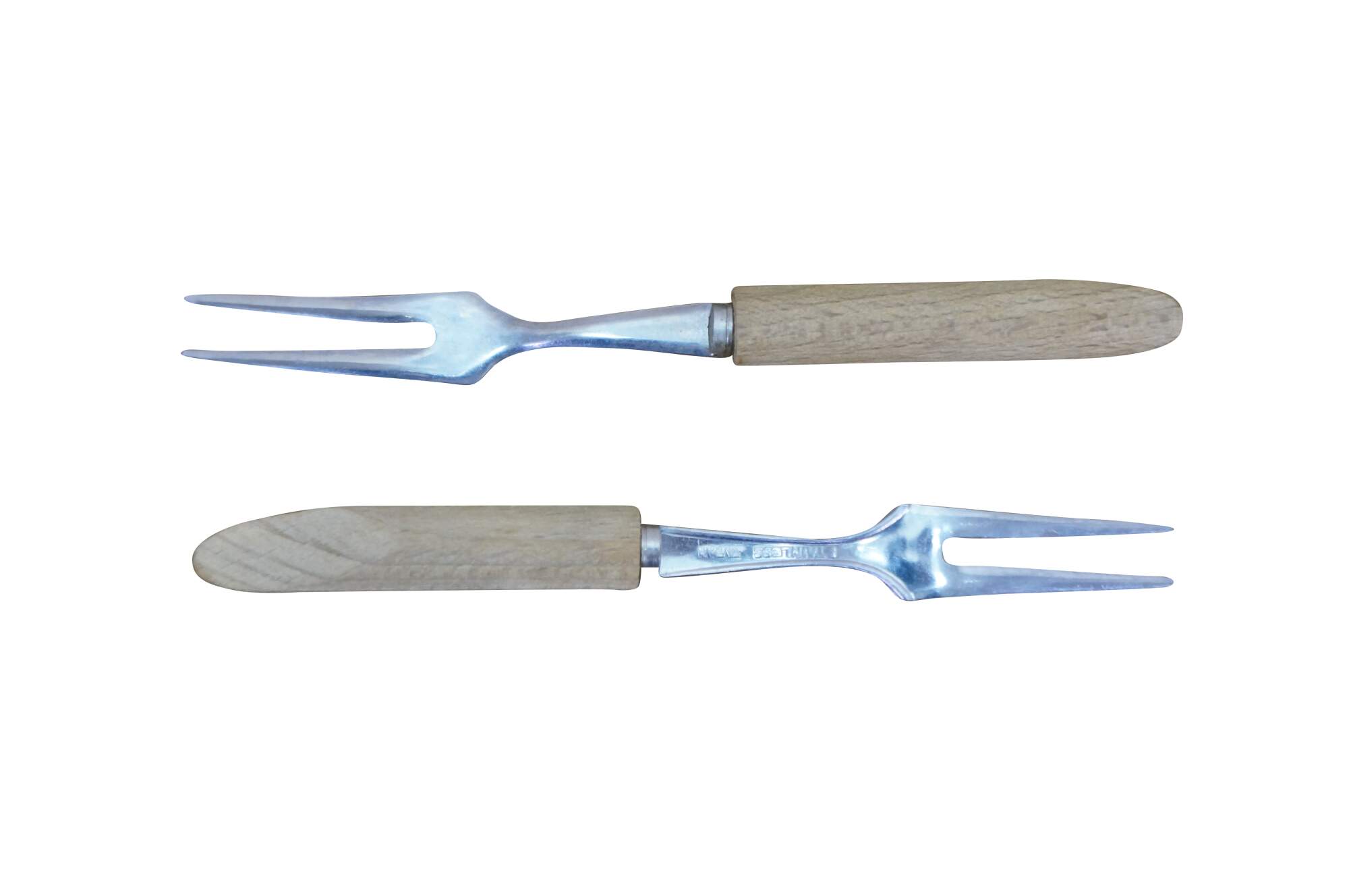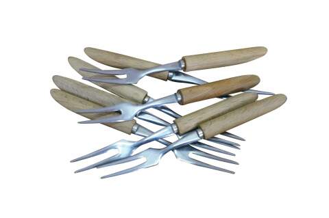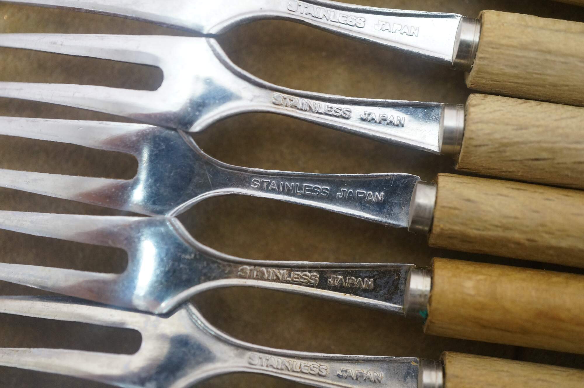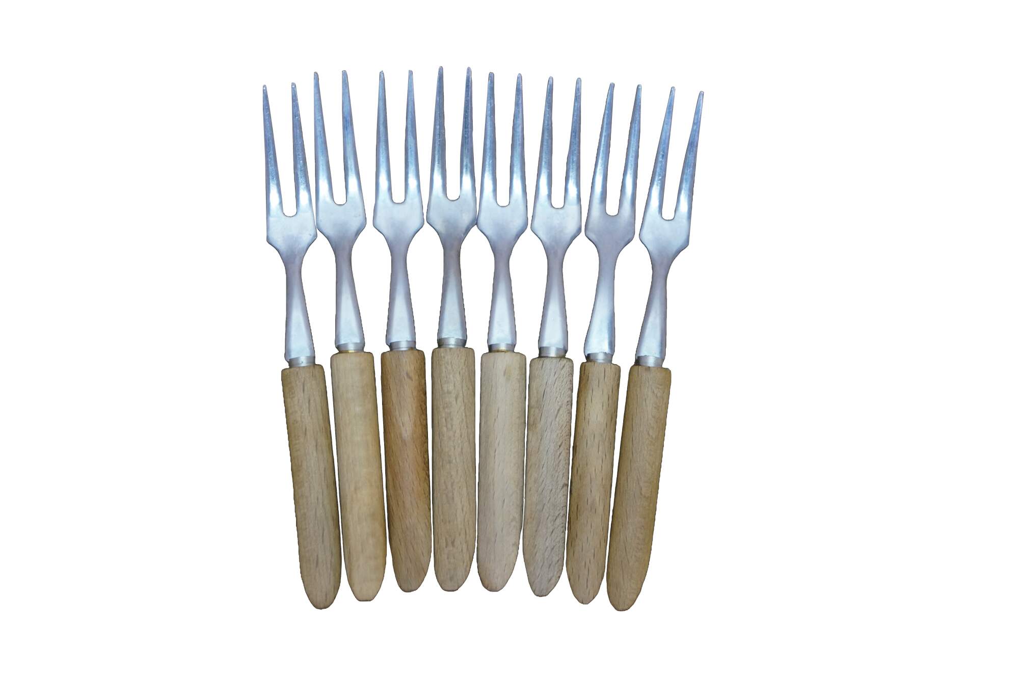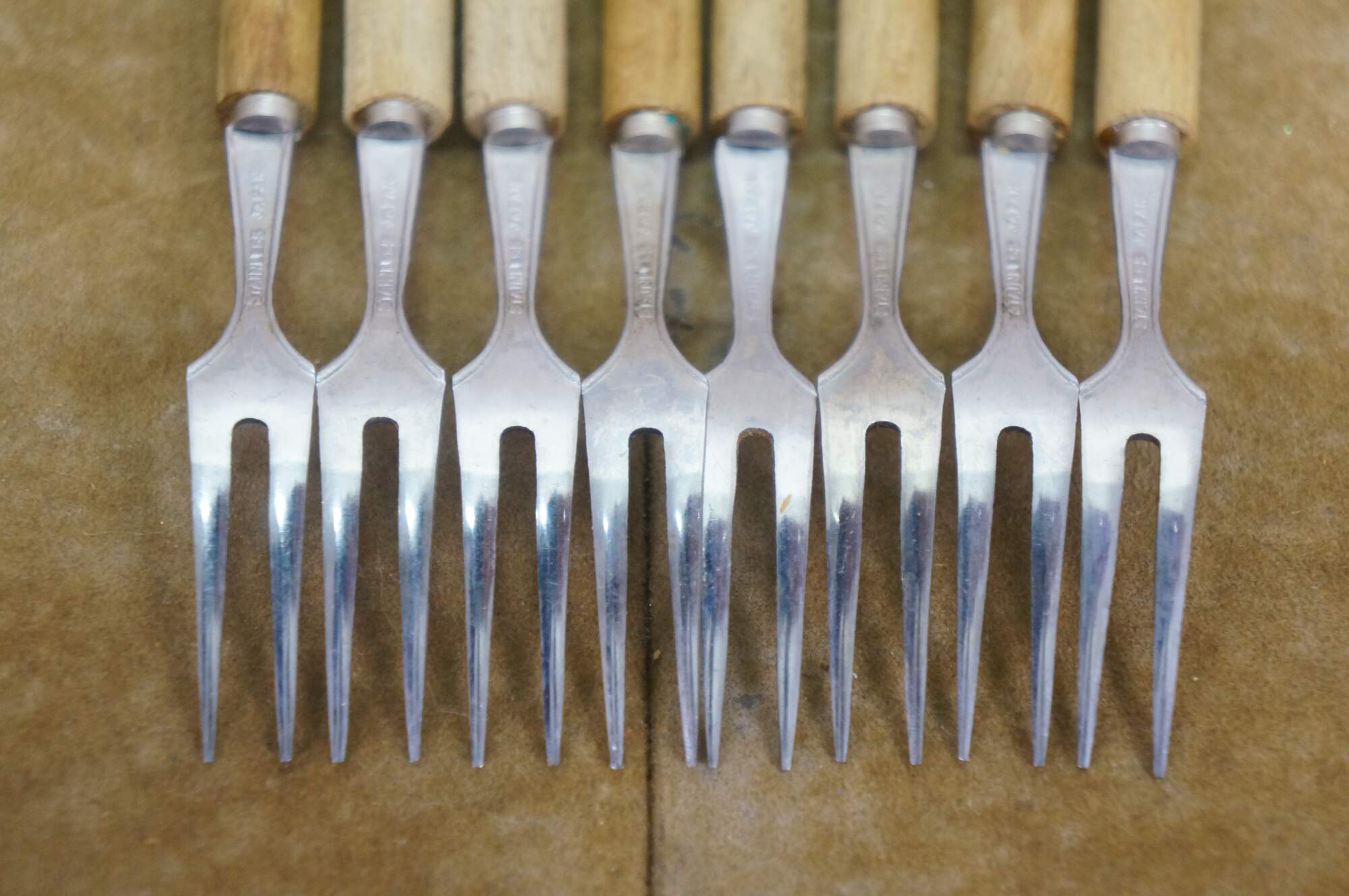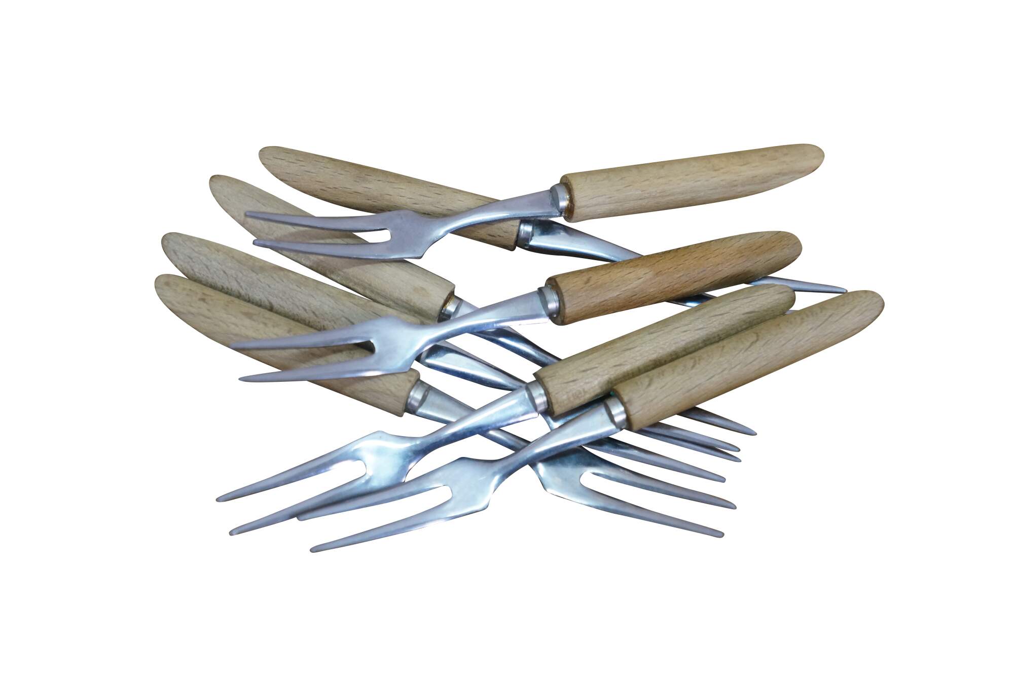 Vintage set of eight mid-century modern appetizer or cocktail forks with stainless steel two-prong tines and wooden handles, likely made in Japan.