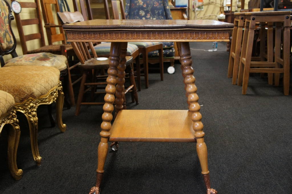 Here is a beautiful ball and copper claw foot table. Made from Oak, and intricate design. Will look great in any parlor or home!
