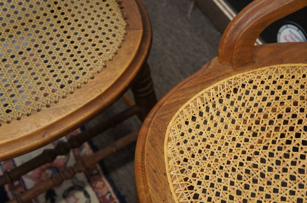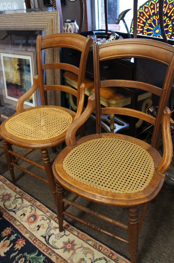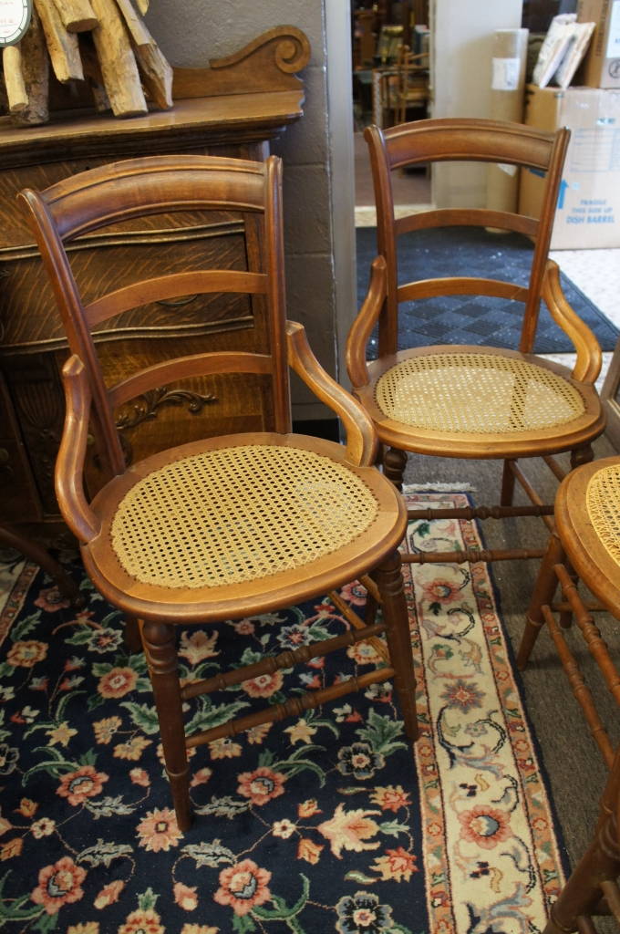 4 Antique Caned Chairs Wooden Seat Set Country Style Ladder Back Thumb Plained