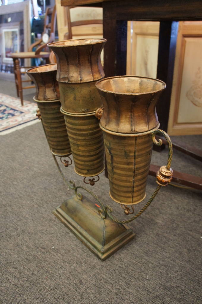Cast Iron Tin Triple Planter 3 Pot Plant Stand Copper Patina Color Fancy Painted
