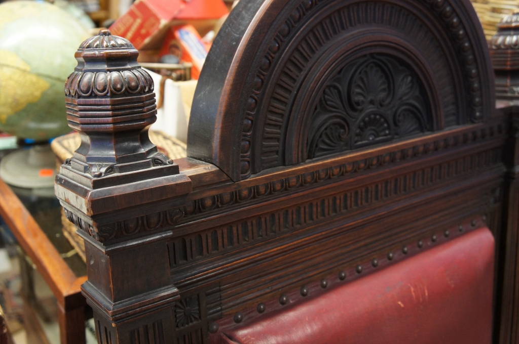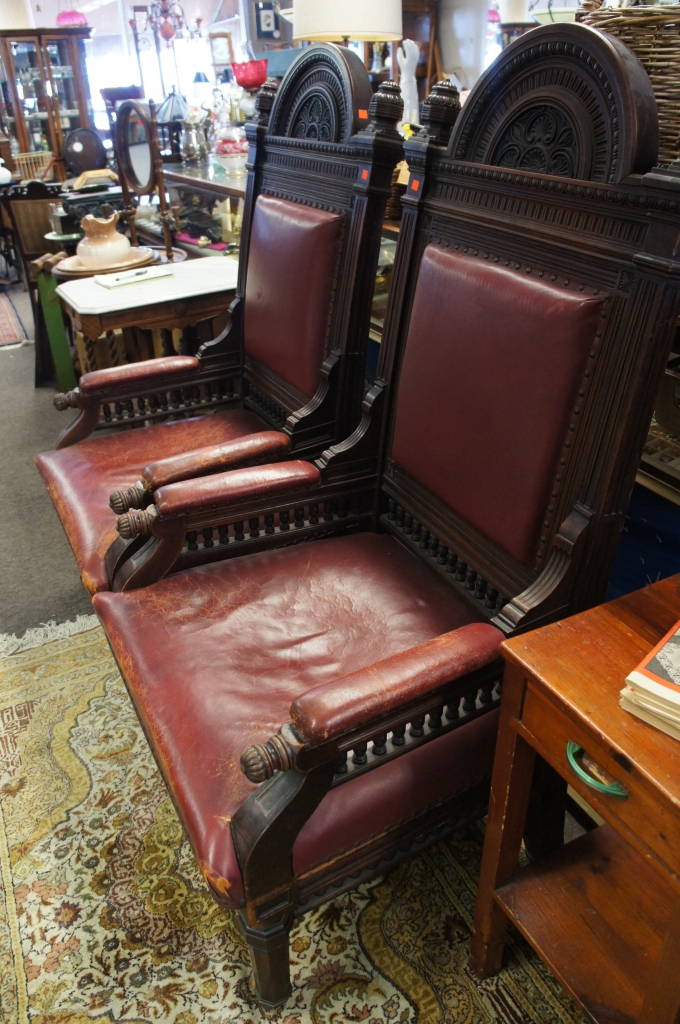 2 Large Throne Chairs Solid Carved Mahogany Brass Castors Pair Original Leather