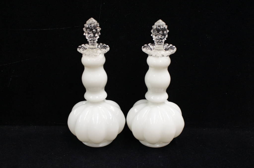 Fenton Melon Milk Glass Vanity Perfume Bottles Powder Box Clear Lids & Ladle