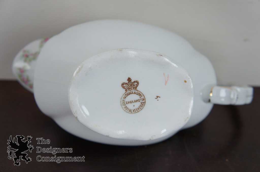 Features fine white china with pink roses and green leaves, has some gold trim as well!