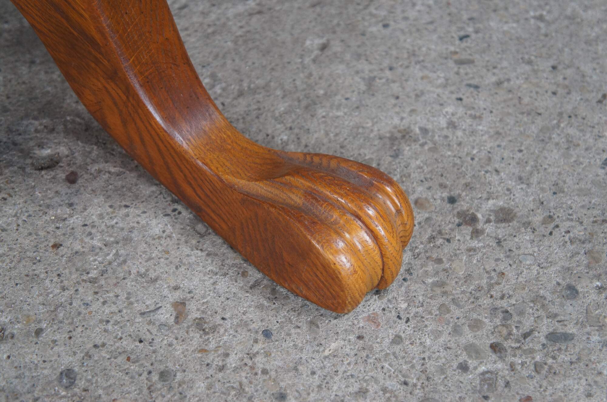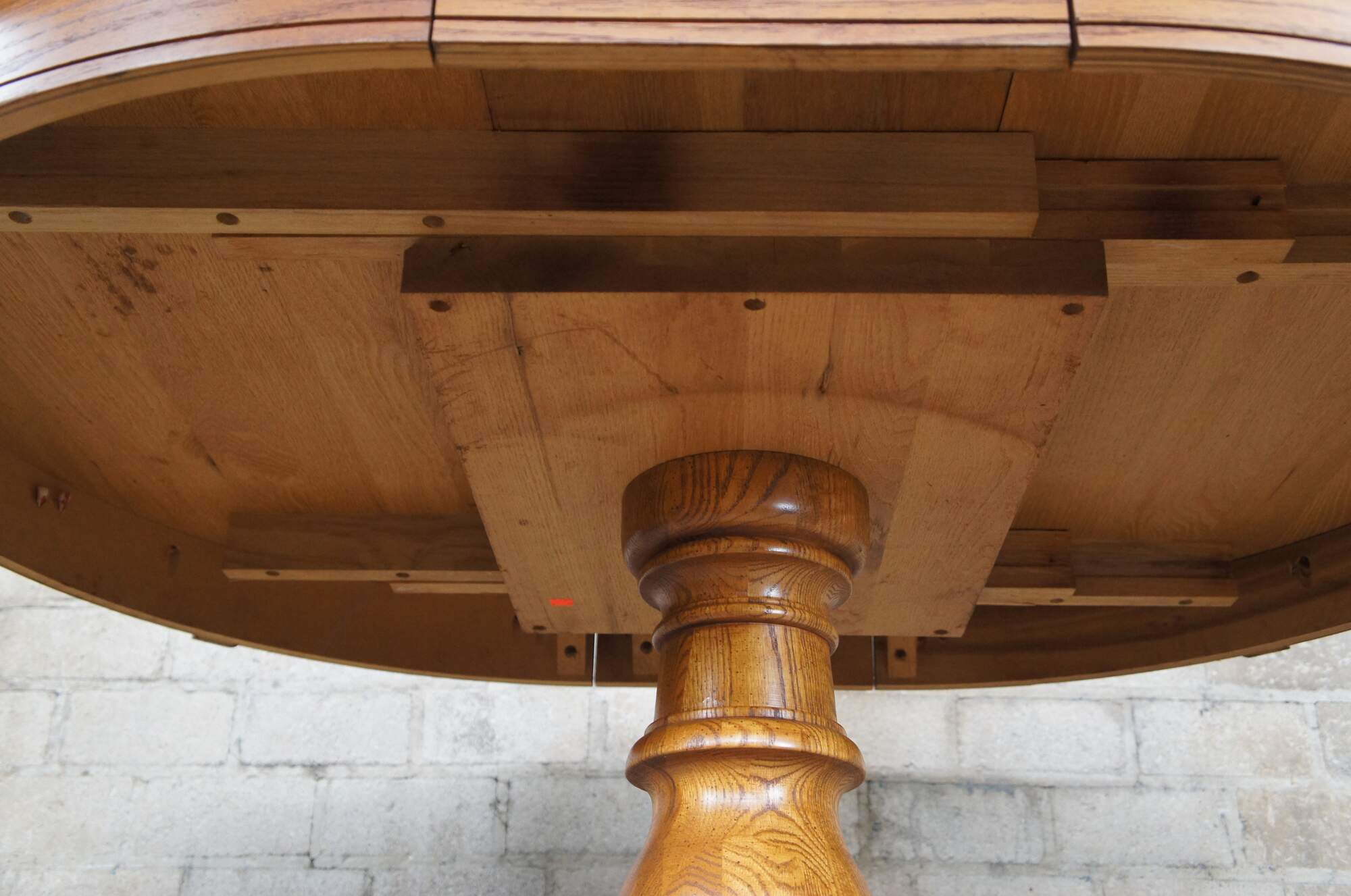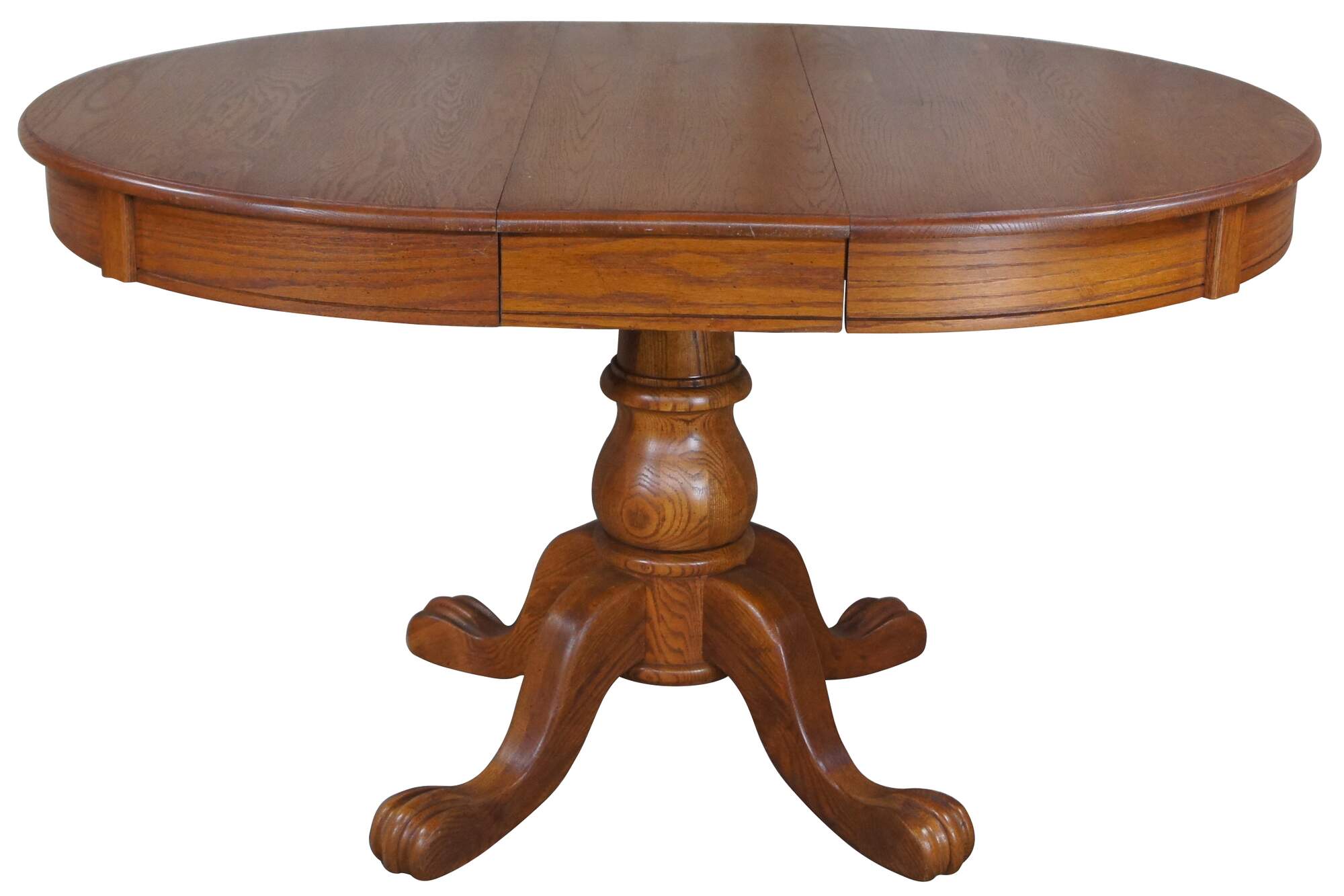 Victorian Revival oak pedestal table, circa 1986. Features a round extendable top over a turned baluster support leading to paw feet.
