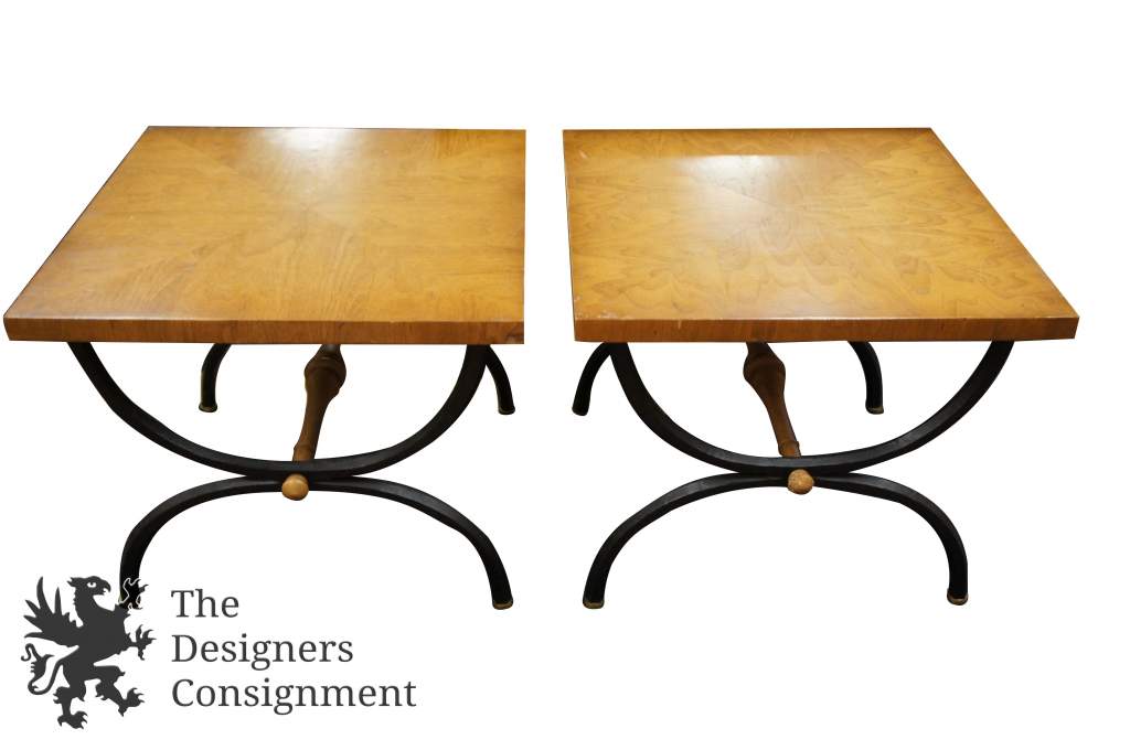 2 Vintage Pavane by Tomlinson Square Wood End Tables Iron Legs Hollywood Regency