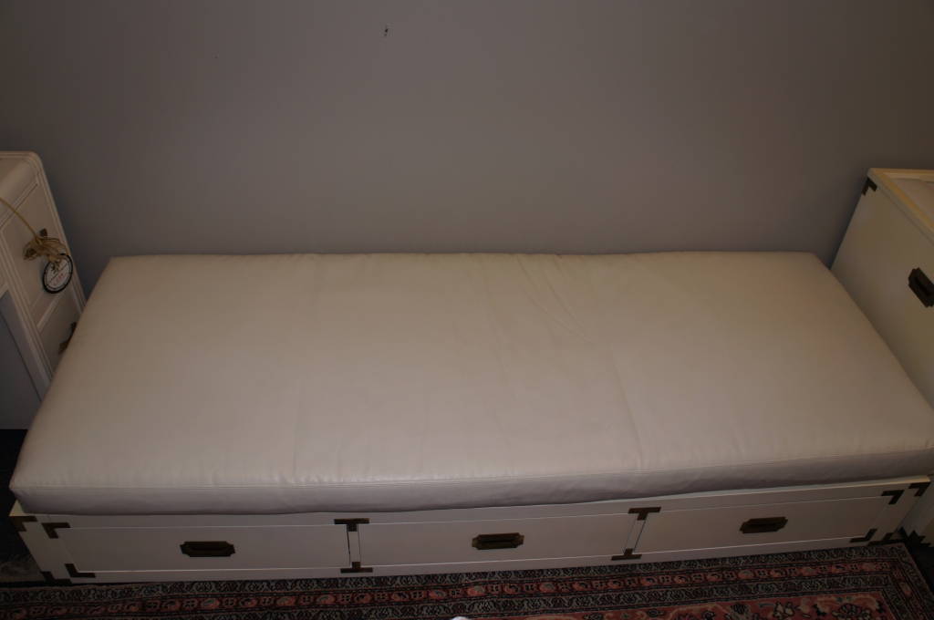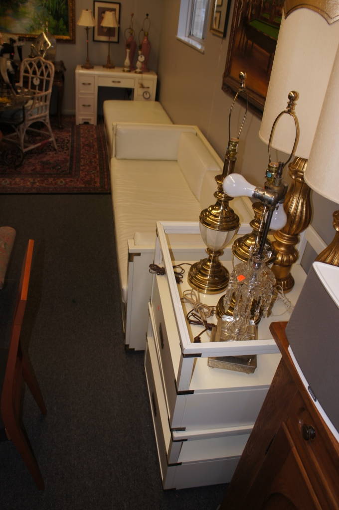 White Campaign Furniture Set Leather Couch Ottoman End tables Brass Drawer Pulls