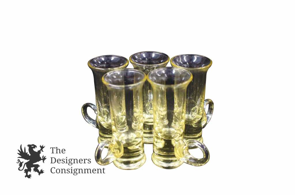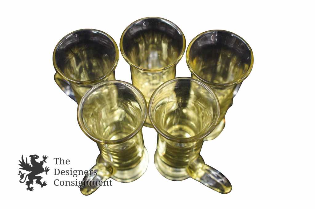 Here is a set of 5 clear yellow glass cordials, maker unknown