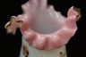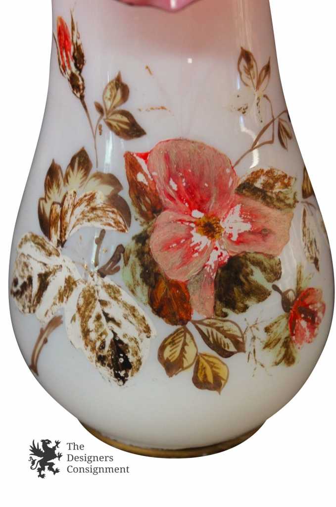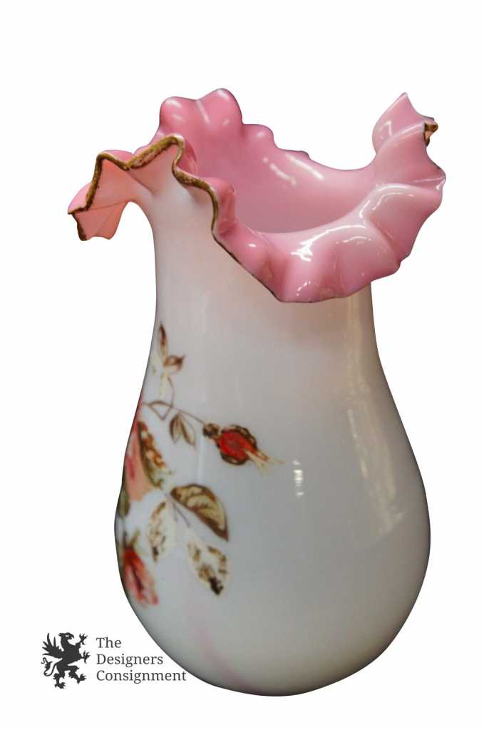 This beautiful vase is made of opalescent glass that fades from pink to white, with hand painted floral accents and golden trim