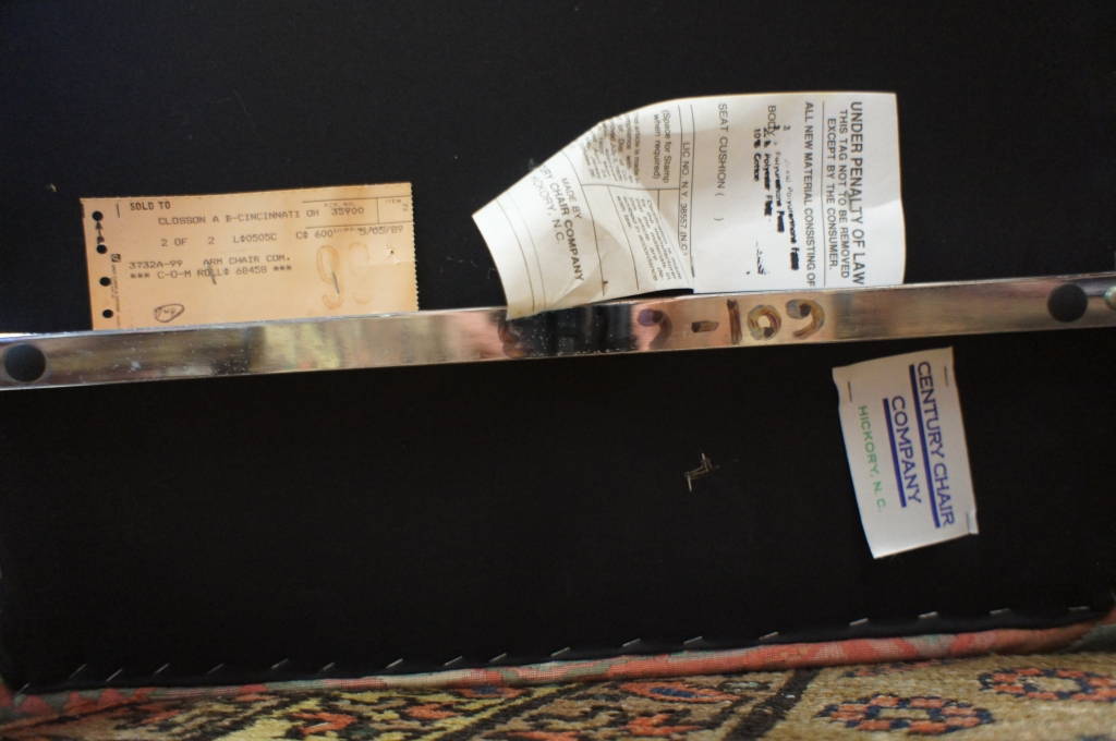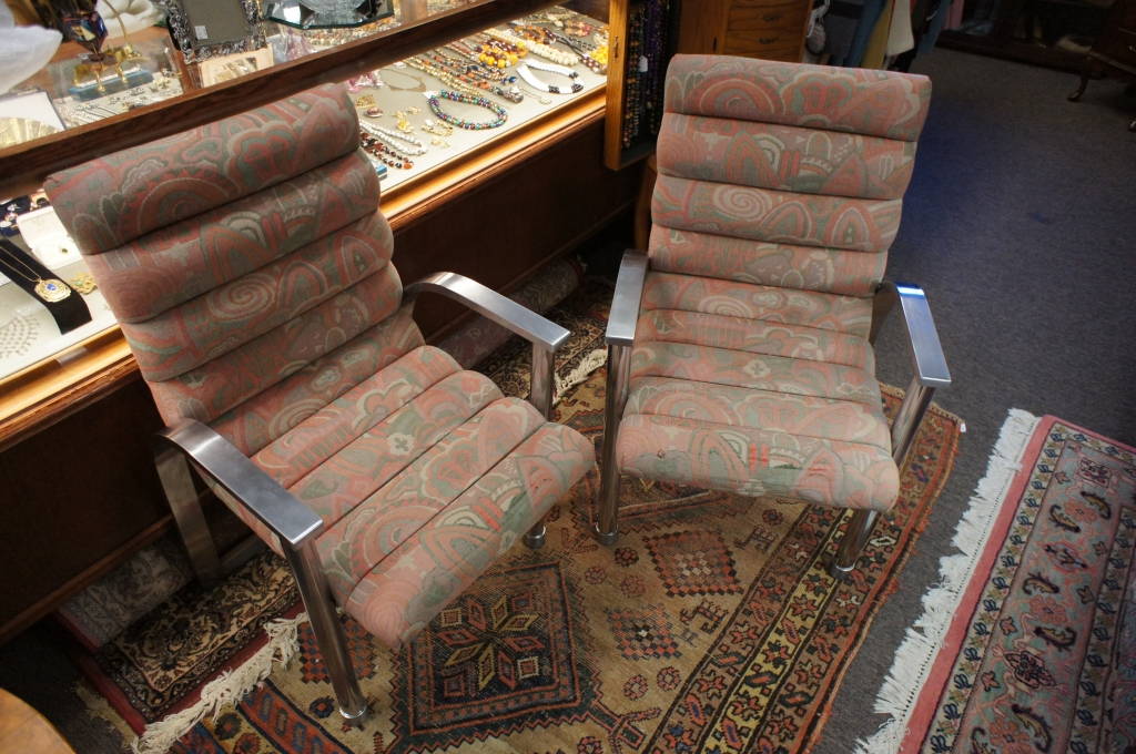 These Eclipse chairs were designed by Jay Spectre, andfeature cushioned upholstery and comfortable chrome arm rests.